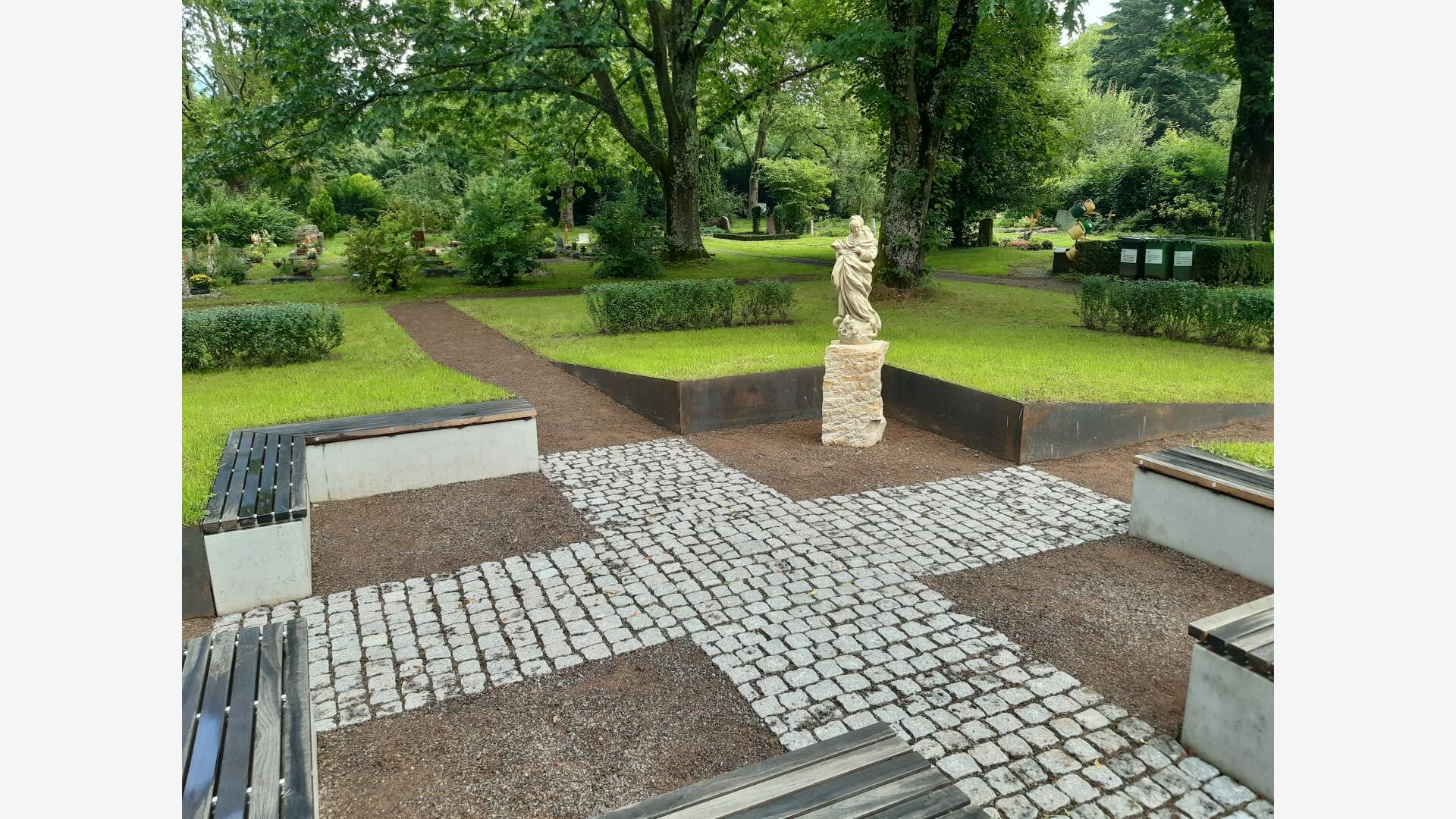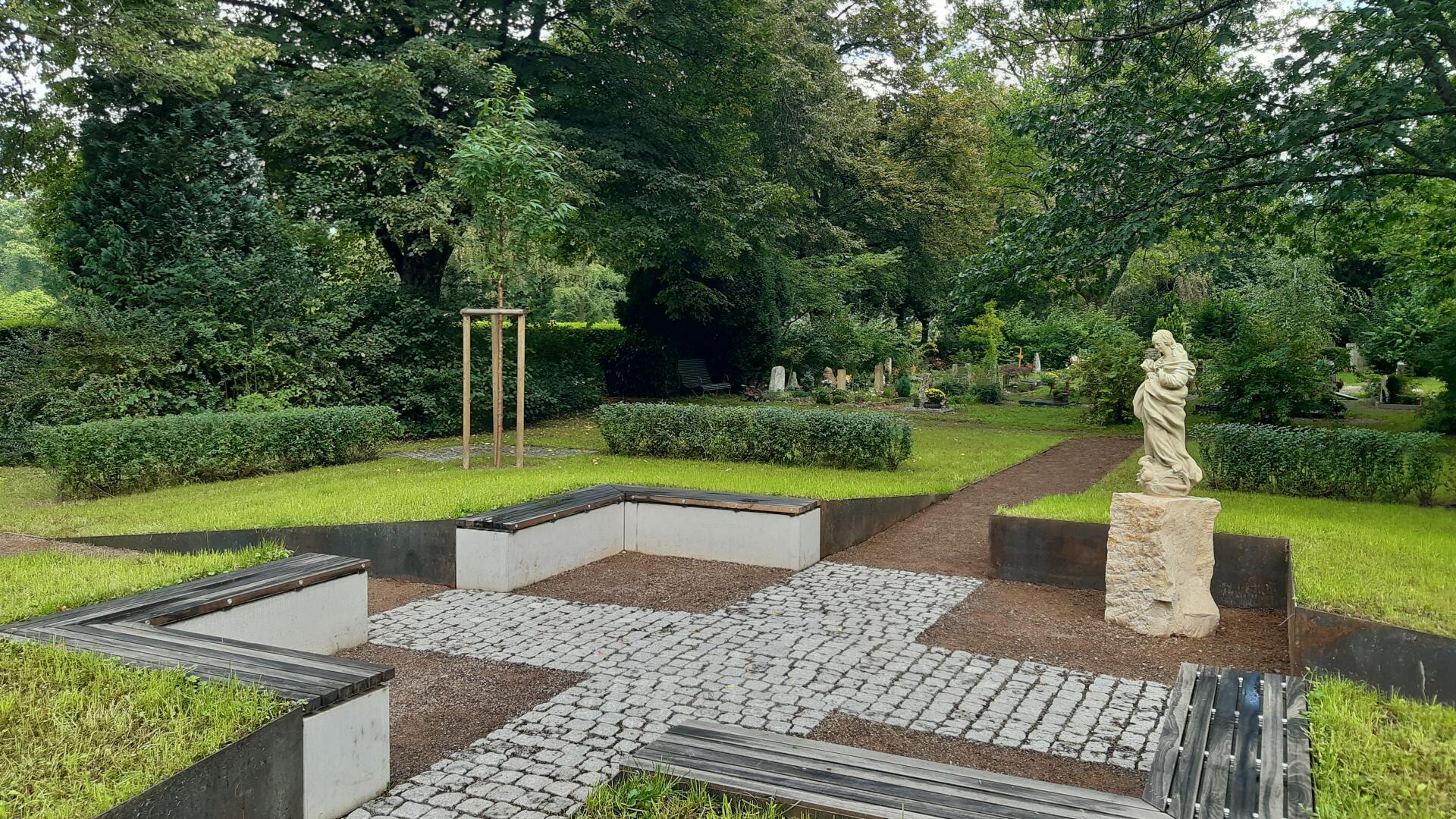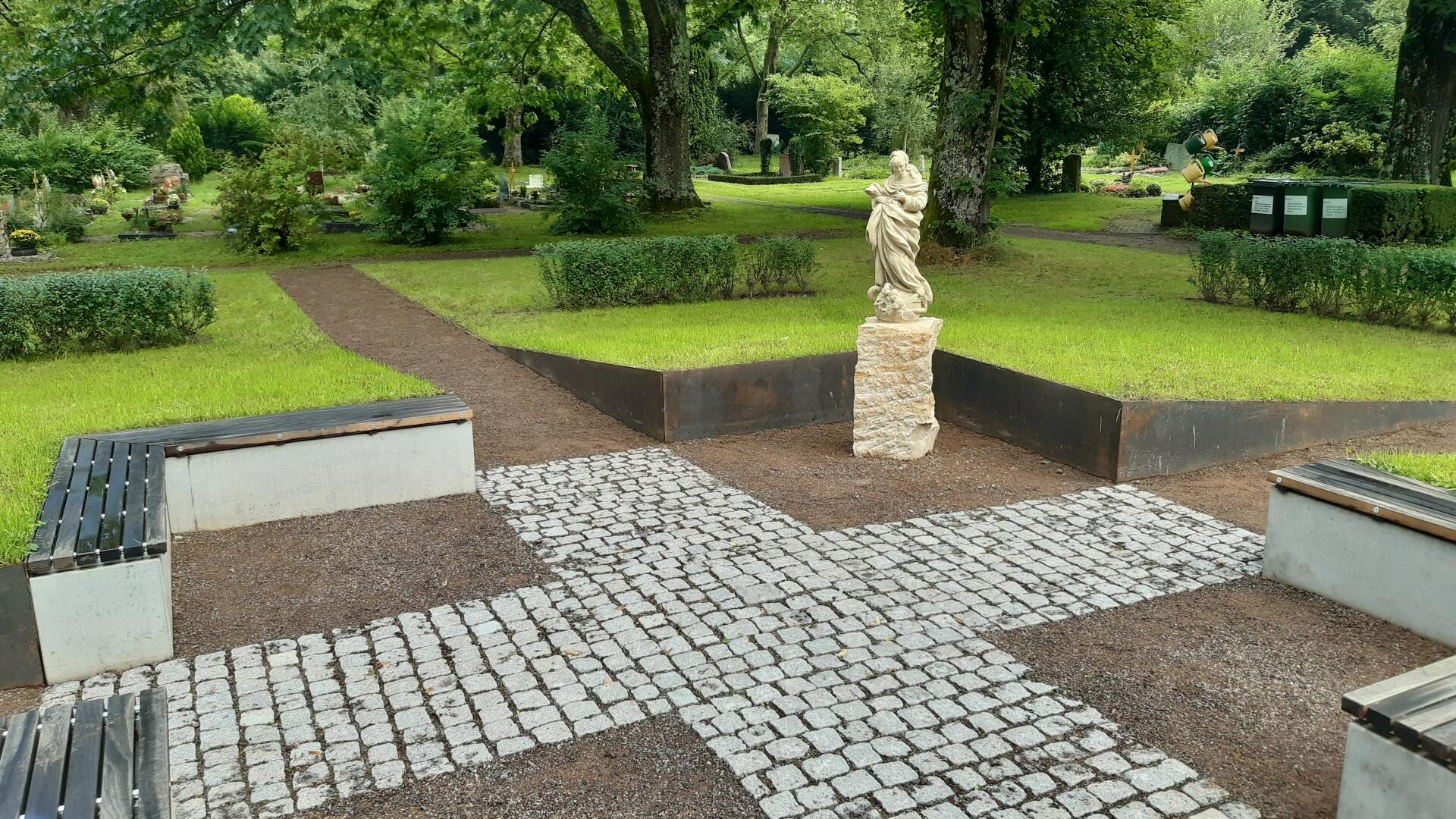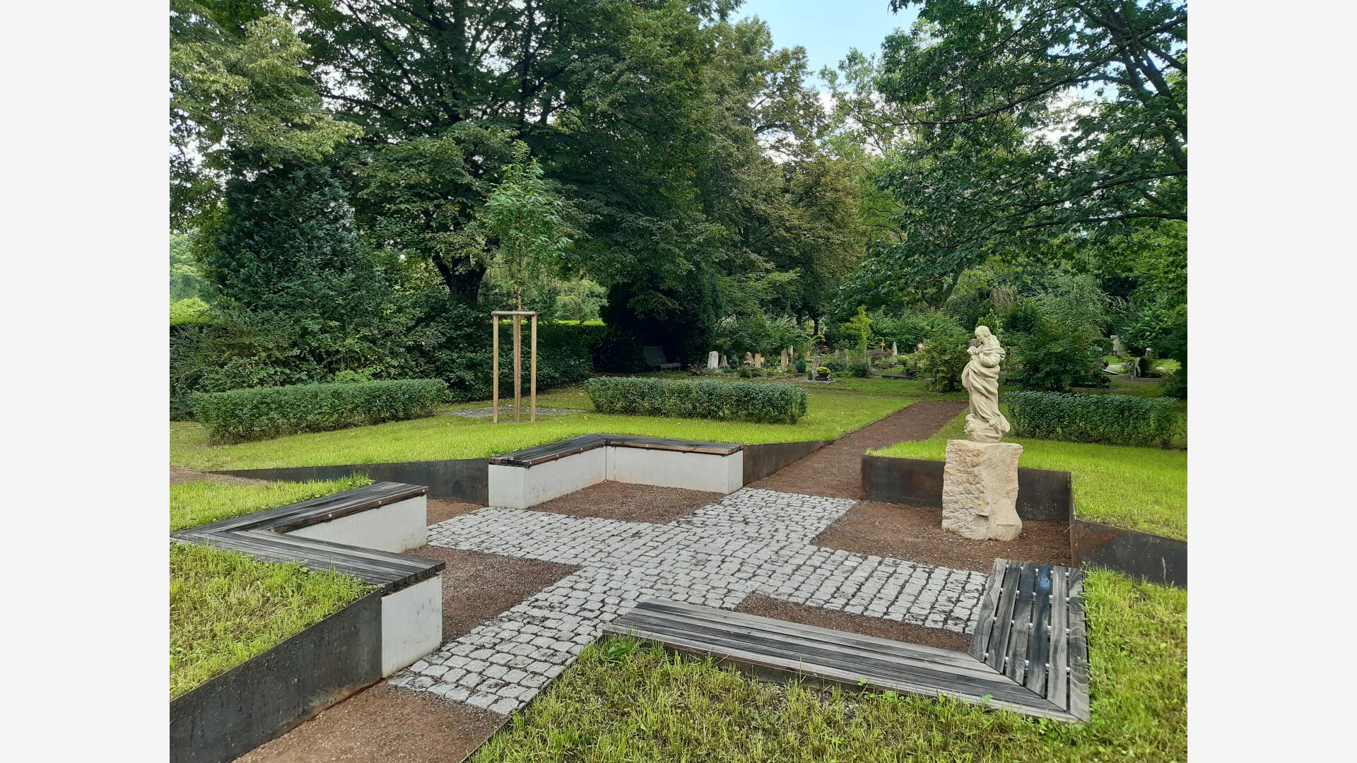 Das Baumurnengrabfeld wird durch zwei sich kreuzende Wege erschlossen. Der Pflasterbelag bildet im Zentrum des Grabfeldes ein Kreuz. Das Zentrum wurde zu einem kleinen Platz aufgeweitet, und mit Sitzblöcken und einer historische Statue möbiliert. Hier kann man Ruhe und Besinnlichkeit finden oder auch kleine Gedenkfeiern abhalten.