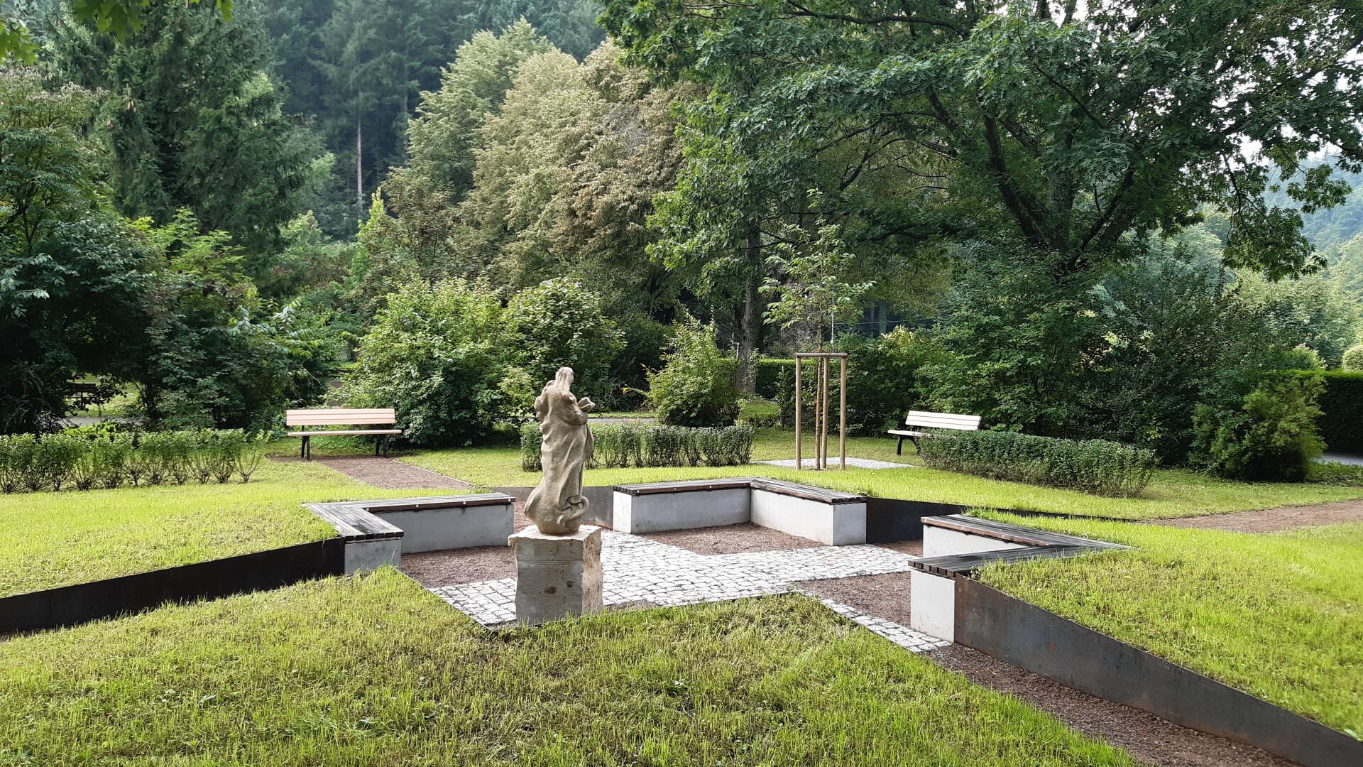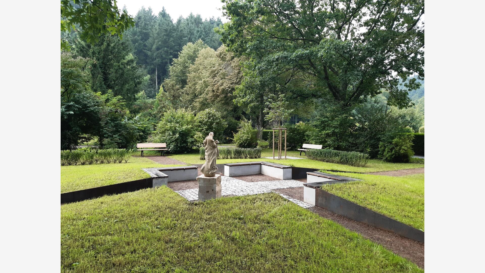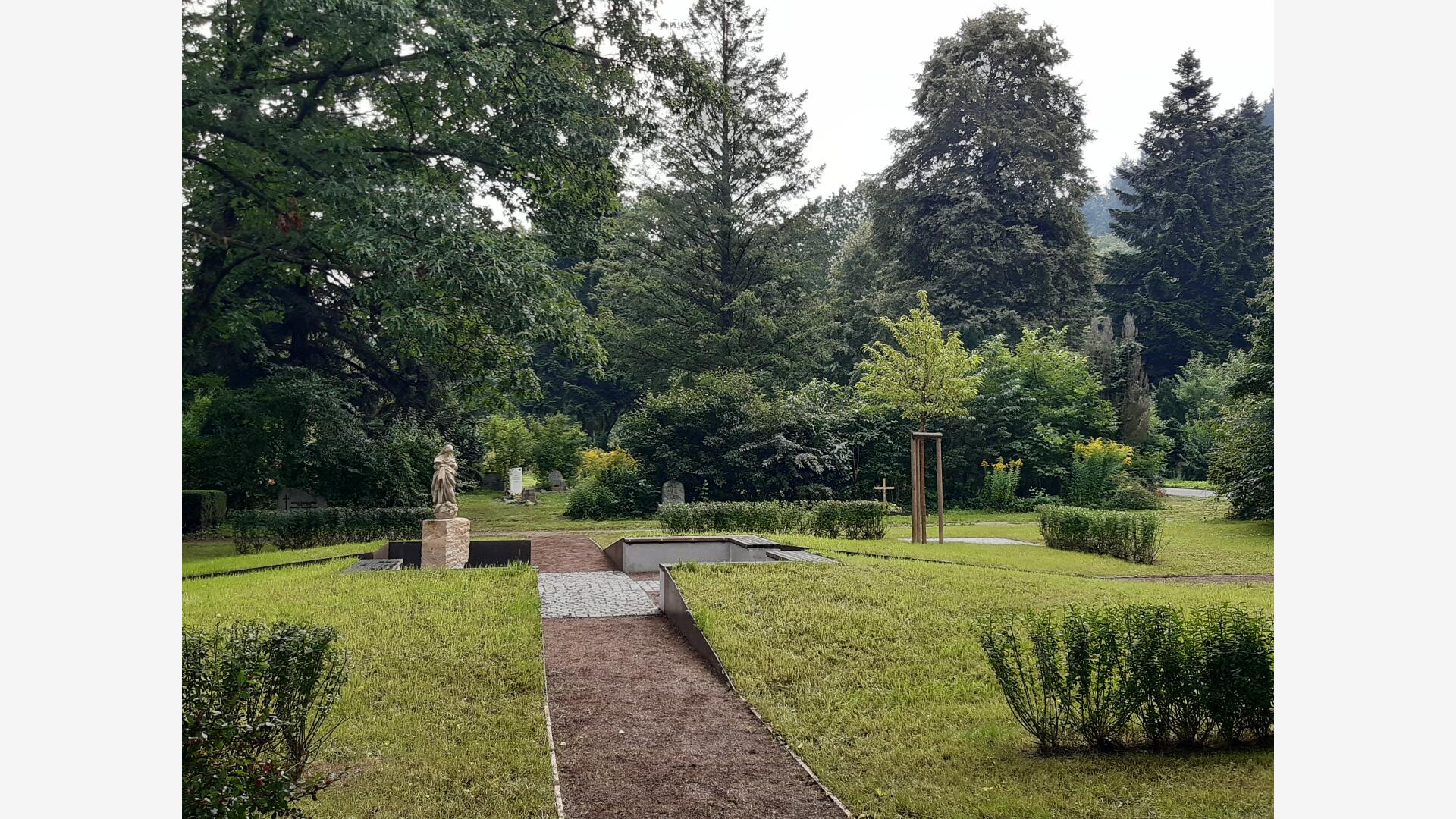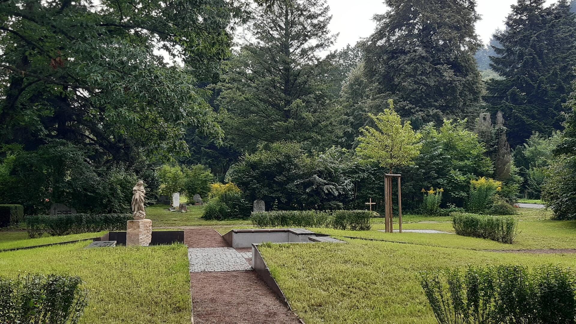 Das Baumurnengrabfeld wird durch zwei sich kreuzende Wege erschlossen. Der Pflasterbelag bildet im Zentrum des Grabfeldes ein Kreuz. Das Zentrum wurde zu einem kleinen Platz aufgeweitet, und mit Sitzblöcken und einer historische Statue möbiliert. Hier kann man Ruhe und Besinnlichkeit finden oder auch kleine Gedenkfeiern abhalten.