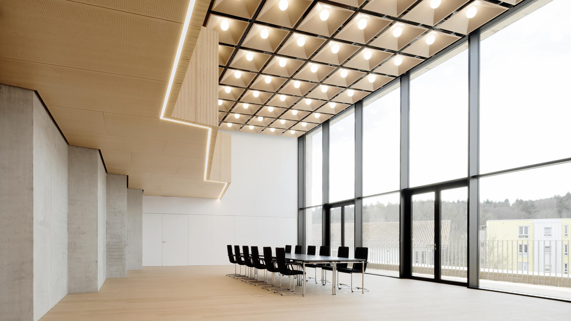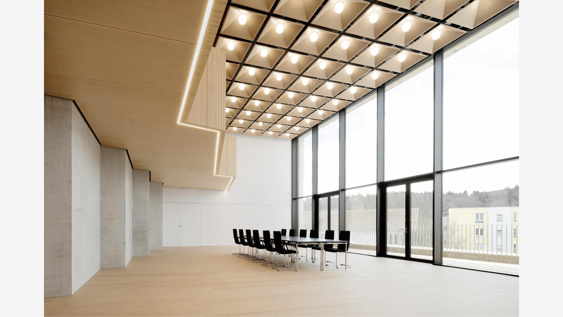 Das neue Rathaus in Remchingen, auf einem exponierten Grundstück zwischen der Bundesstraße B10 und dem Grünraum von Schlossbad und Pfinz gelegen, ist als neue Mitte für Begegnung und Kommunikation konzipiert. Seine direkte Nachbarschaft wird geprägt von der Remchinger Kulturhalle und dem Altenpflegeheim, die als eigenständige, auf sich selbst bezogene Solitäre keine stadträumliche Beziehung zueinander aufbauen.