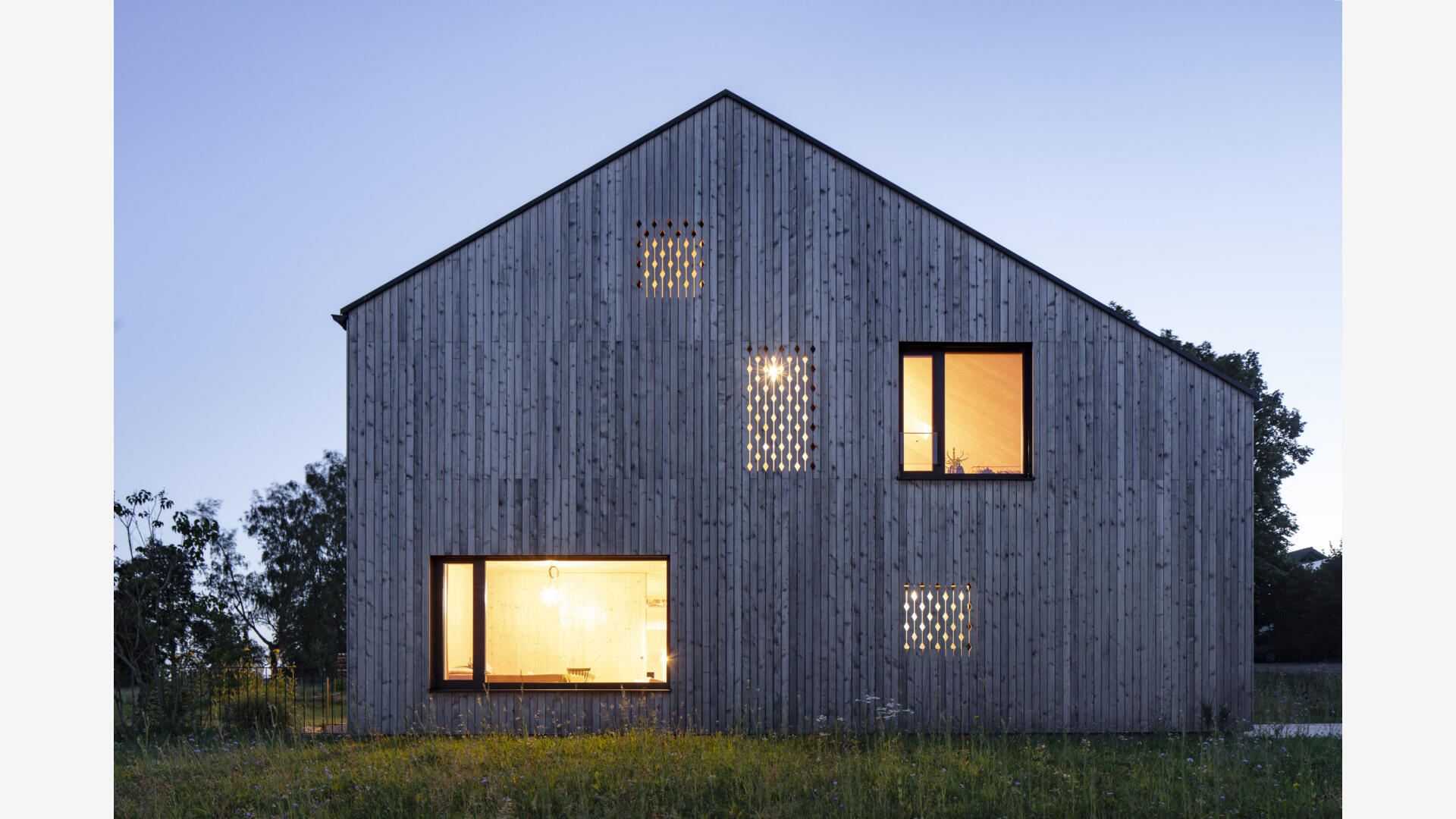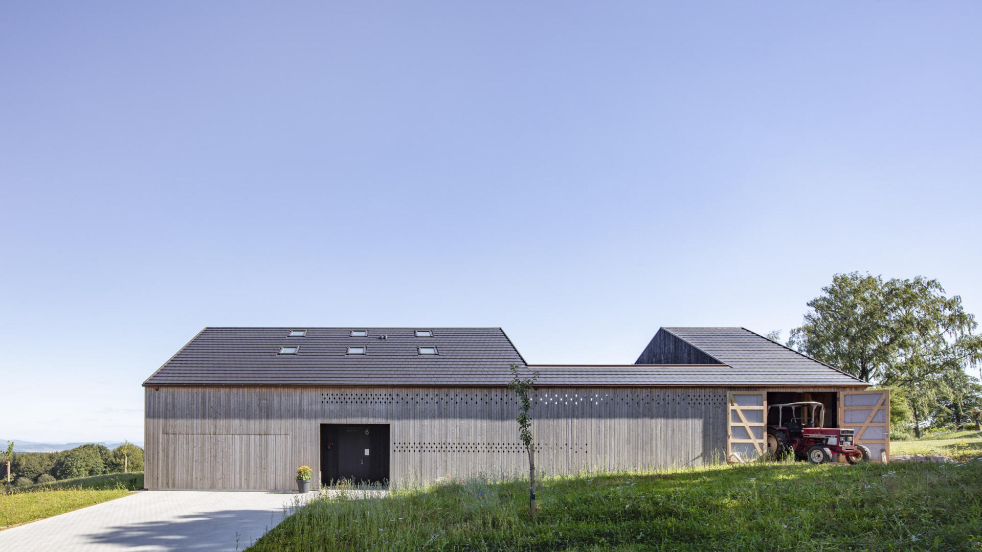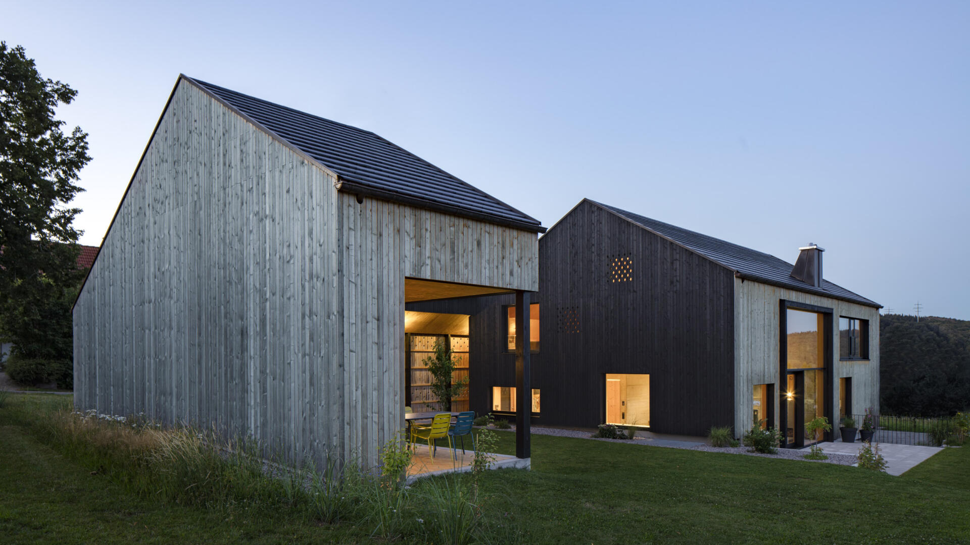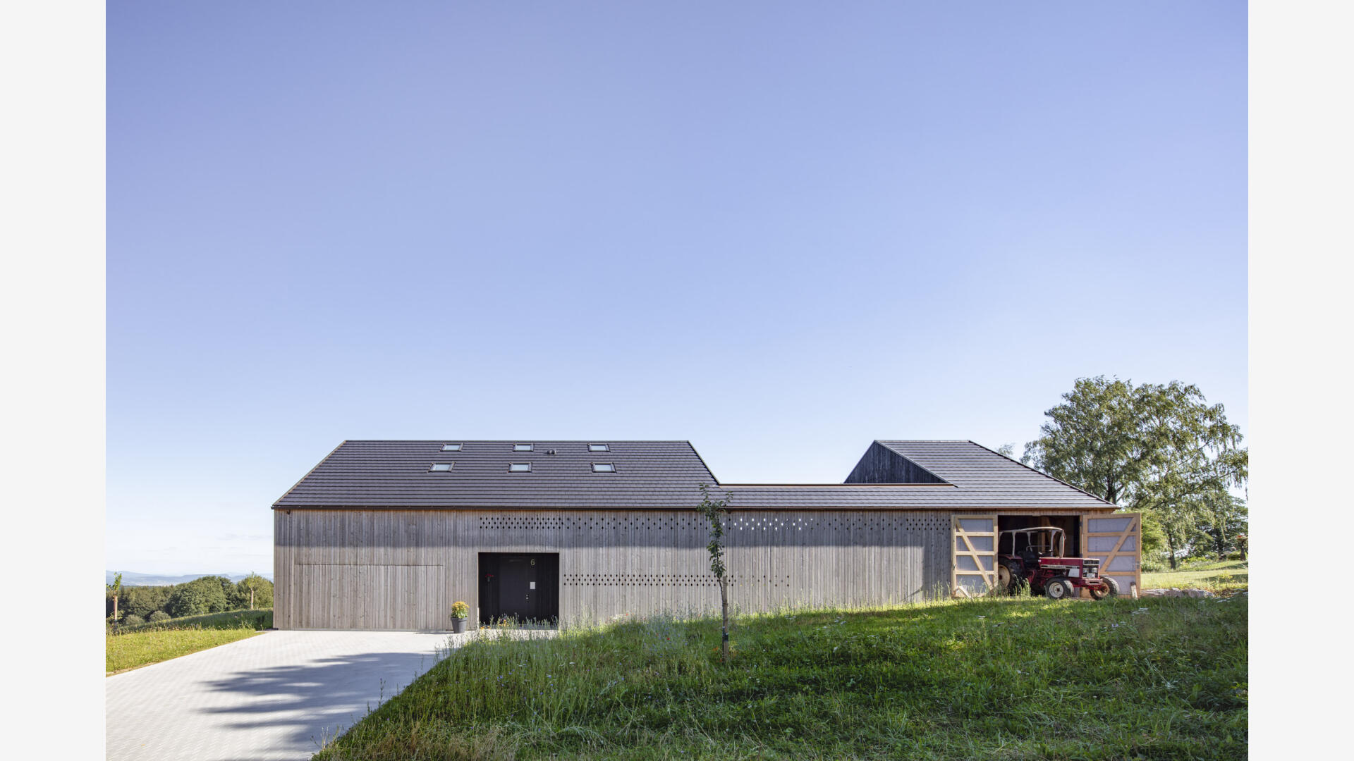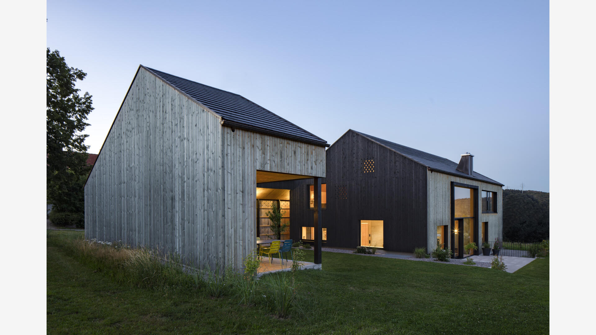Hofhaus in einem kleinen Weiler im Hotzenwald. Ein Stahlbetonkern als Speichermasse wird von einem Massivholzbau (Brettsperrholzelemente) umhüllt. Alle Oberflächen sind roh belassen. Schlichter Baukörper mit großen Öffnungen zur Südseite und dem Bergpanorama. Er bettet sich ein in Blumenwiese und Obstbaumfelder. Das Wohnhaus und der Lagerschuppen mit Freisitz bilden zusammen mit dem Laubengang einen Innenhof aus. Der offen Grundriss im Erdgeschoss entwickelt sich über einen Luftraum ins Obergeschoss. Die Galerie und der Arbeitsbereich sind ebenfalls offen gestaltet. Von dort gelangt man über einen Steg zu den Privaträumen. Die Fassade ist schlicht gehalten, einziges Gestaltungsmittel sind schwarze Ausschnitte und rautenförmige Zierschnitte.