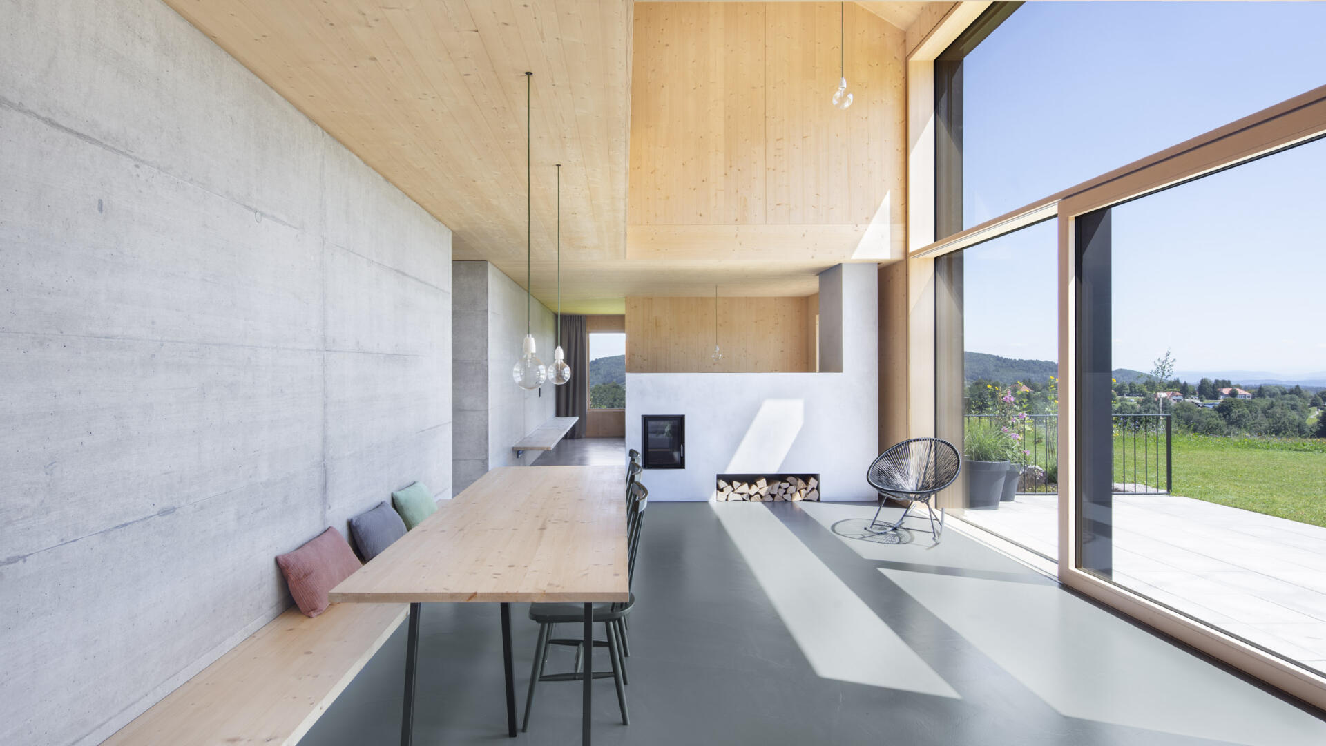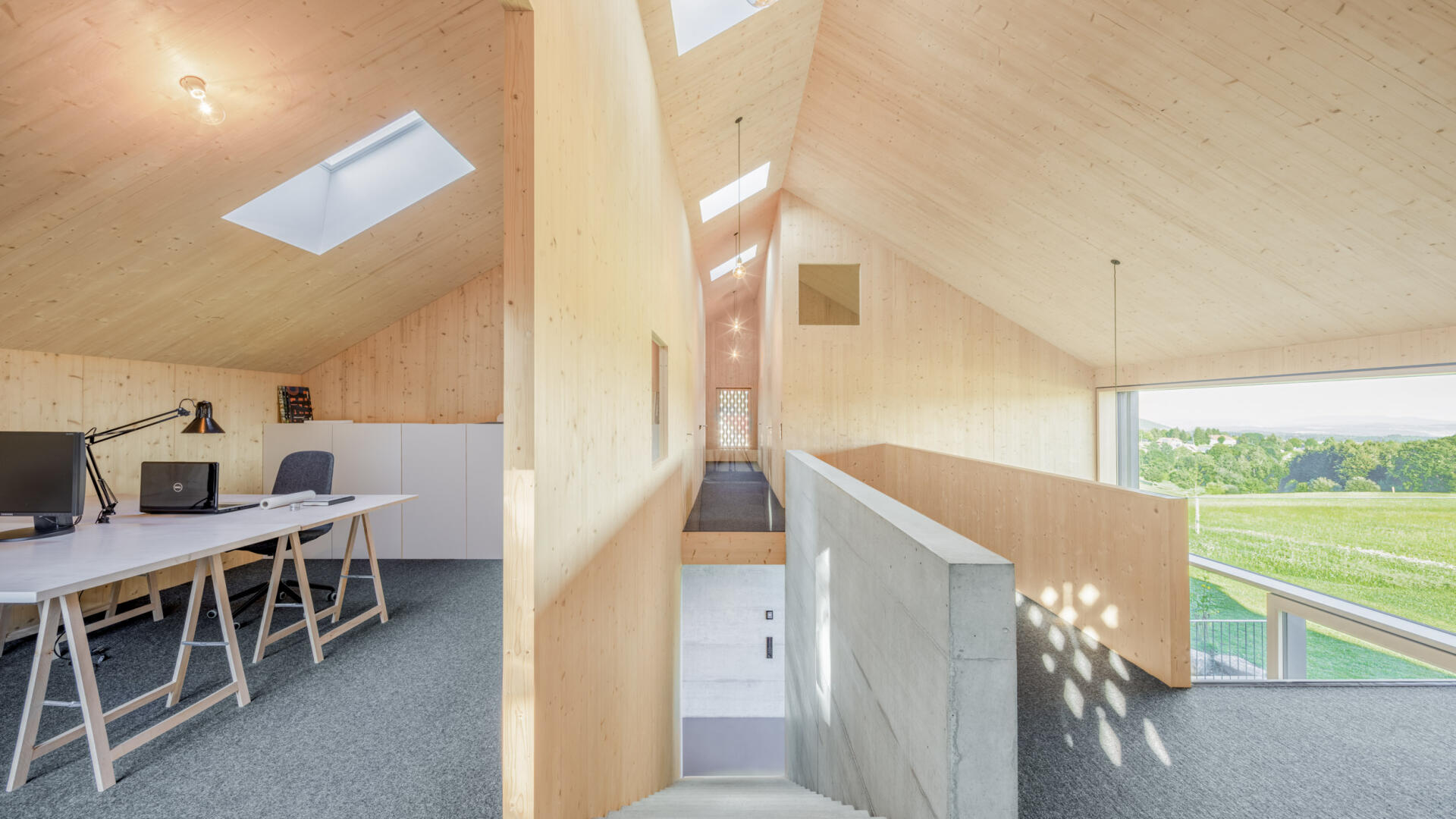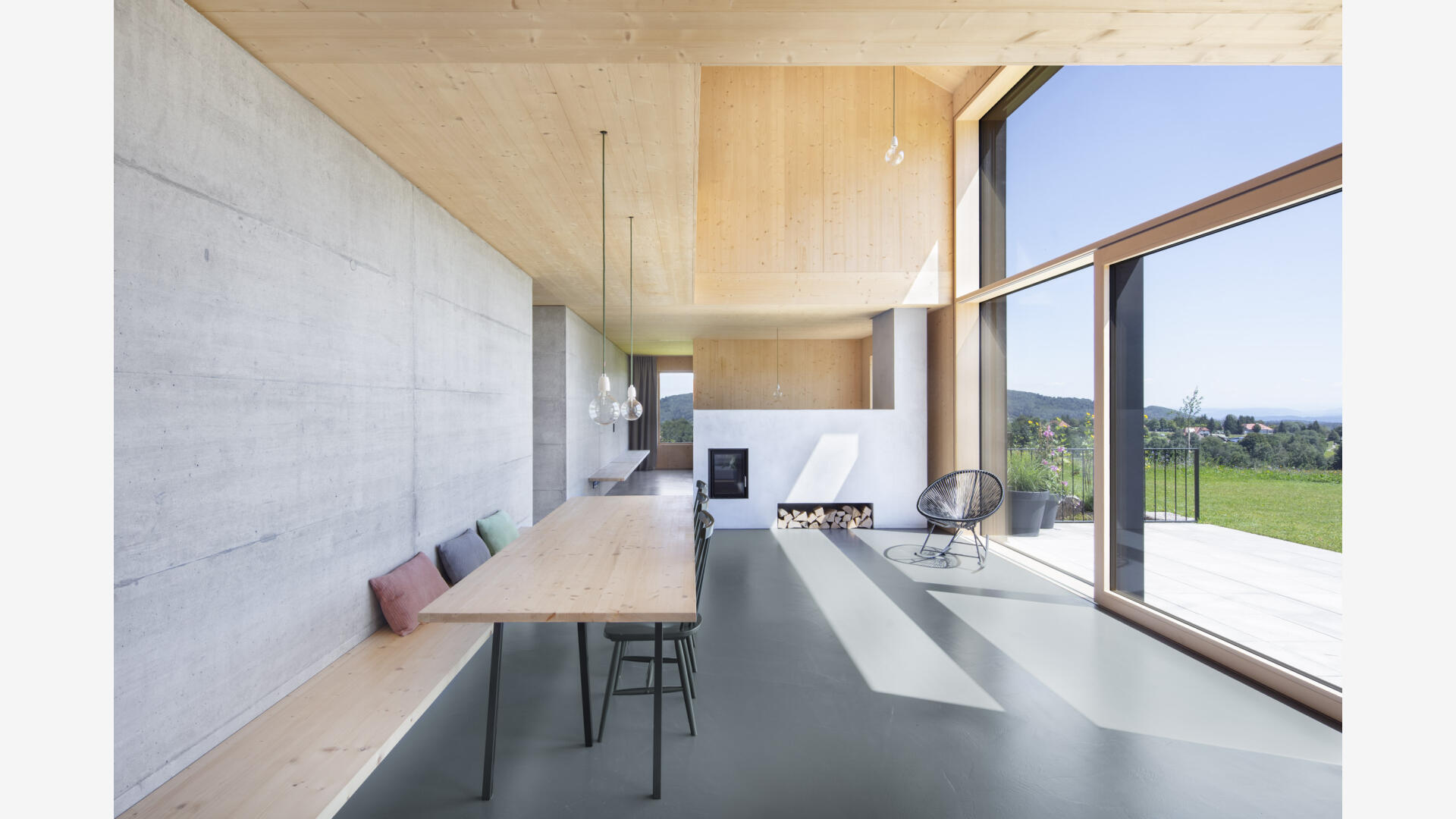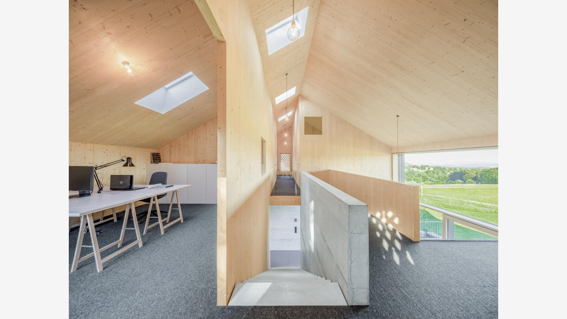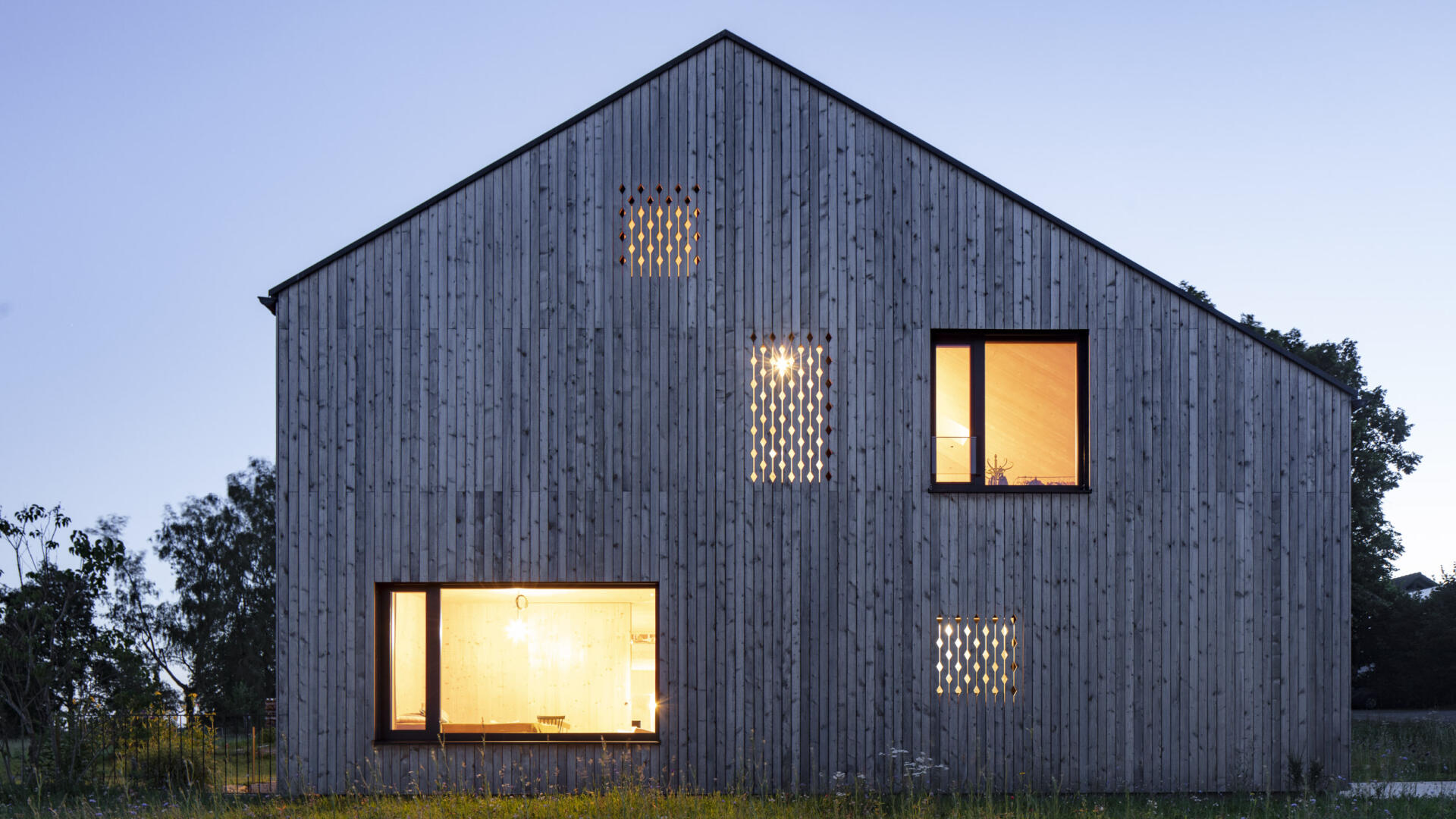 Hofhaus in einem kleinen Weiler im Hotzenwald. Ein Stahlbetonkern als Speichermasse wird von einem Massivholzbau (Brettsperrholzelemente) umhüllt. Alle Oberflächen sind roh belassen. Schlichter Baukörper mit großen Öffnungen zur Südseite und dem Bergpanorama. Er bettet sich ein in Blumenwiese und Obstbaumfelder. Das Wohnhaus und der Lagerschuppen mit Freisitz bilden zusammen mit dem Laubengang einen Innenhof aus. Der offen Grundriss im Erdgeschoss entwickelt sich über einen Luftraum ins Obergeschoss. Die Galerie und der Arbeitsbereich sind ebenfalls offen gestaltet. Von dort gelangt man über einen Steg zu den Privaträumen. Die Fassade ist schlicht gehalten, einziges Gestaltungsmittel sind schwarze Ausschnitte und rautenförmige Zierschnitte.