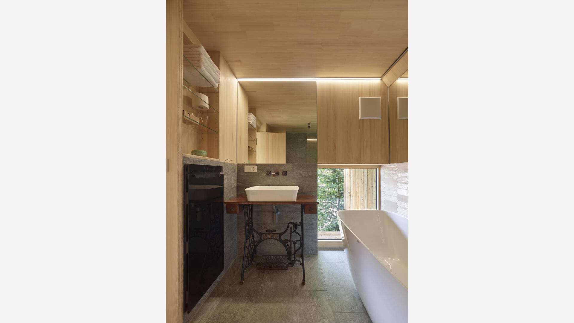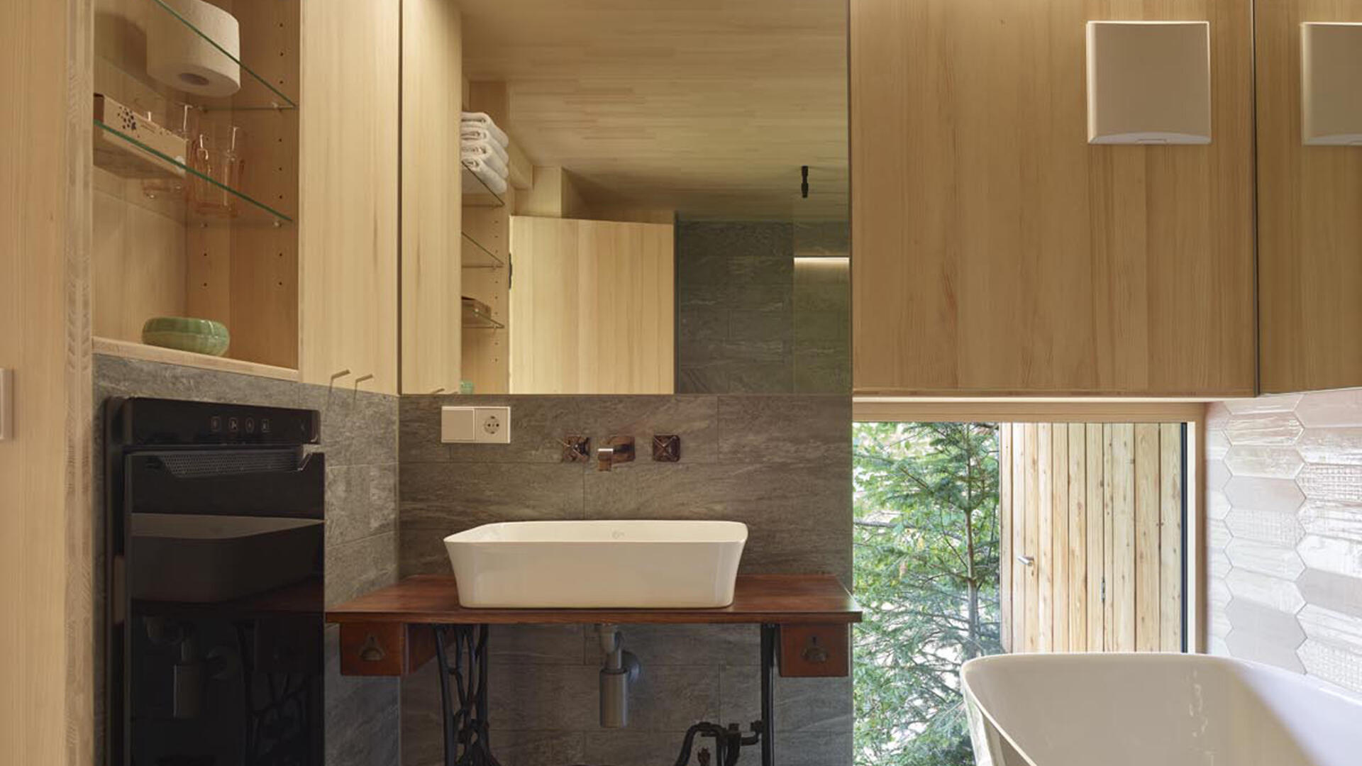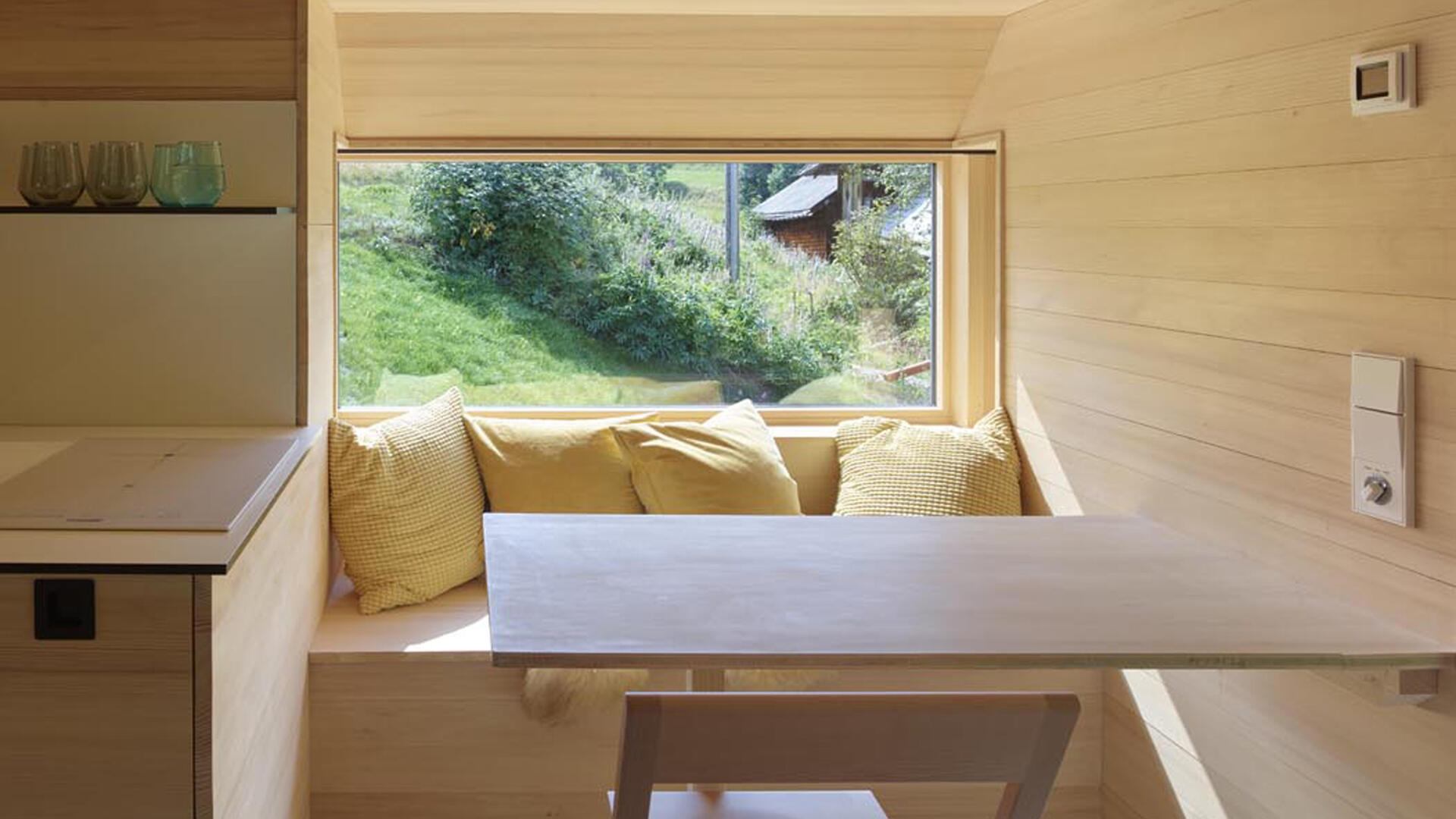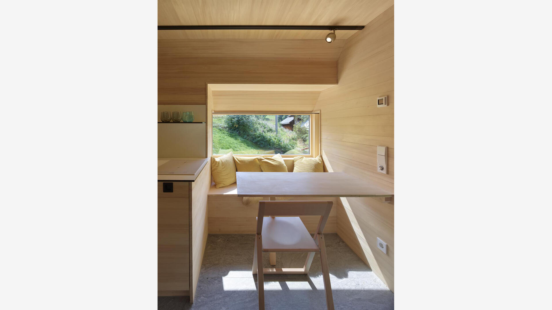 Im Inneren wurde das Gebäude komplett gedämmt (KfW 85 Standard) und mit einer heimischen Weißtannenverkleidung versehen. Das Haus wird beheizt über einen Solarlüfter und kann zusätzlich über einen Kaminofen mit Holz befeuert werden.