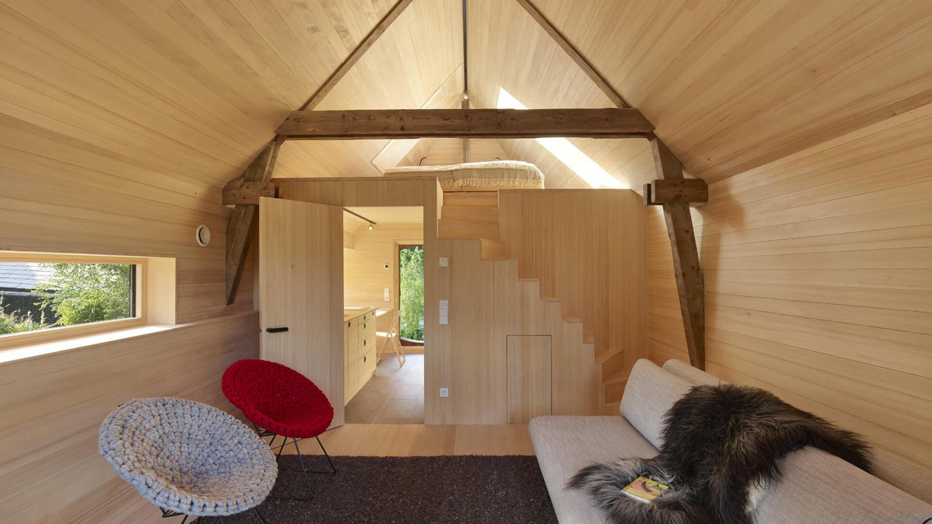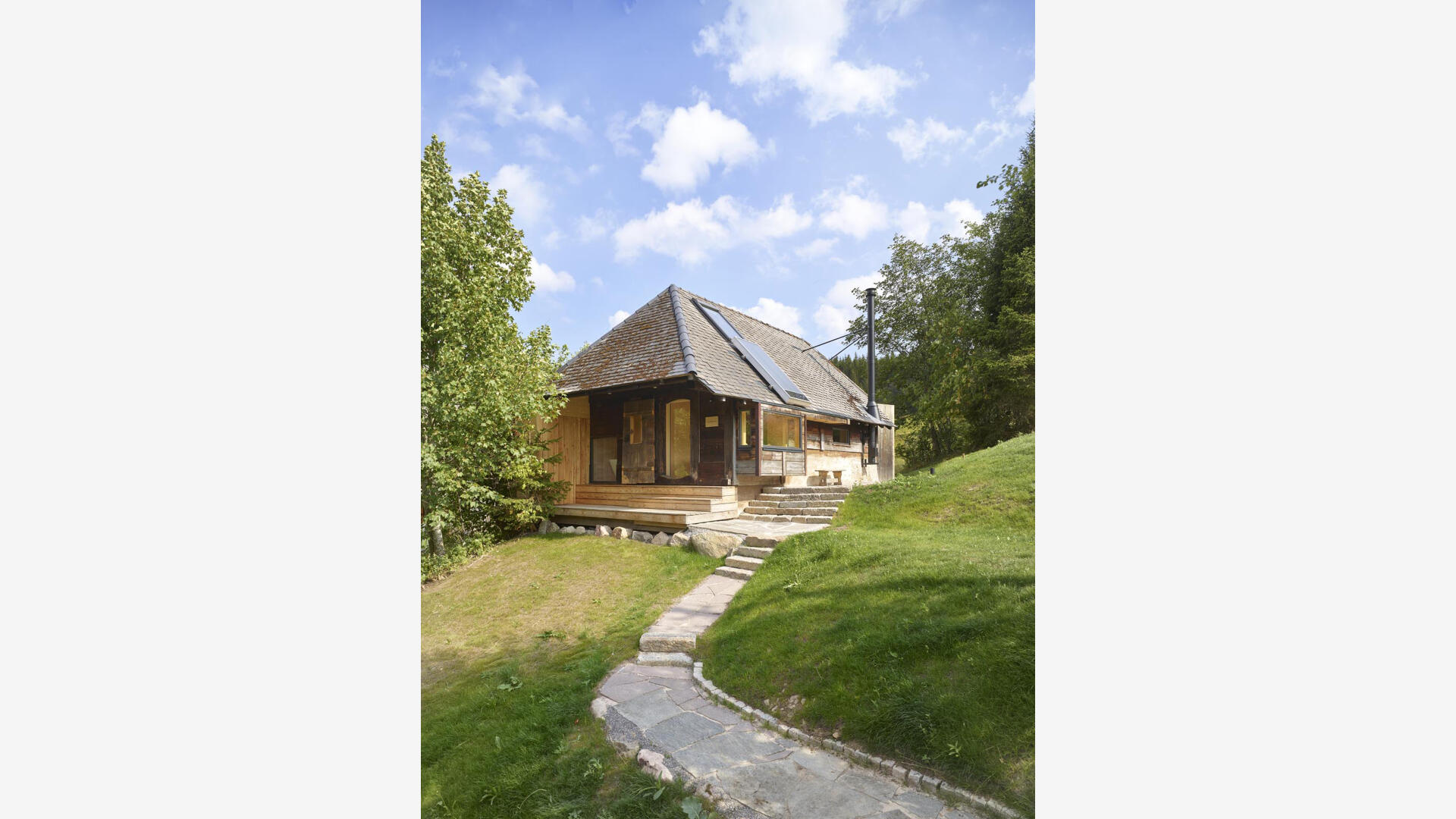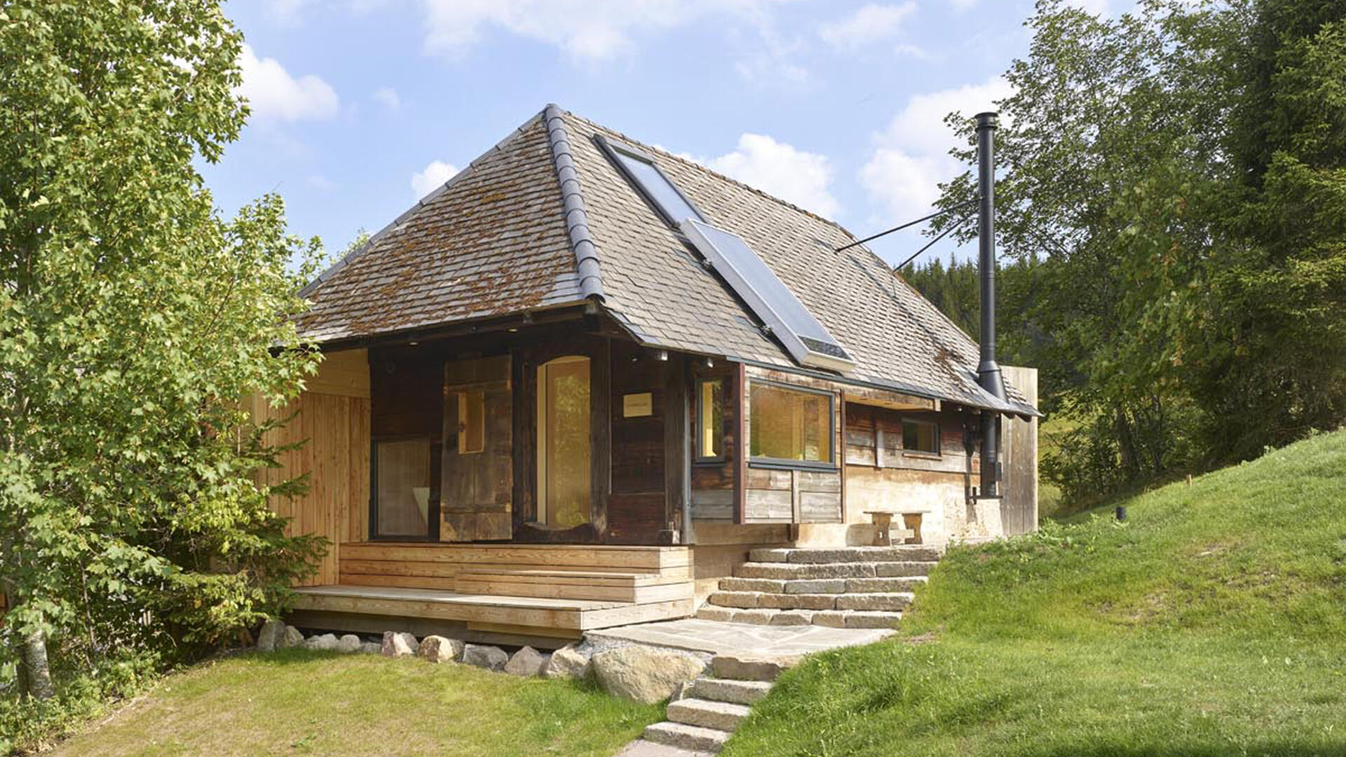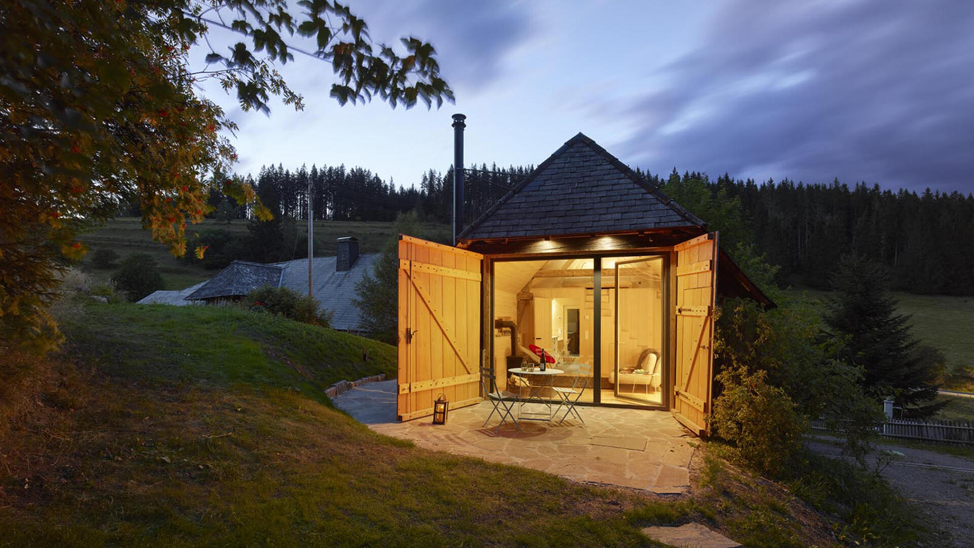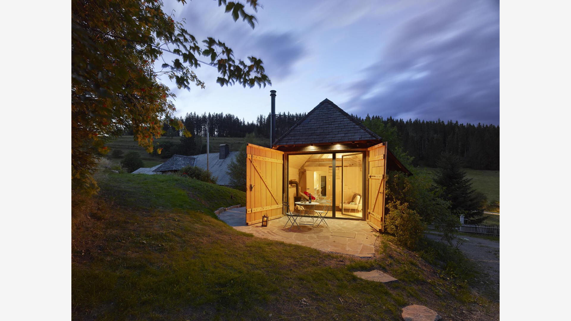 Im Hochschwarzwald wurde auf 1000m Höhe ein bestehender Holzschuppen in ein kleines Einfamilienhaus (Tinyhouse) umgebaut, der Teil eines denkmalgeschützten Bauernhofs von 1659 ist. Dabei blieb die äußere Hülle inkl. der Dacheindeckung erhalten. Nur wenige Eingriffe, wie die Erker in der Fassade, lassen von außen erkennen, dass hier ein Umbau stattgefunden hat. Die bereits vorhandenen Öffnungen, das große Scheunentor sowie die talseitige Holztür, dienen nun als Läden für die neuen großzügigen Festverglasungen mit Glastüren.