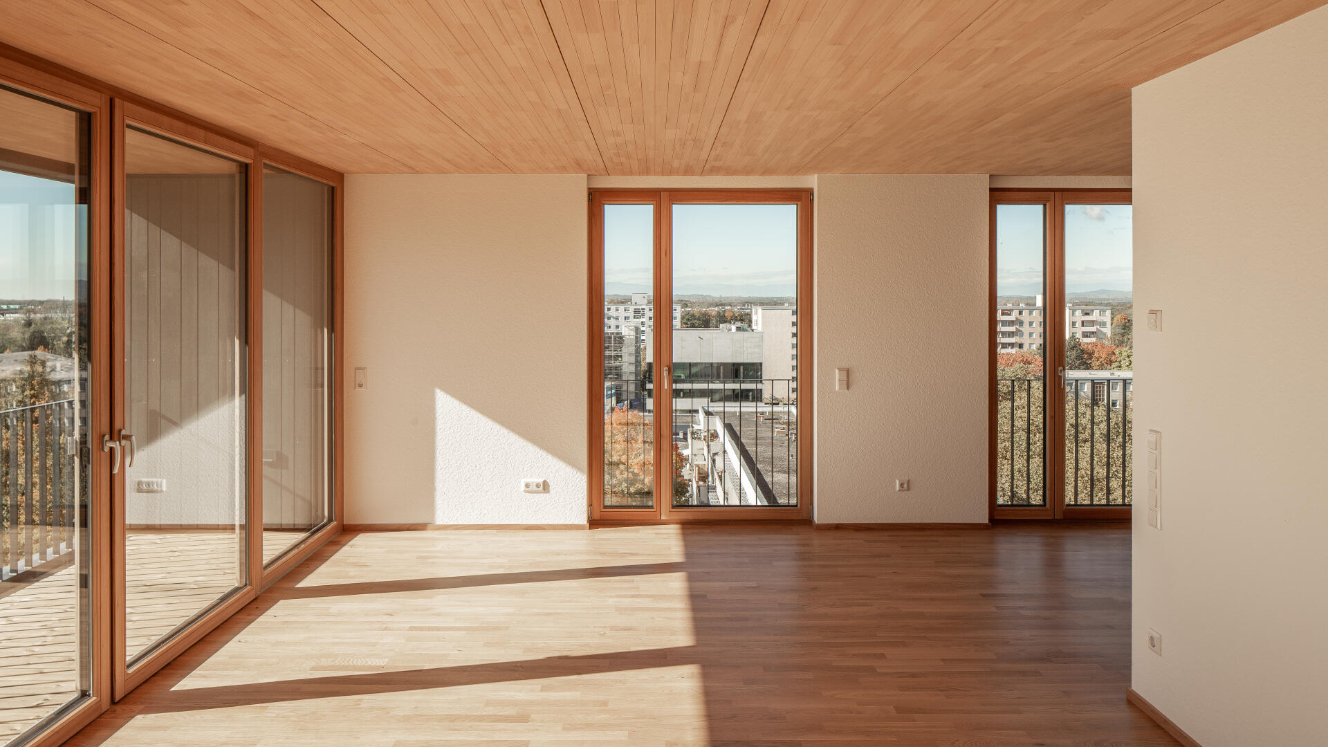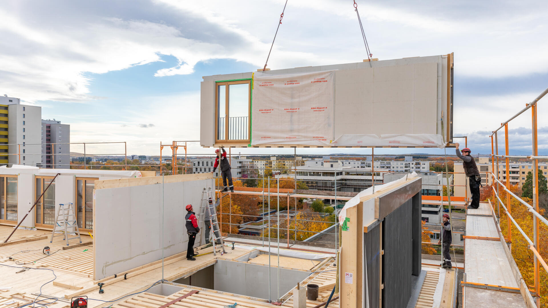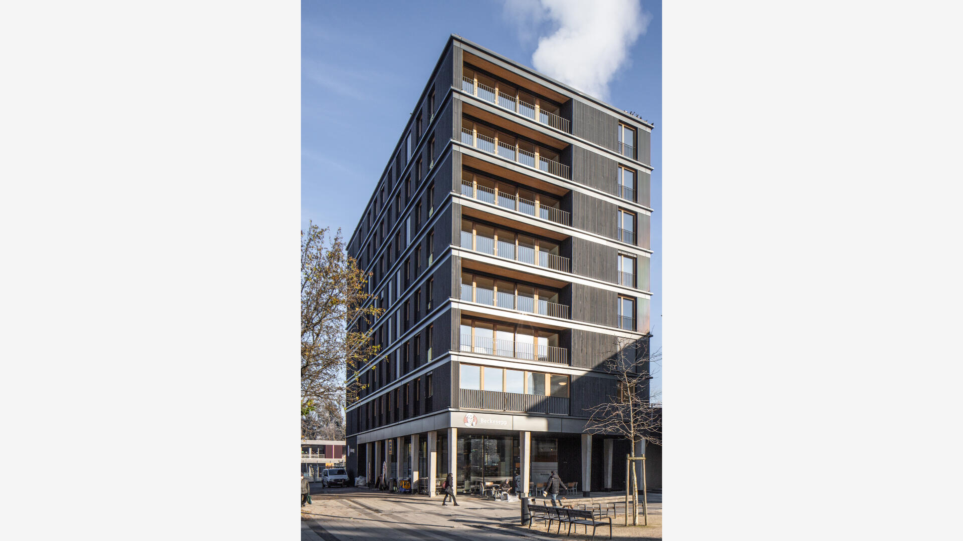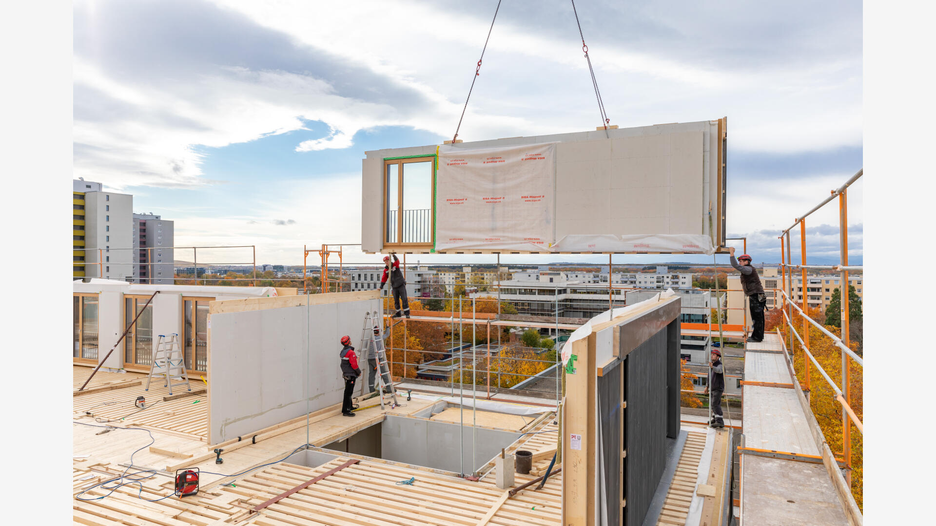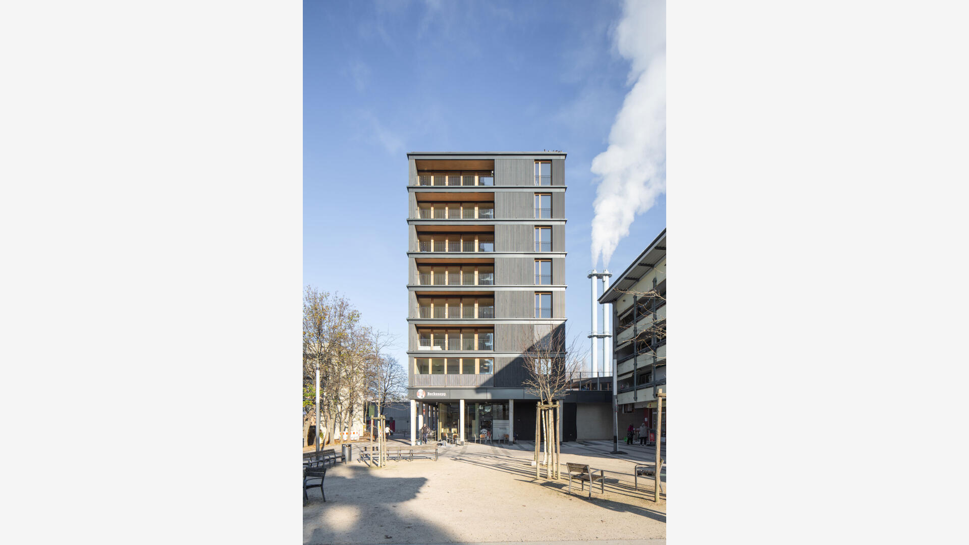 Die ‚Neue Mitte‘ um den Else-Liefmann-Platz ist ein wichtiger Baustein zur umfassenden Sanierung und Aufwertung des Stadtbereichs Weingarten-West im Rahmen des Bund-Länder-Förderprogramms ‚Soziale Stadt‘. An die Stelle eines eingeschossigen Supermarktes tritt ein 8-geschossiger Baukörper in dem ein neuer Supermarkt im EG, eine KiTa im 1. OG und Wohnungen in den Geschossen 2-7 untergebracht sind. Einmalig sind die 7 Geschosse in Holz-Element-Bauweise, inklusive des Aufzugschachtes und den Treppenhäusern. Mit Holz aus heimischer Forstwirtschaft ist das Gebäude Deutschlands erster FSC-zertifizierter Holzbau, außerdem konnte der Ressourcenverbrauch durch die Holzrahmenbauweise (statt Holz-Massivbau) um 44% gesenkt werden. Der Aufbau eines Geschosses, inkl. Decken benötigte nur ca. 1 Woche.