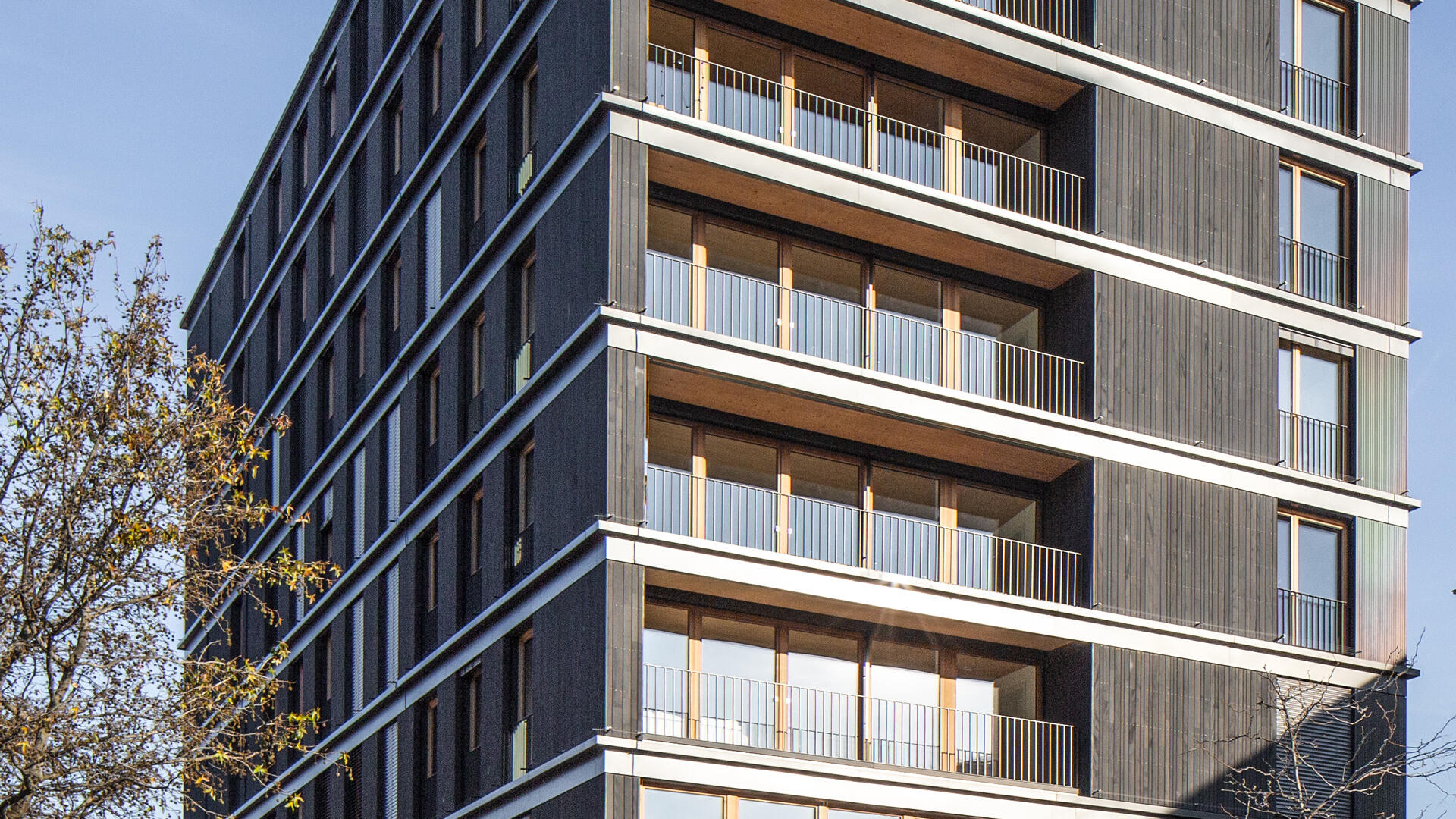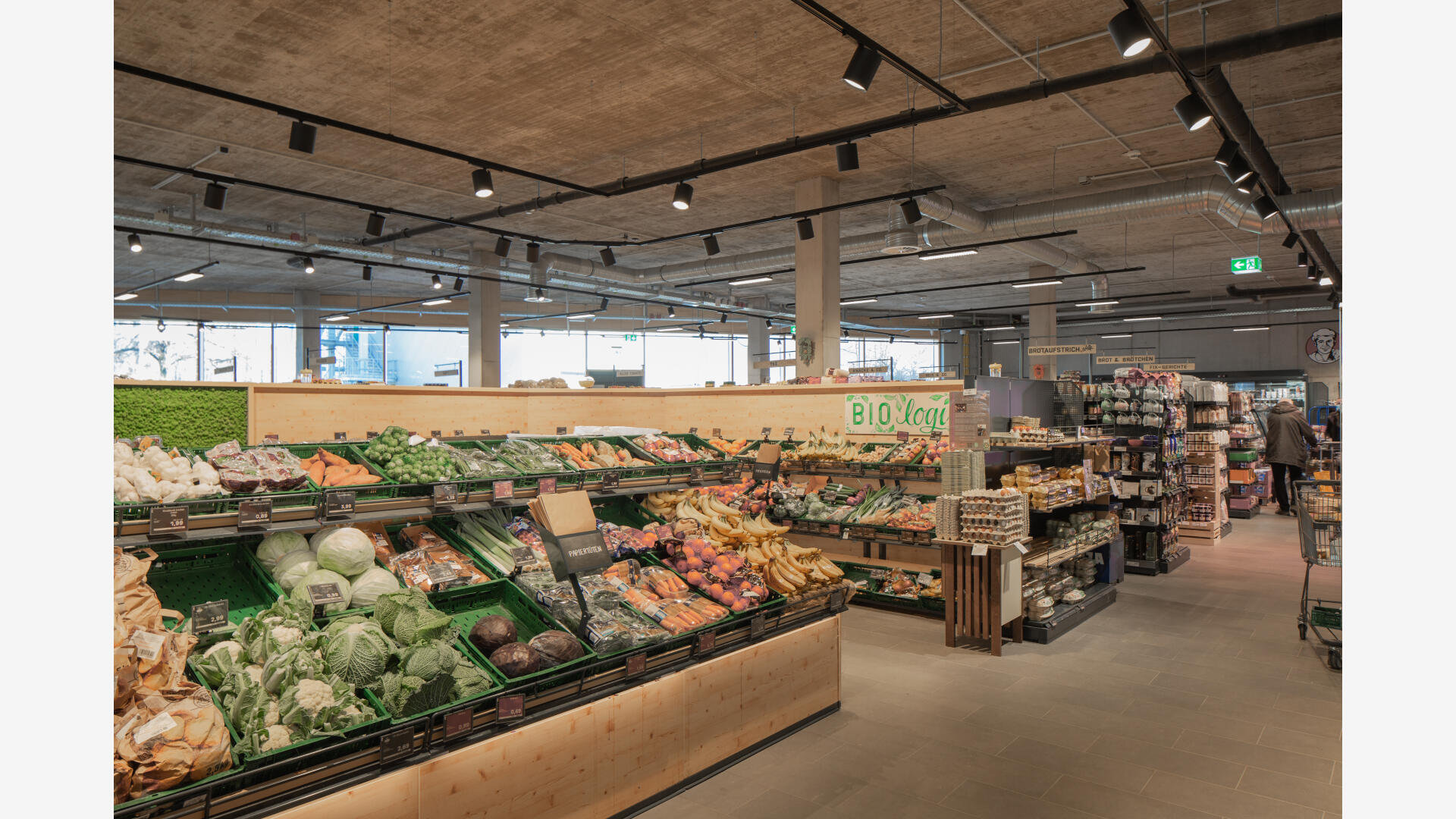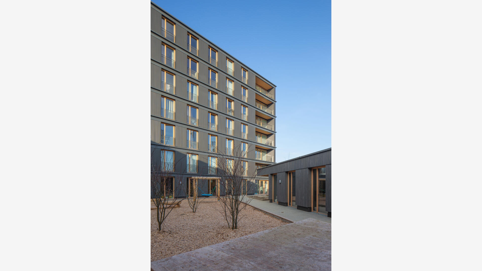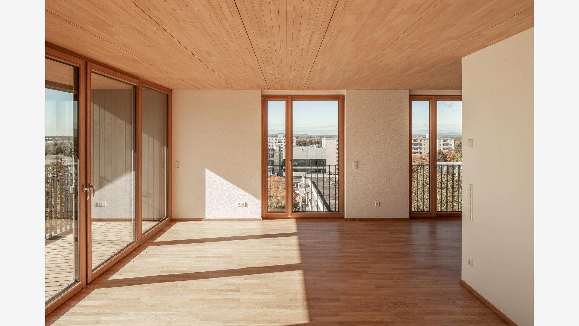 Die ‚Neue Mitte‘ um den Else-Liefmann-Platz ist ein wichtiger Baustein zur umfassenden Sanierung und Aufwertung des Stadtbereichs Weingarten-West im Rahmen des Bund-Länder-Förderprogramms ‚Soziale Stadt‘. An die Stelle eines eingeschossigen Supermarktes tritt ein 8-geschossiger Baukörper in dem ein neuer Supermarkt im EG, eine KiTa im 1. OG und Wohnungen in den Geschossen 2-7 untergebracht sind. Einmalig sind die 7 Geschosse in Holz-Element-Bauweise, inklusive des Aufzugschachtes und den Treppenhäusern. Mit Holz aus heimischer Forstwirtschaft ist das Gebäude Deutschlands erster FSC-zertifizierter Holzbau, außerdem konnte der Ressourcenverbrauch durch die Holzrahmenbauweise (statt Holz-Massivbau) um 44% gesenkt werden. Der Aufbau eines Geschosses, inkl. Decken benötigte nur ca. 1 Woche.