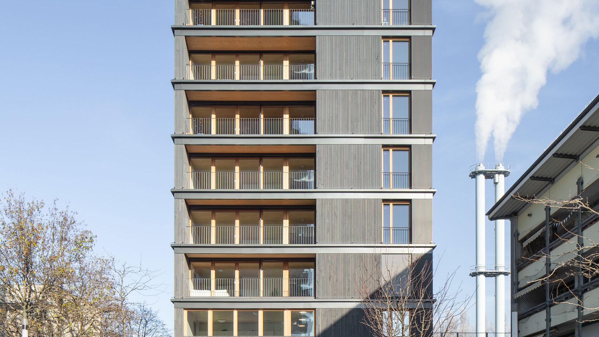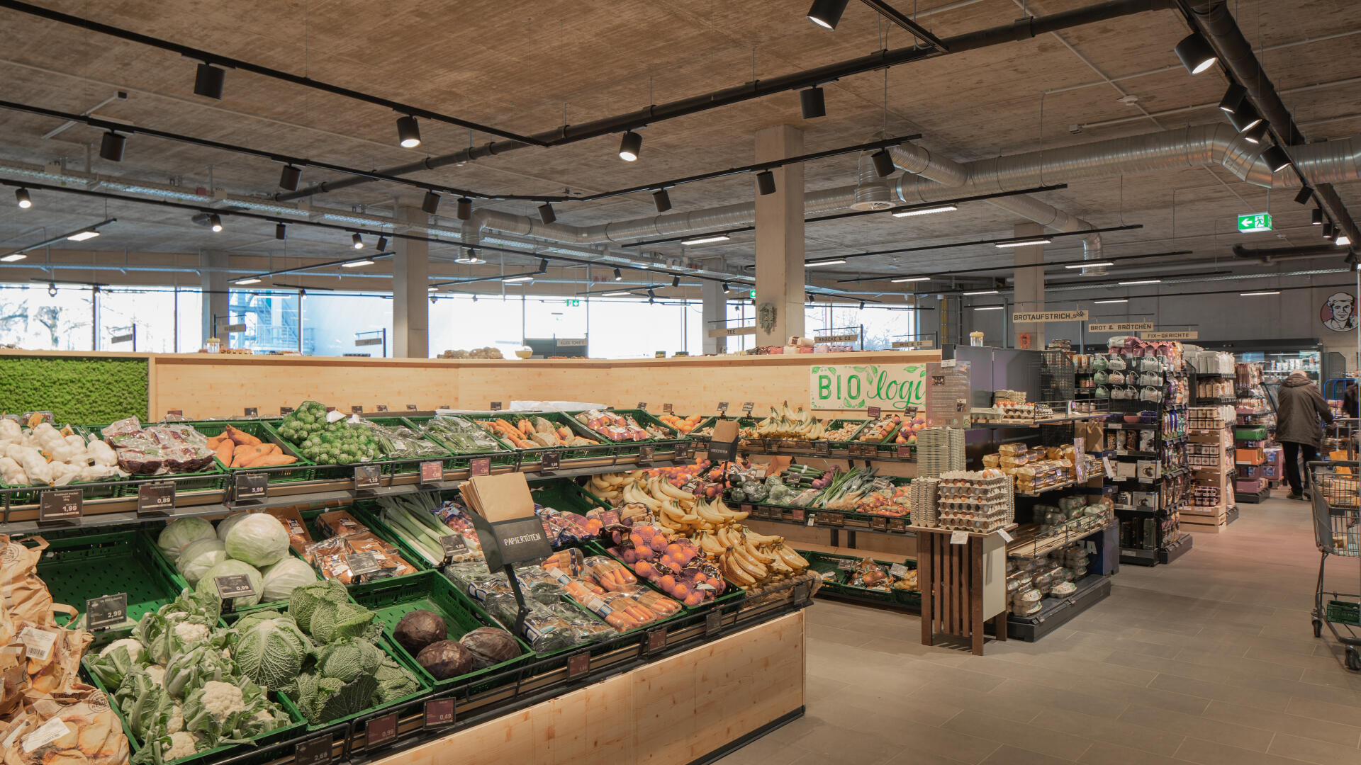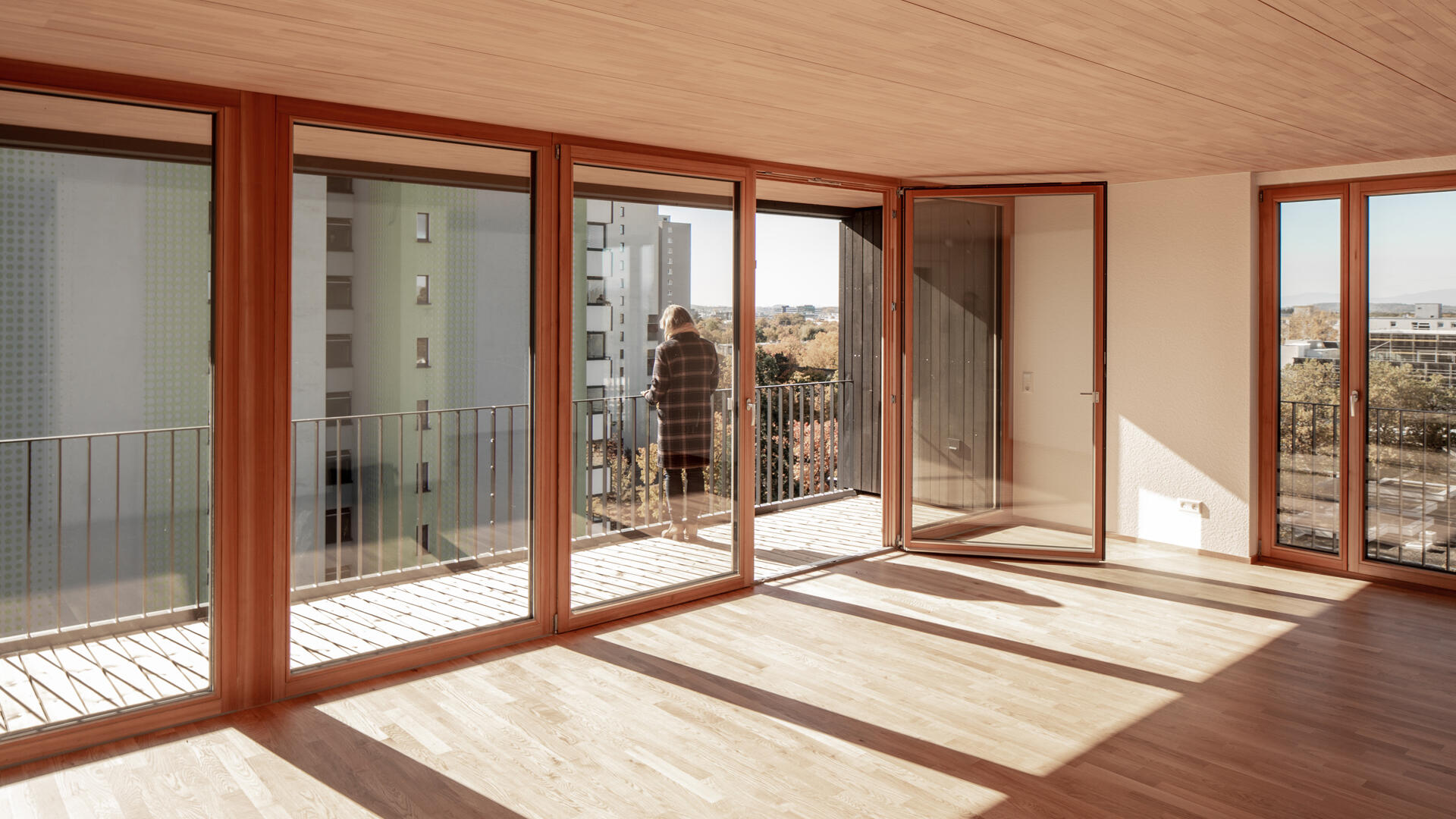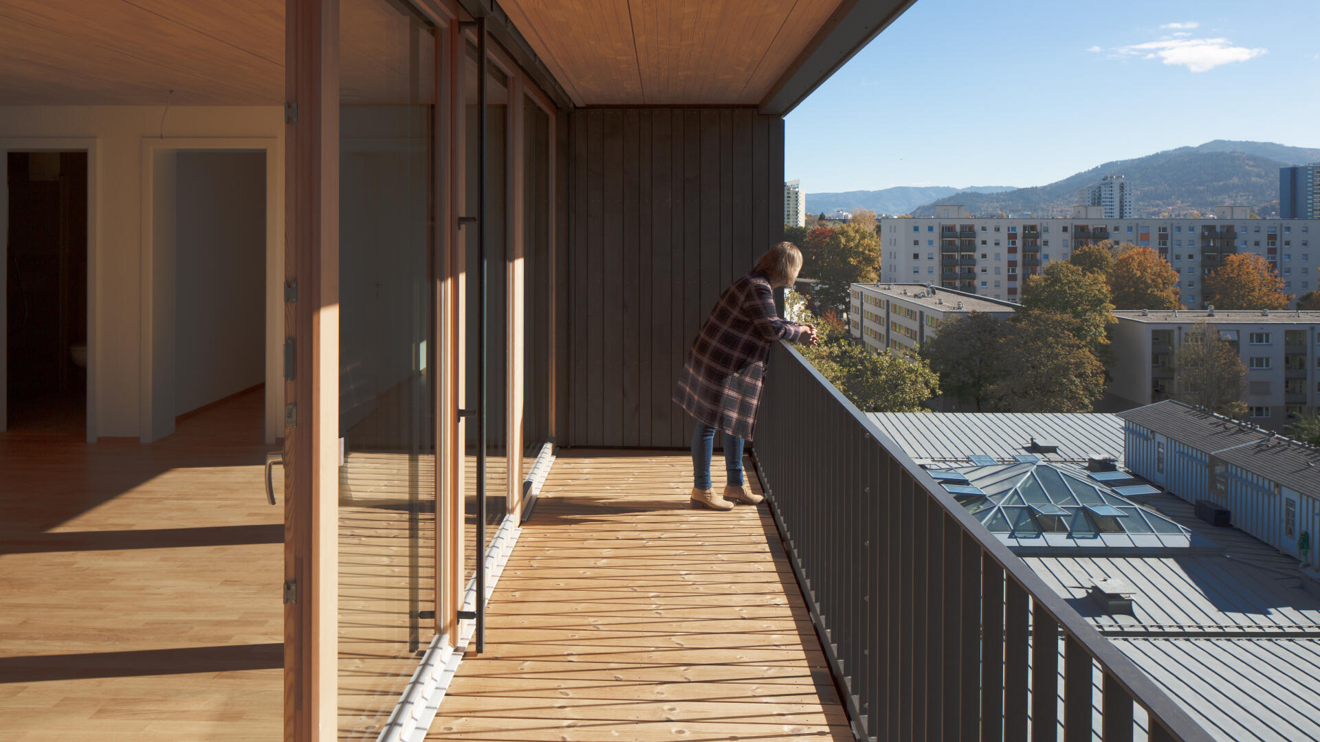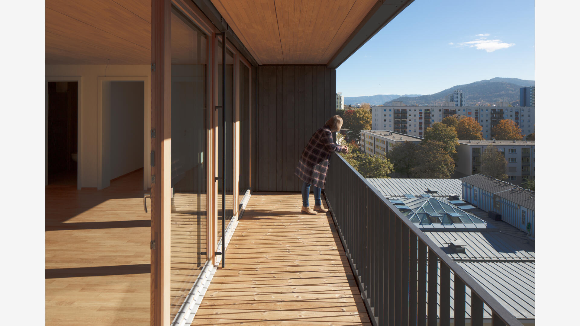 Die ‚Neue Mitte‘ um den Else-Liefmann-Platz ist ein wichtiger Baustein zur umfassenden Sanierung und Aufwertung des Stadtbereichs Weingarten-West im Rahmen des Bund-Länder-Förderprogramms ‚Soziale Stadt‘. An die Stelle eines eingeschossigen Supermarktes tritt ein 8-geschossiger Baukörper in dem ein neuer Supermarkt im EG, eine KiTa im 1. OG und Wohnungen in den Geschossen 2-7 untergebracht sind. Einmalig sind die 7 Geschosse in Holz-Element-Bauweise, inklusive des Aufzugschachtes und den Treppenhäusern. Mit Holz aus heimischer Forstwirtschaft ist das Gebäude Deutschlands erster FSC-zertifizierter Holzbau, außerdem konnte der Ressourcenverbrauch durch die Holzrahmenbauweise (statt Holz-Massivbau) um 44% gesenkt werden. Der Aufbau eines Geschosses, inkl. Decken benötigte nur ca. 1 Woche.