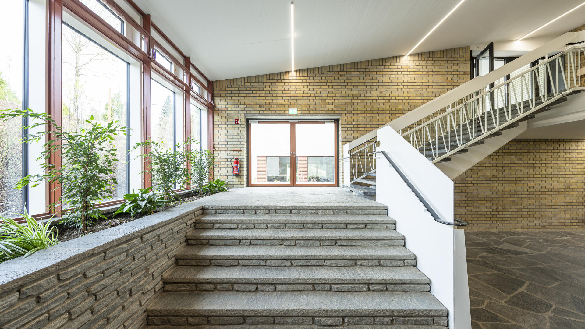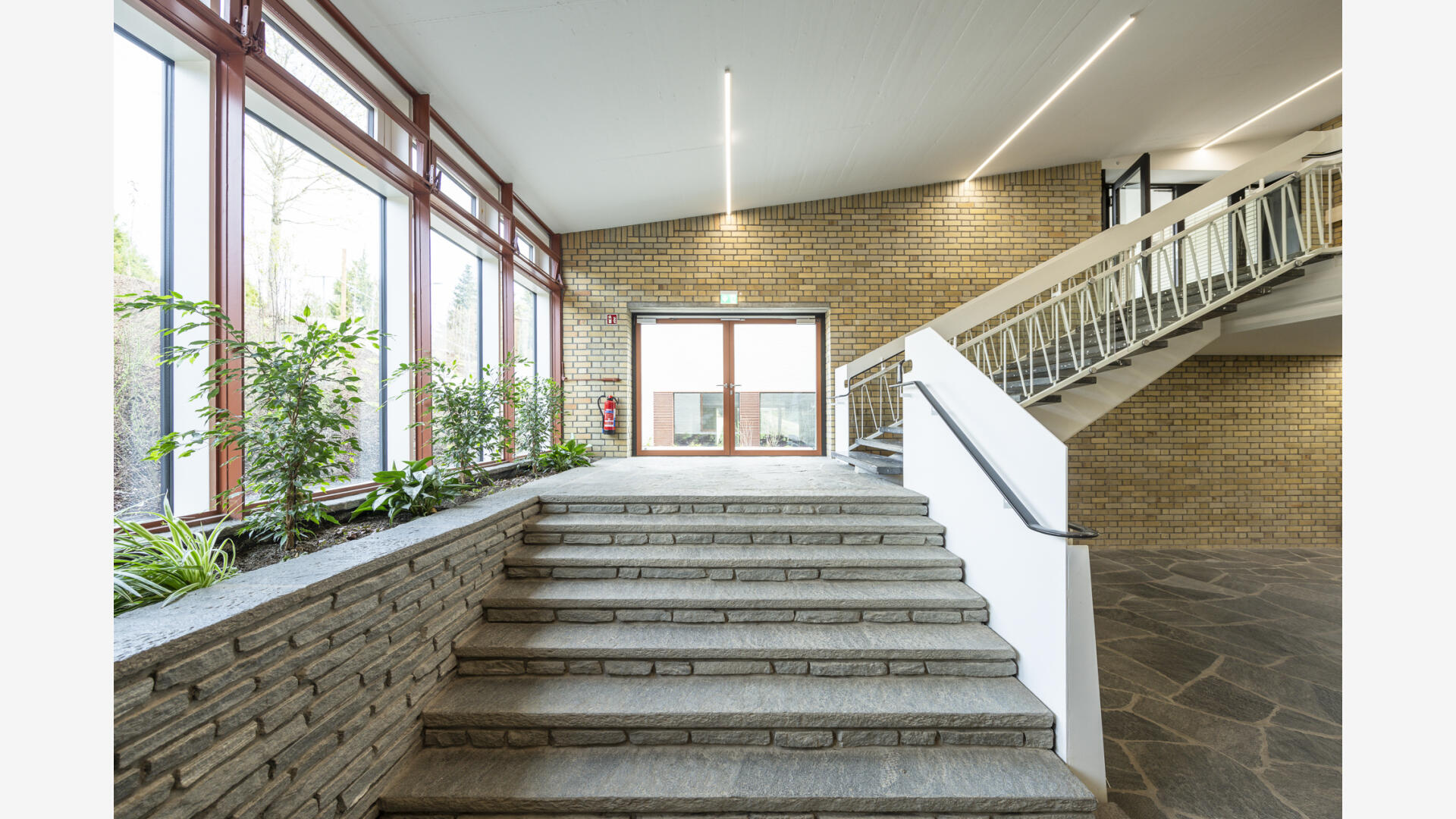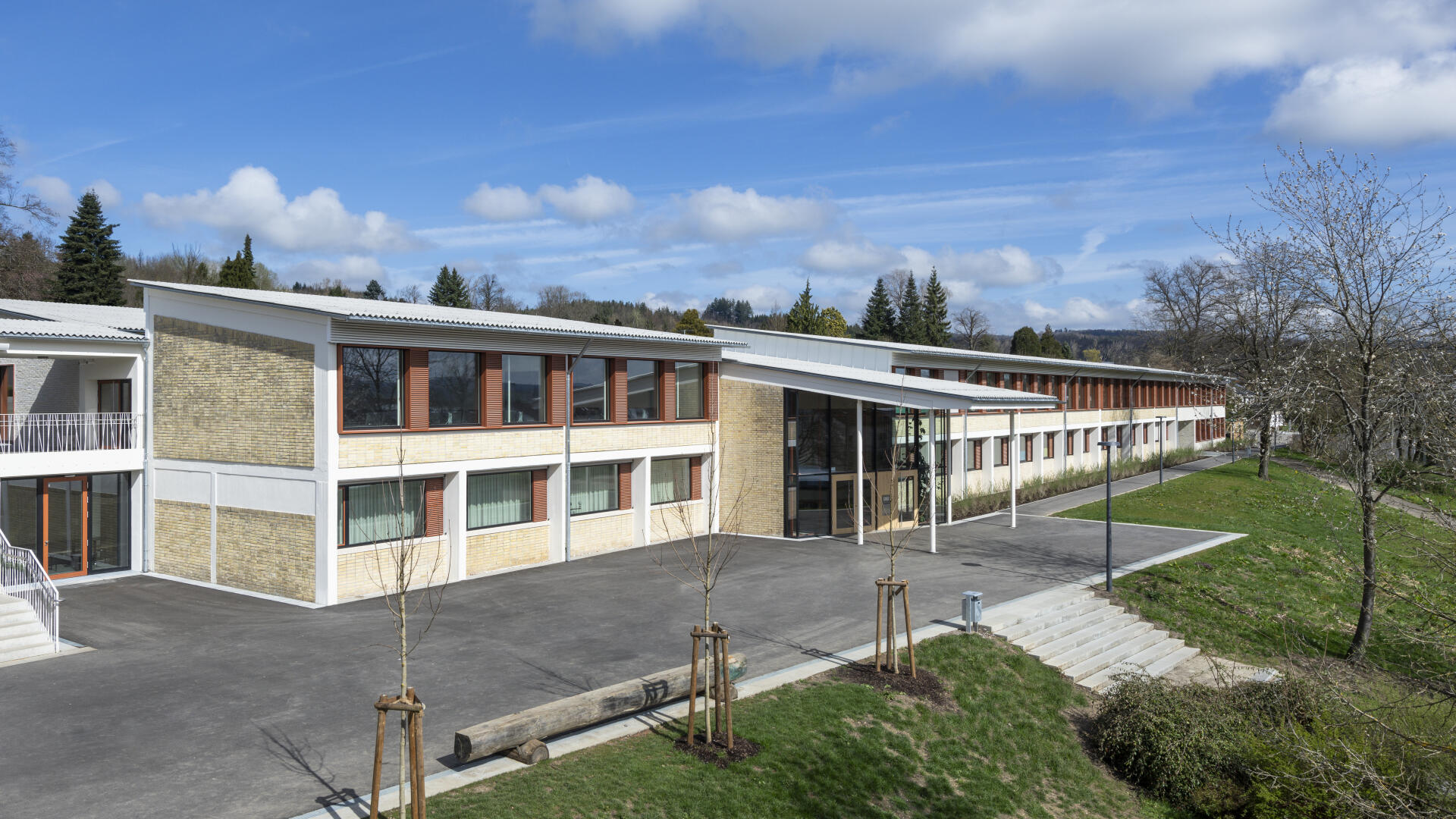 Neben der Generalsanierung des Bestandes waren Erweiterungen notwendig. Das Grundschulgebäude wurde im bestehenden Tragraster nach Osten 2-geschossig erweitert. Hangübergreifend, nach Norden, erfolgten Erweiterungsflächen einschließlich Aula, aufgelöst in einzelne Kuben. Das Ensemble mit Bestandsanierung und Erweiterungsflächen findet mit der aufgestockten Mensa im Kopfbau nach Westen seinen Abschluss. Umgreifend begleiten die neu angelegten Freianlagen ein attraktives Schulbauprojekt in dem man immer noch den Geist der 1950-er-Jahre durch sinnige neue Details aufspüren kann, die bewusst im Kontext zum Ursprungsbauwerk stehen.