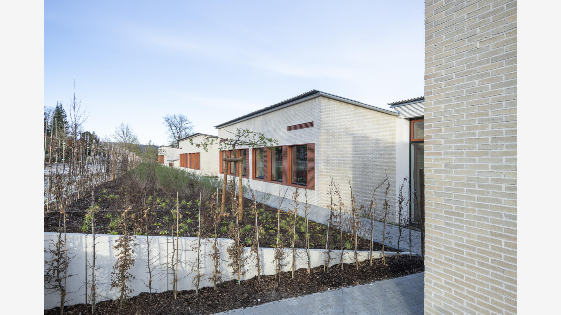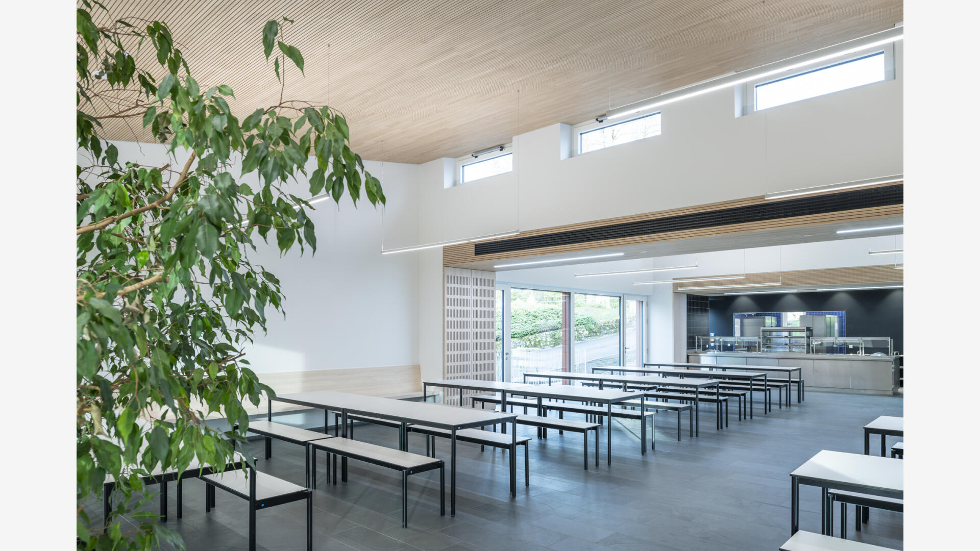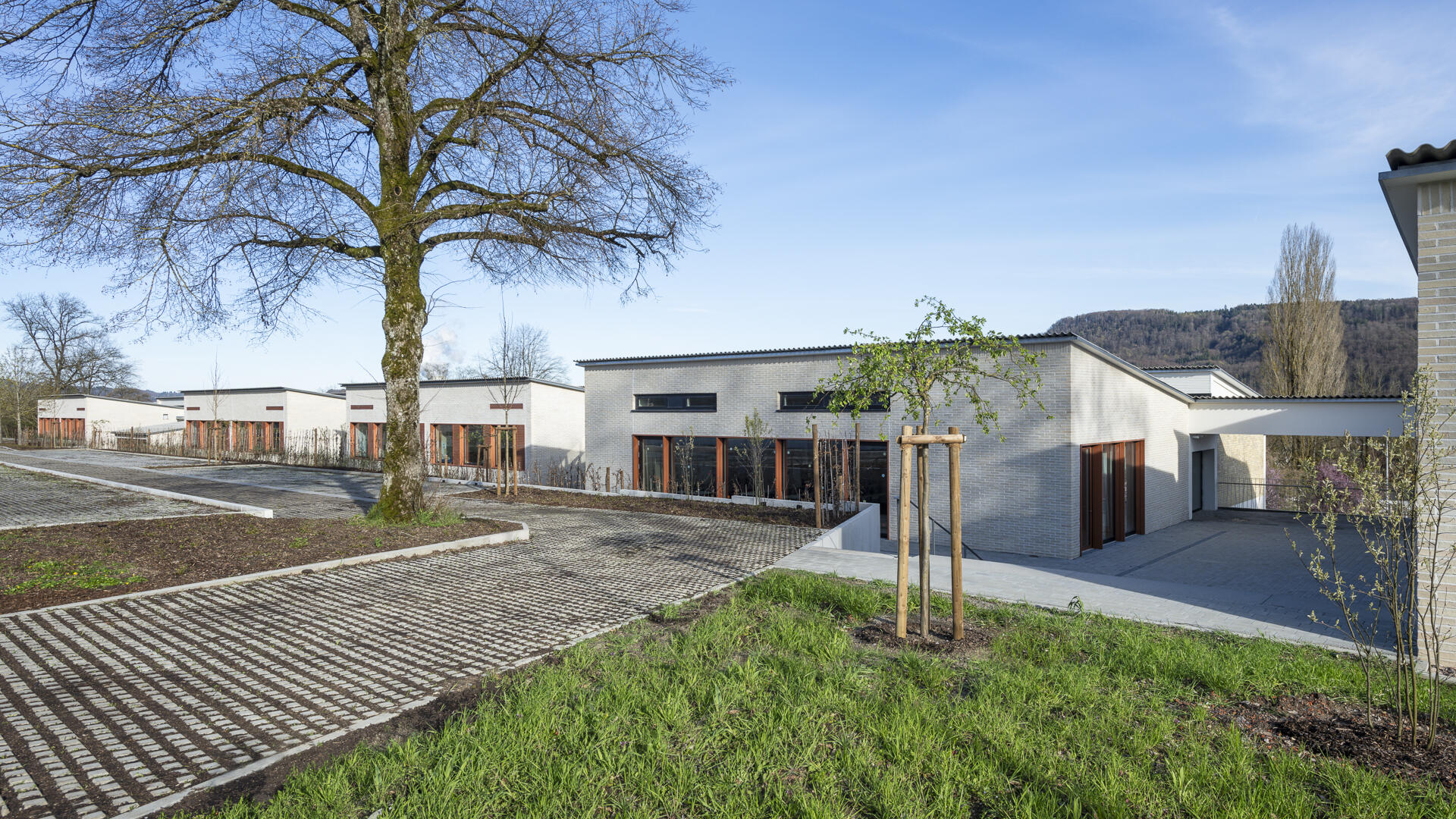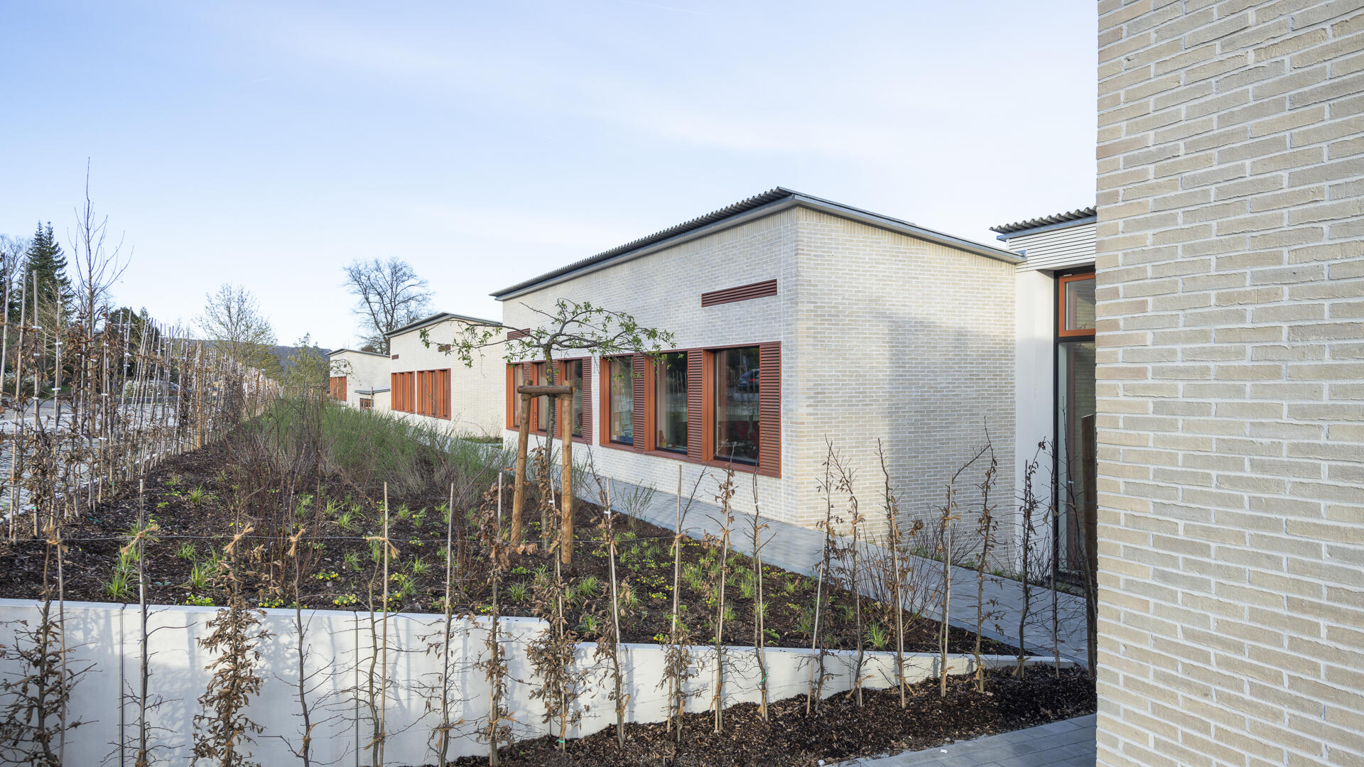 Neben der Generalsanierung des Bestandes waren Erweiterungen notwendig. Das Grundschulgebäude wurde im bestehenden Tragraster nach Osten 2-geschossig erweitert. Hangübergreifend, nach Norden, erfolgten Erweiterungsflächen einschließlich Aula, aufgelöst in einzelne Kuben. Das Ensemble mit Bestandsanierung und Erweiterungsflächen findet mit der aufgestockten Mensa im Kopfbau nach Westen seinen Abschluss. Umgreifend begleiten die neu angelegten Freianlagen ein attraktives Schulbauprojekt in dem man immer noch den Geist der 1950-er-Jahre durch sinnige neue Details aufspüren kann, die bewusst im Kontext zum Ursprungsbauwerk stehen.