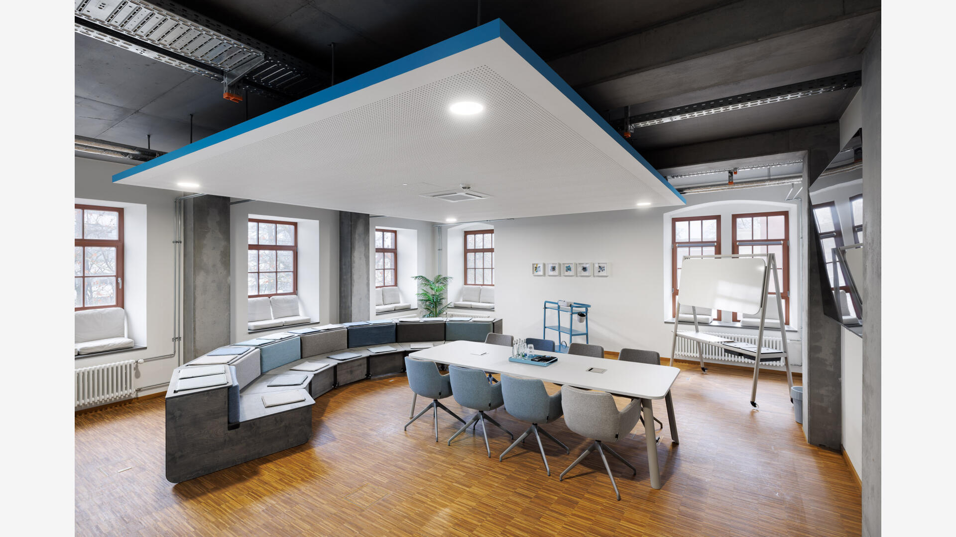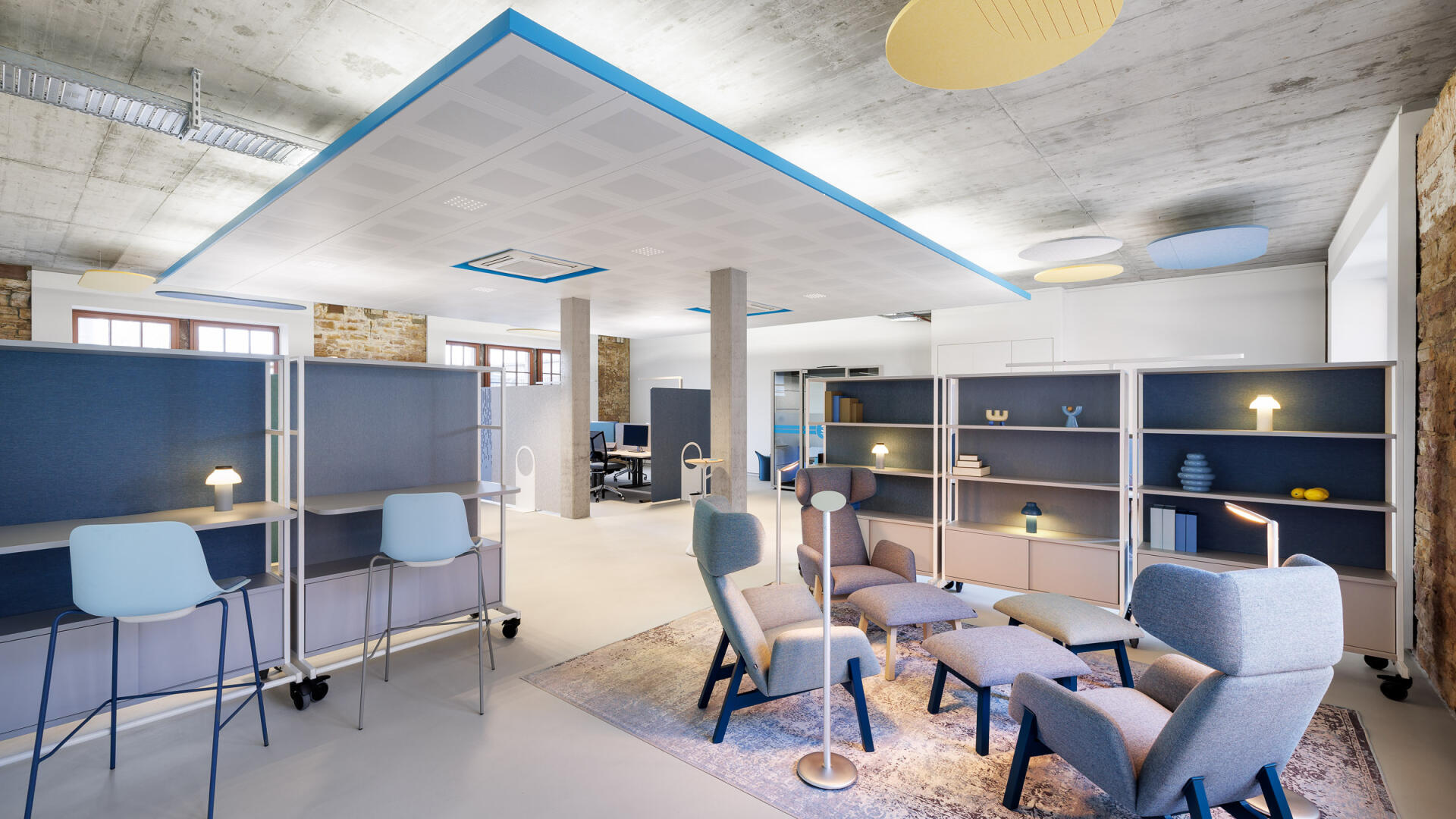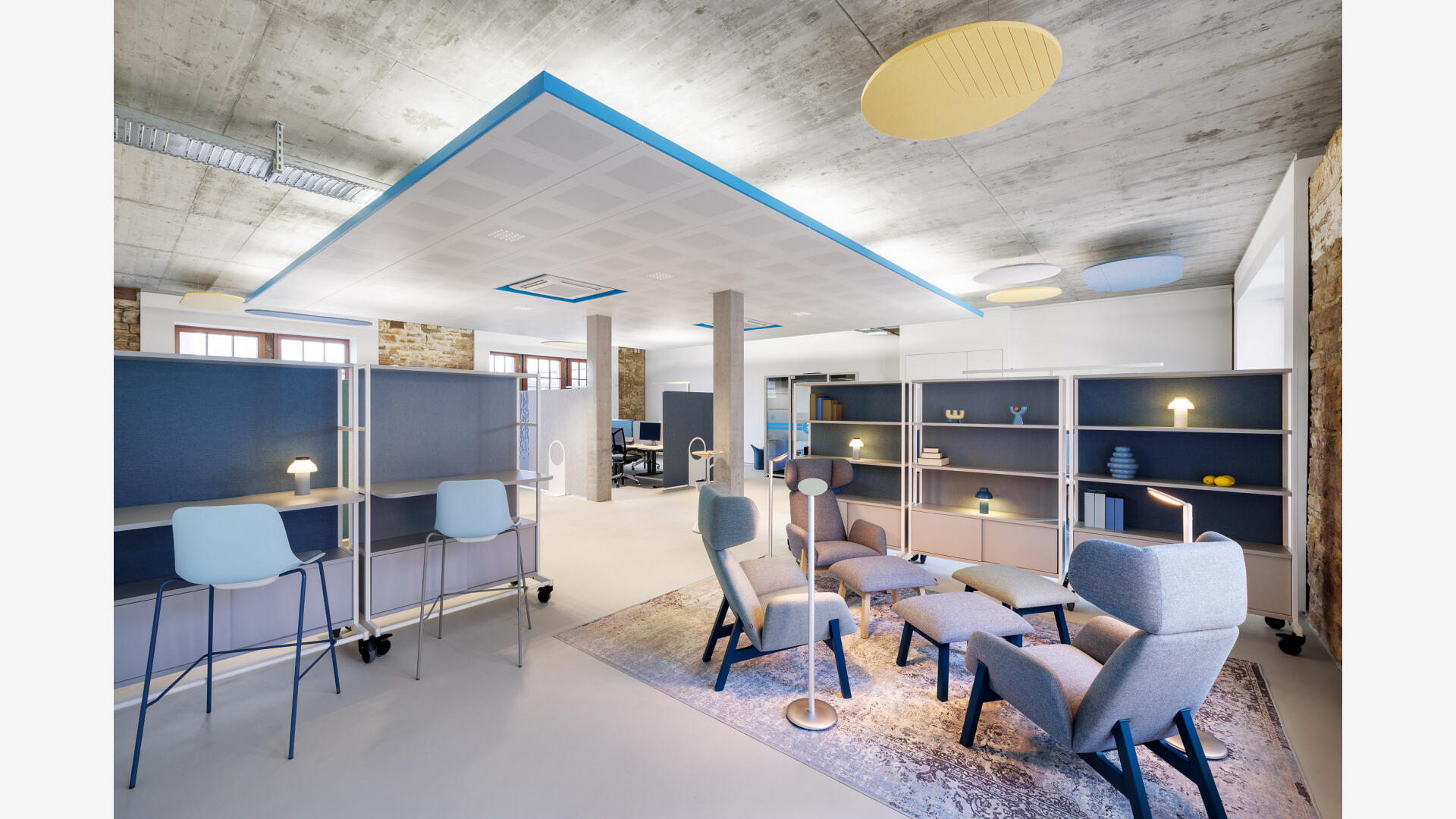 „Für die PACE Mobility GmbH entstand in einem historischen Brauereigebäude in Karlsruhe eine identitätsstiftende neue Arbeitswelt, die Bestand und zeitgemäße New-Work-Strukturen miteinander verbindet. Inspiriert vom Motiv des Tankstellendachs zonieren grafische Deckensegel die offenen Flächen und schaffen Orientierung sowie räumliche Differenzierung zwischen Kommunikation und Konzentration. Der respektvolle Umgang mit der vorhandenen Bausubstanz – Sichtbeton, Mauerwerk und industriellen Elementen – trifft auf eine klare Gestaltungssprache, die Corporate Identity, Funktionalität und Atmosphäre zu einem ganzheitlichen Raumkonzept vereint. Der Entwurf stärkt die Identität des Ortes und übersetzt die Unternehmenskultur in eine räumlich erlebbare Arbeitsumgebung.“
