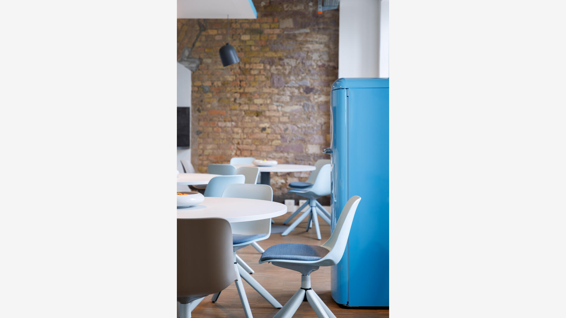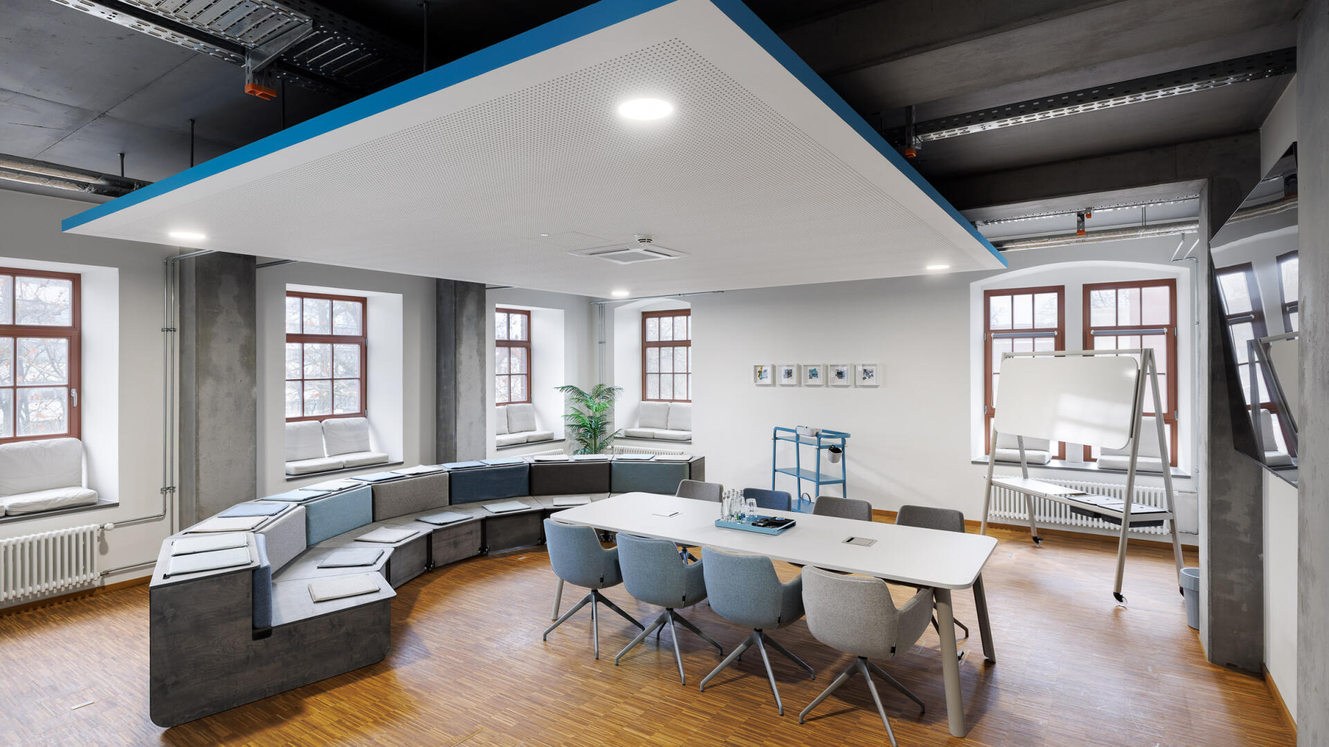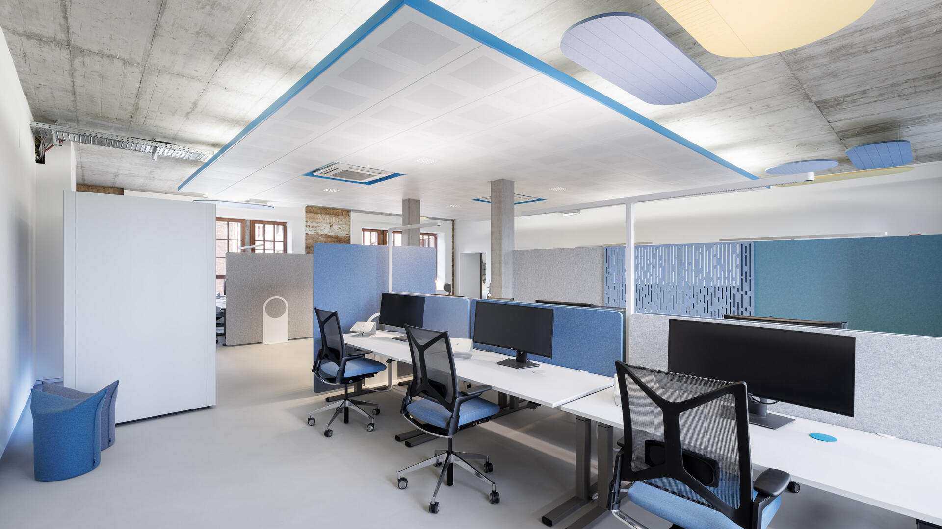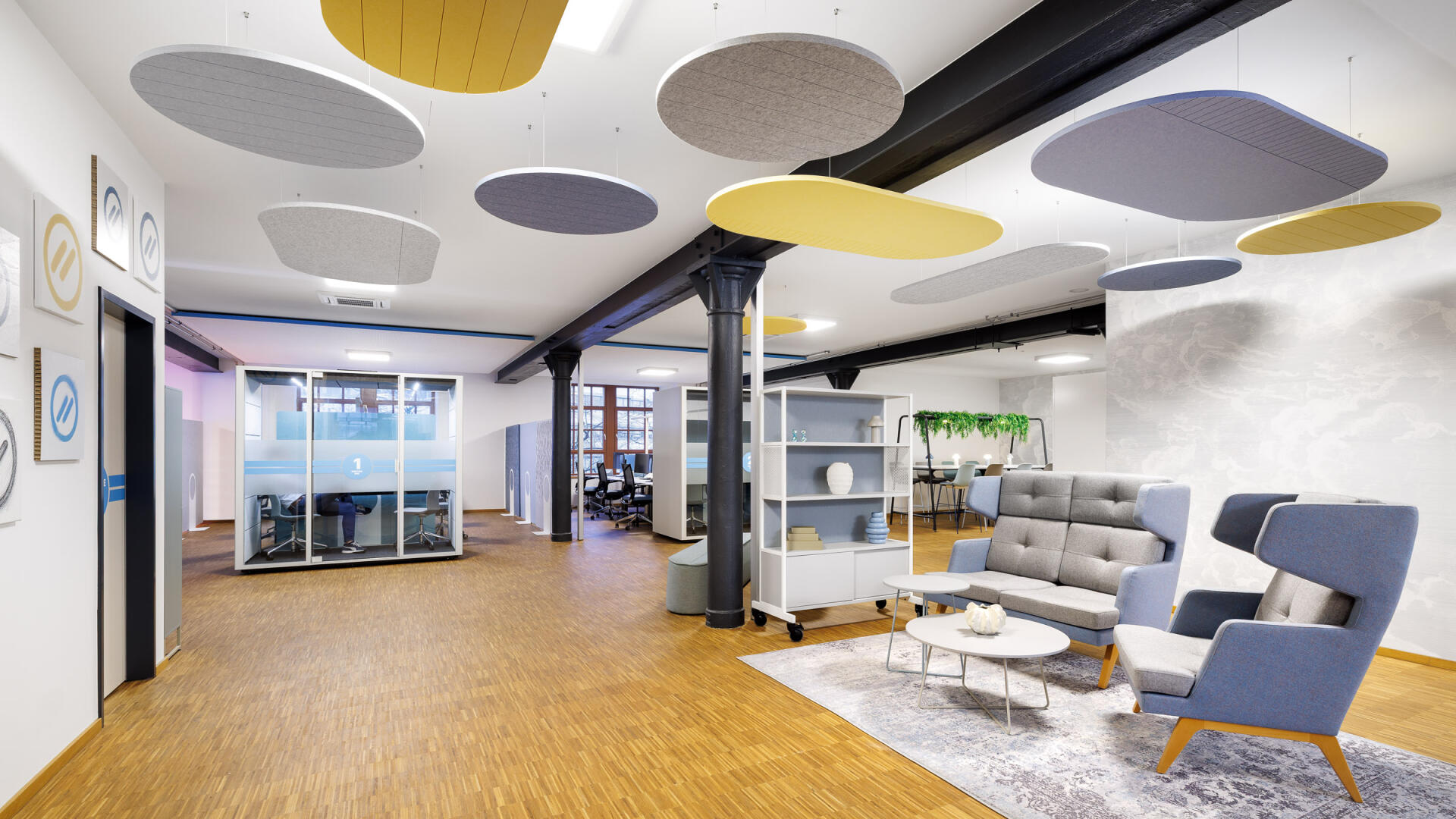 „Für die PACE Mobility GmbH entstand in einem historischen Brauereigebäude in Karlsruhe eine identitätsstiftende neue Arbeitswelt, die Bestand und zeitgemäße New-Work-Strukturen miteinander verbindet. Inspiriert vom Motiv des Tankstellendachs zonieren grafische Deckensegel die offenen Flächen und schaffen Orientierung sowie räumliche Differenzierung zwischen Kommunikation und Konzentration. Der respektvolle Umgang mit der vorhandenen Bausubstanz – Sichtbeton, Mauerwerk und industriellen Elementen – trifft auf eine klare Gestaltungssprache, die Corporate Identity, Funktionalität und Atmosphäre zu einem ganzheitlichen Raumkonzept vereint. Der Entwurf stärkt die Identität des Ortes und übersetzt die Unternehmenskultur in eine räumlich erlebbare Arbeitsumgebung.“