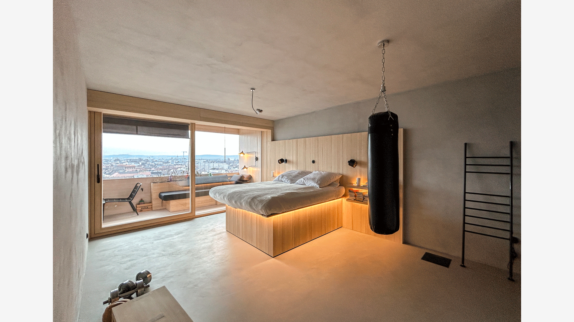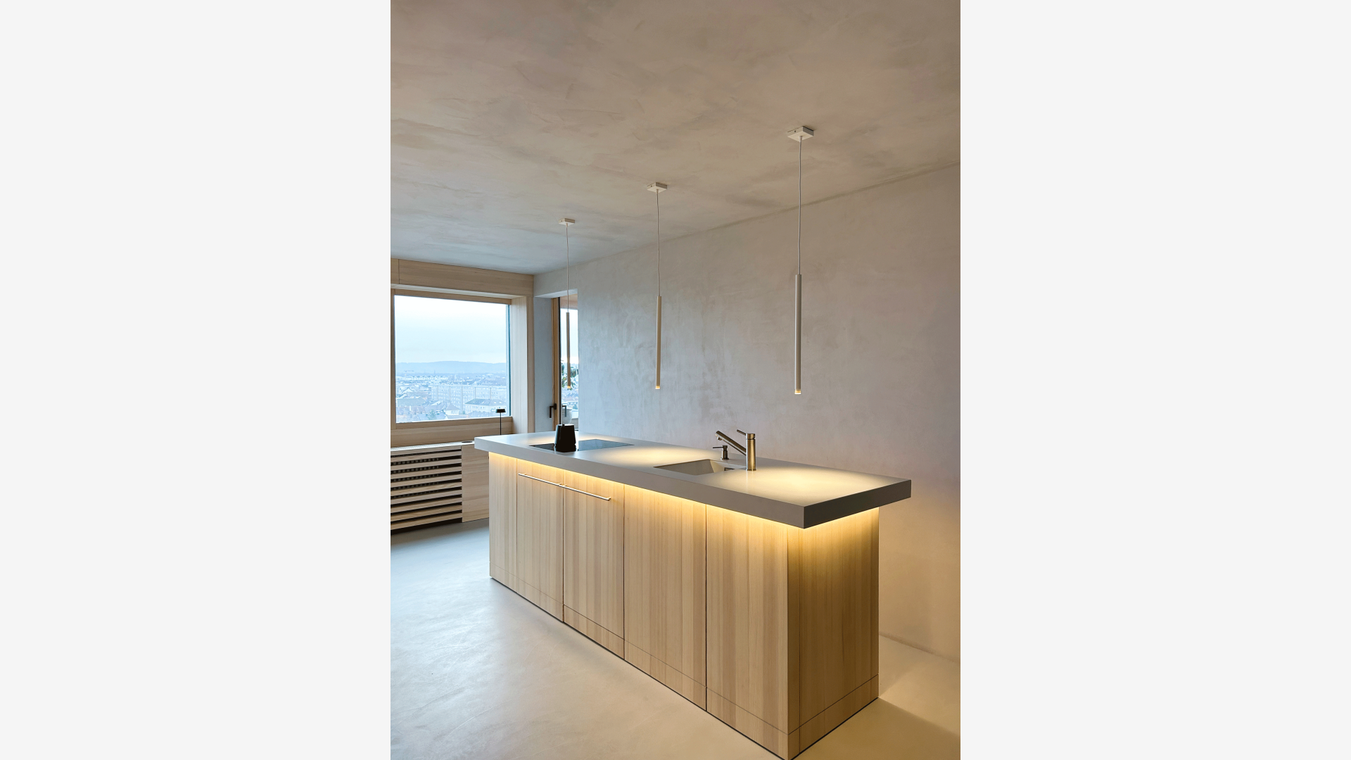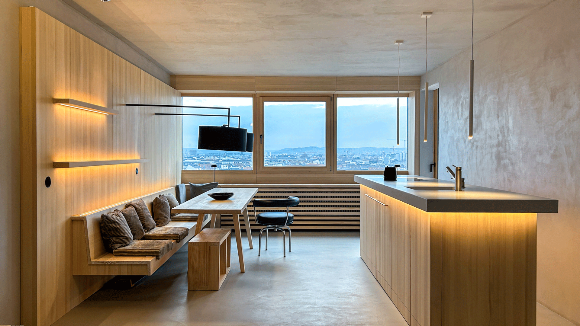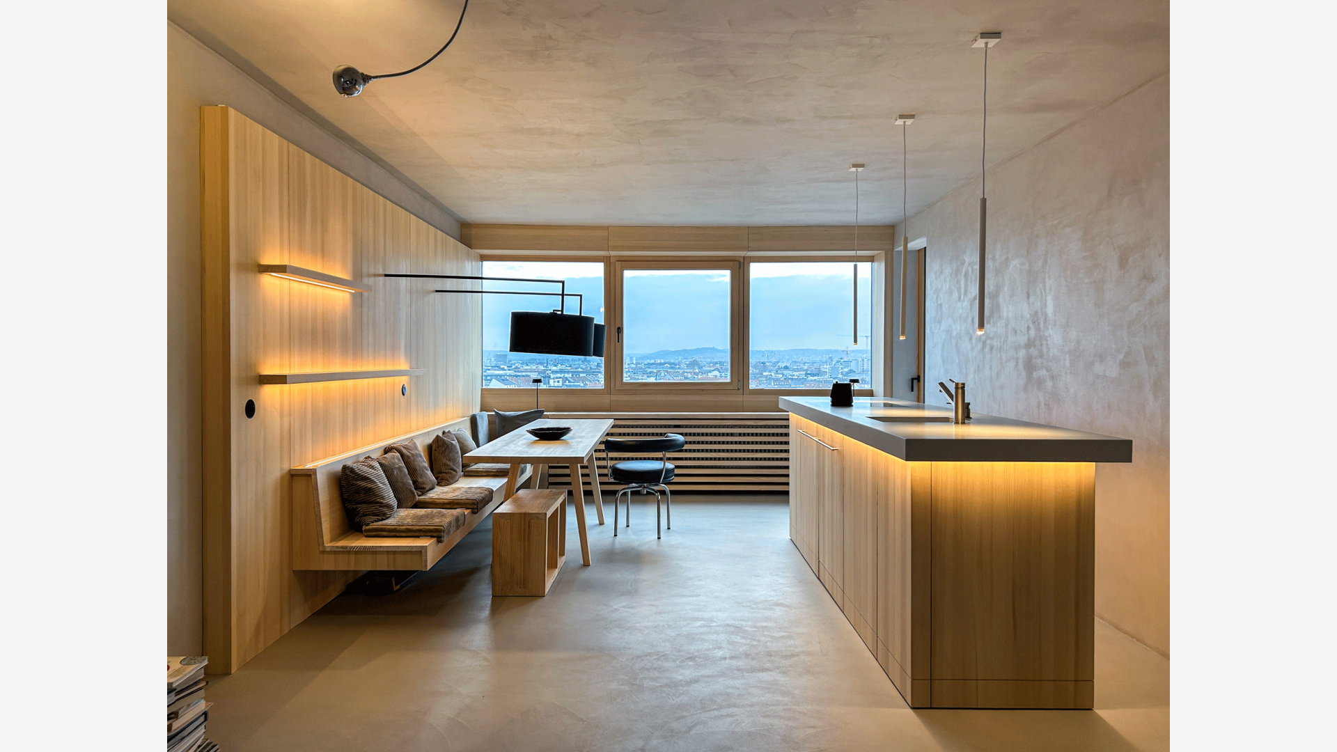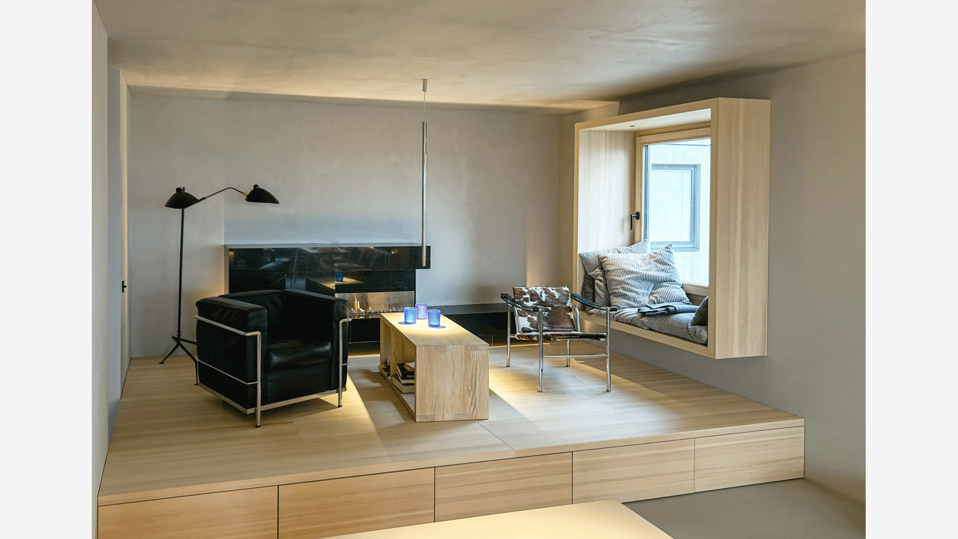 Funktionale Elemente folgen dem Rucksackprinzip: Stauraum, Technik und Nebenfunktionen liegen verborgen hinter holzverkleideten Wänden. Die reduzierte Materialität aus Holz, Beton und wenigen Oberflächen sowie gezielt gesetztes, indirektes Licht betonen die räumliche Schichtung. Der Bestand bleibt ablesbar und wird als räumliche Skulptur neu interpretiert.