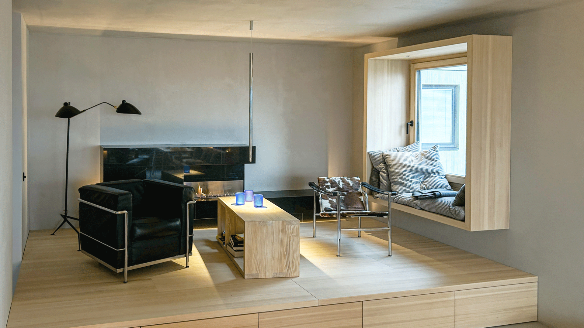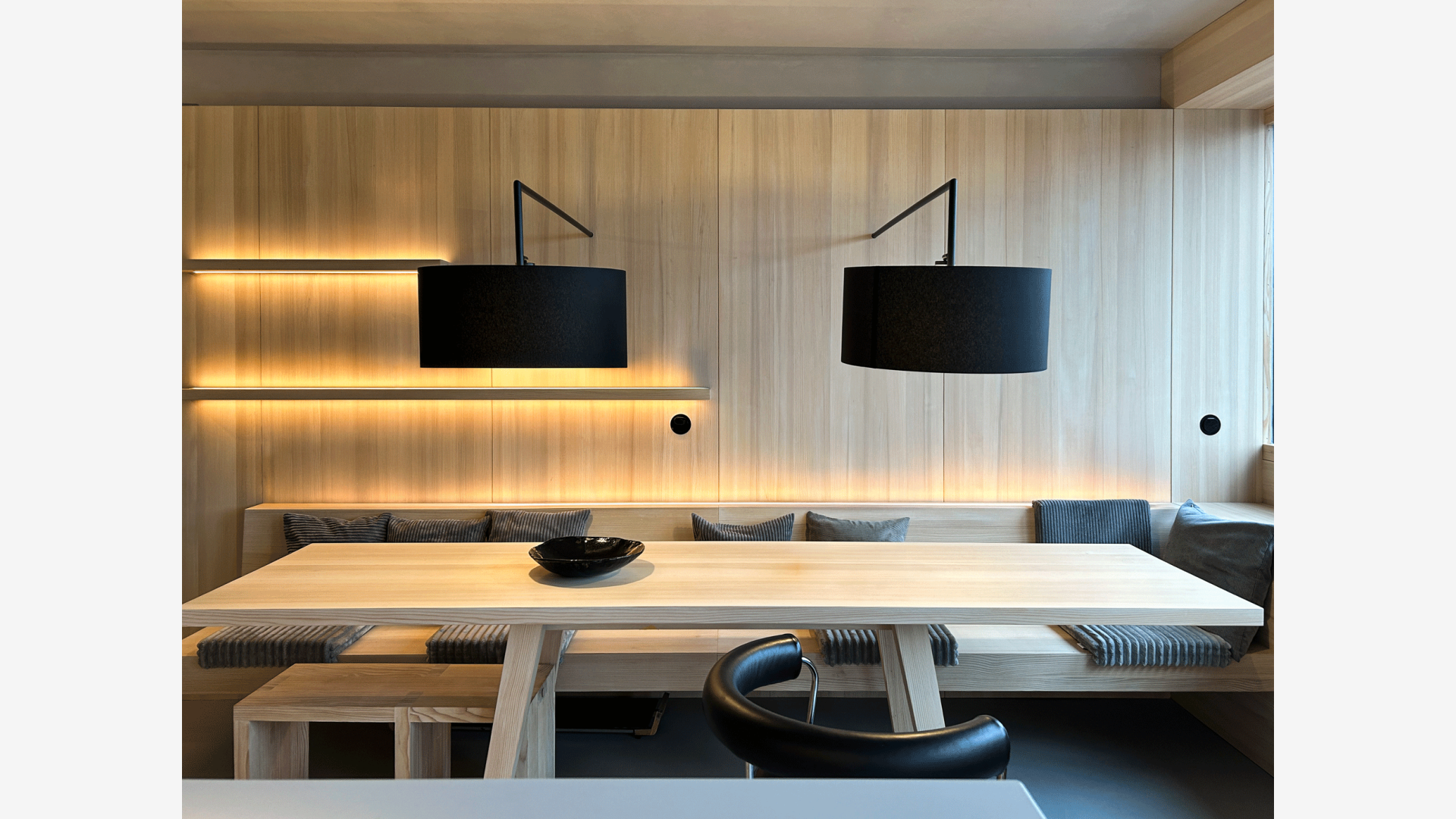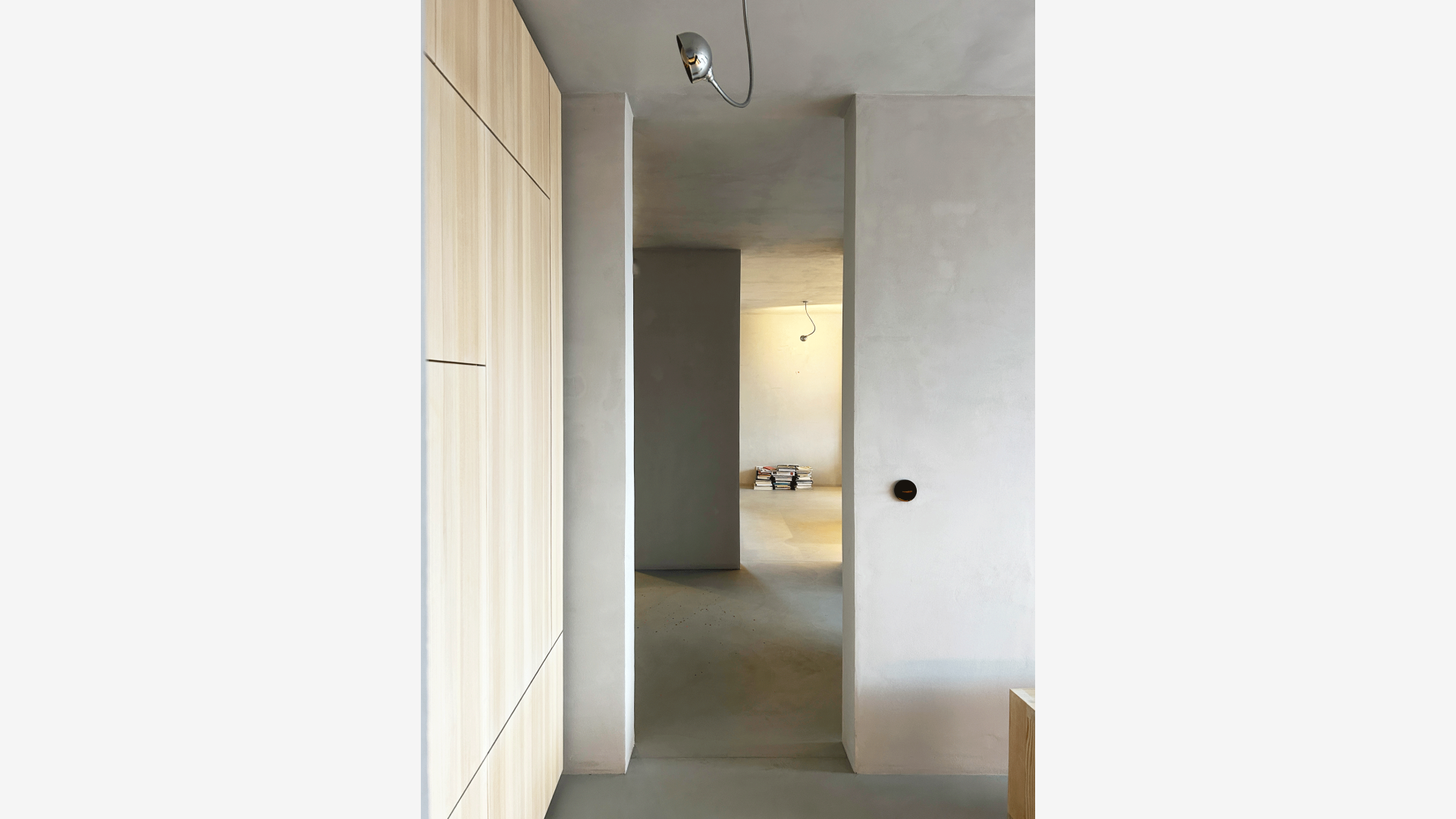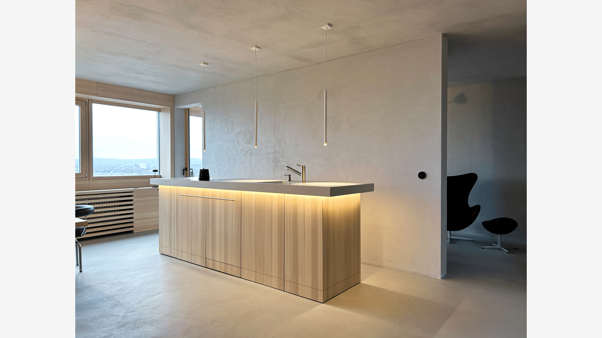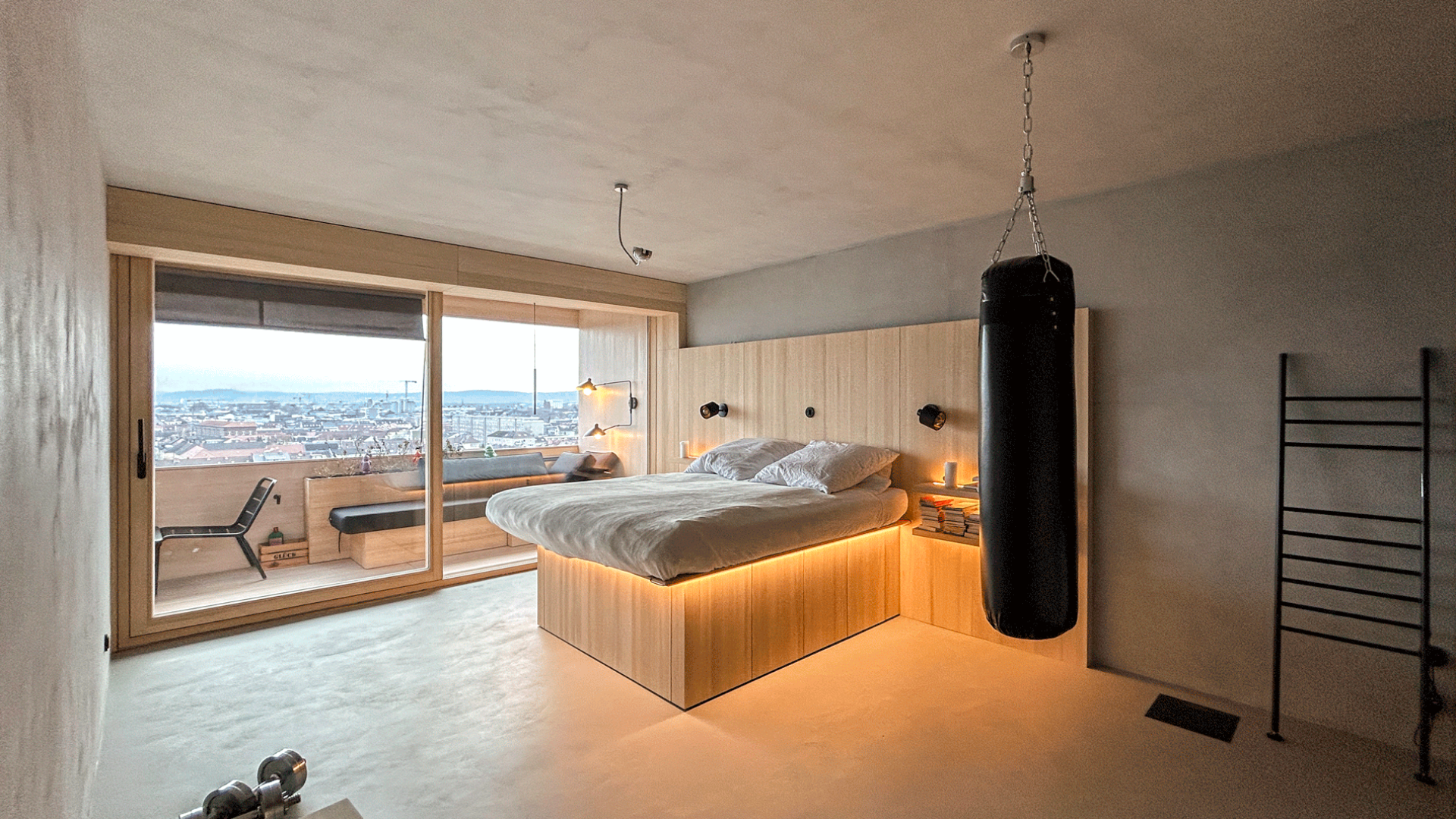 Funktionale Elemente folgen dem Rucksackprinzip: Stauraum, Technik und Nebenfunktionen liegen verborgen hinter holzverkleideten Wänden. Die reduzierte Materialität aus Holz, Beton und wenigen Oberflächen sowie gezielt gesetztes, indirektes Licht betonen die räumliche Schichtung. Der Bestand bleibt ablesbar und wird als räumliche Skulptur neu interpretiert.