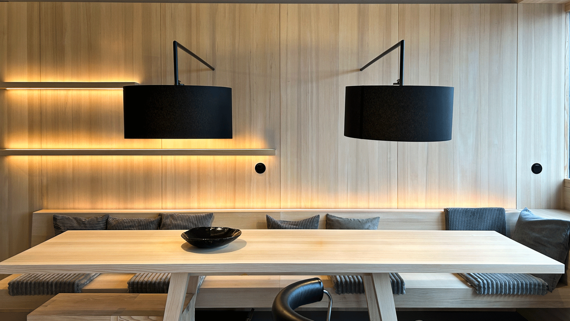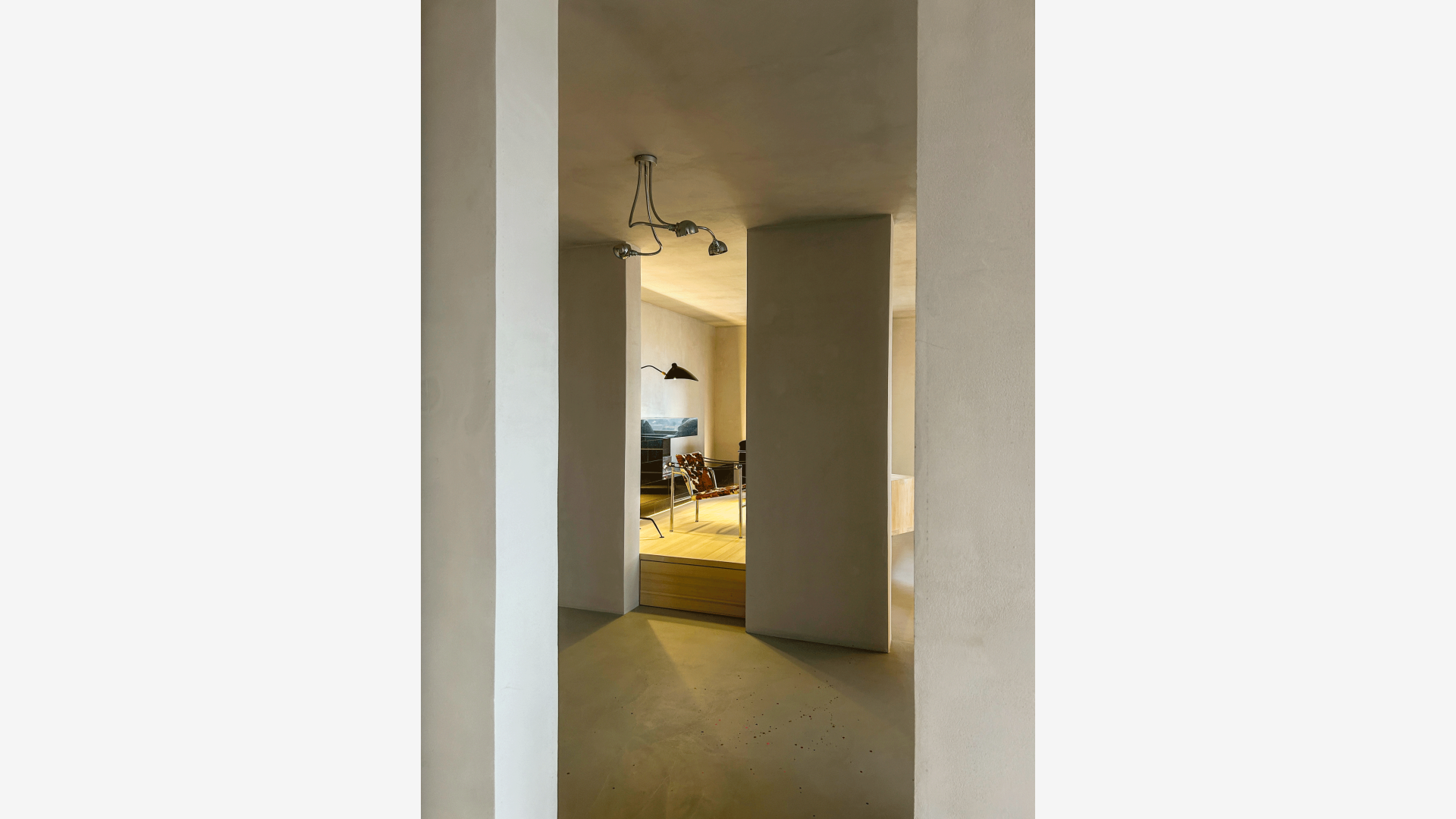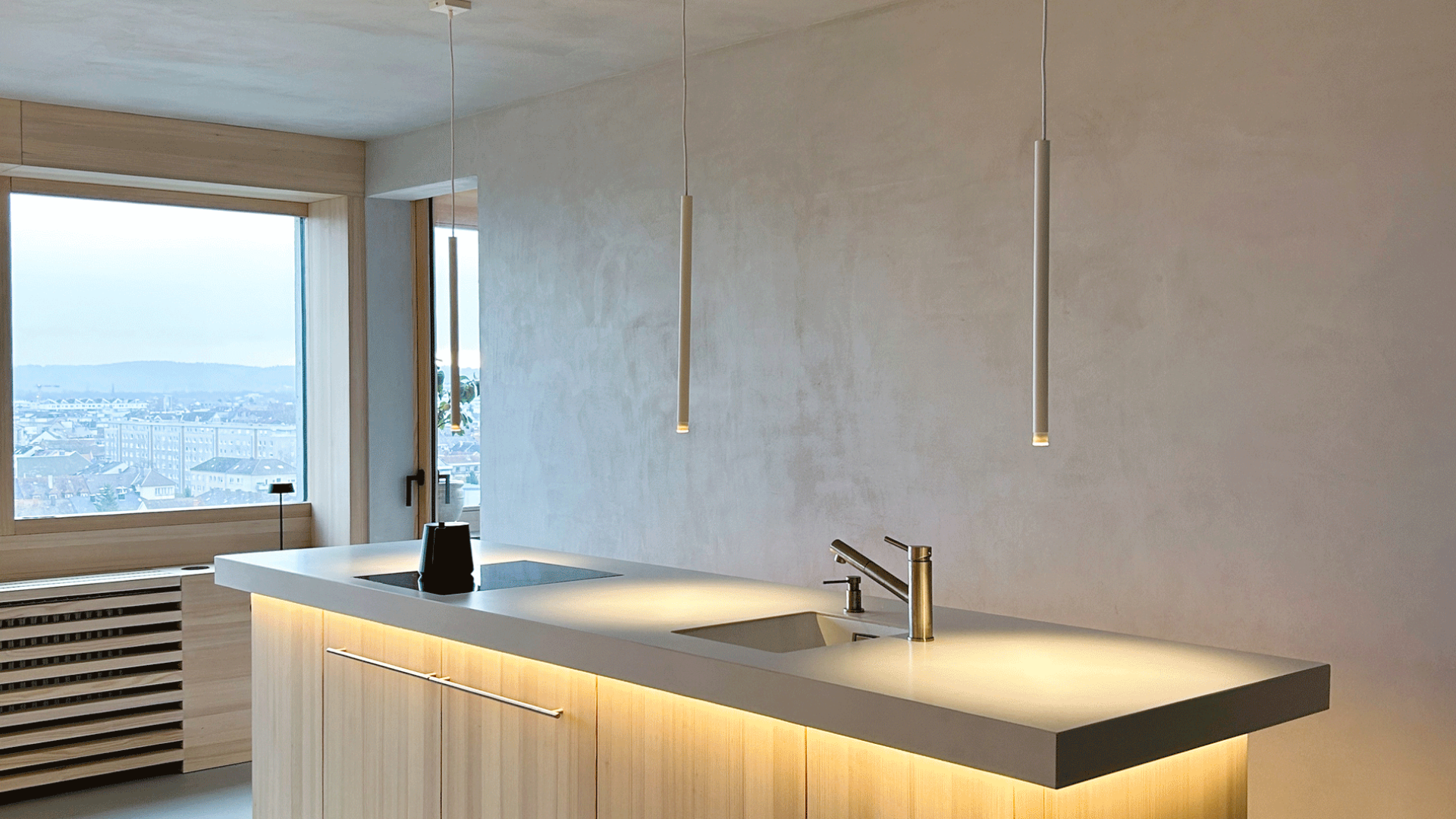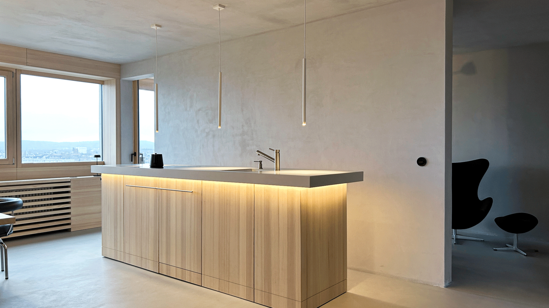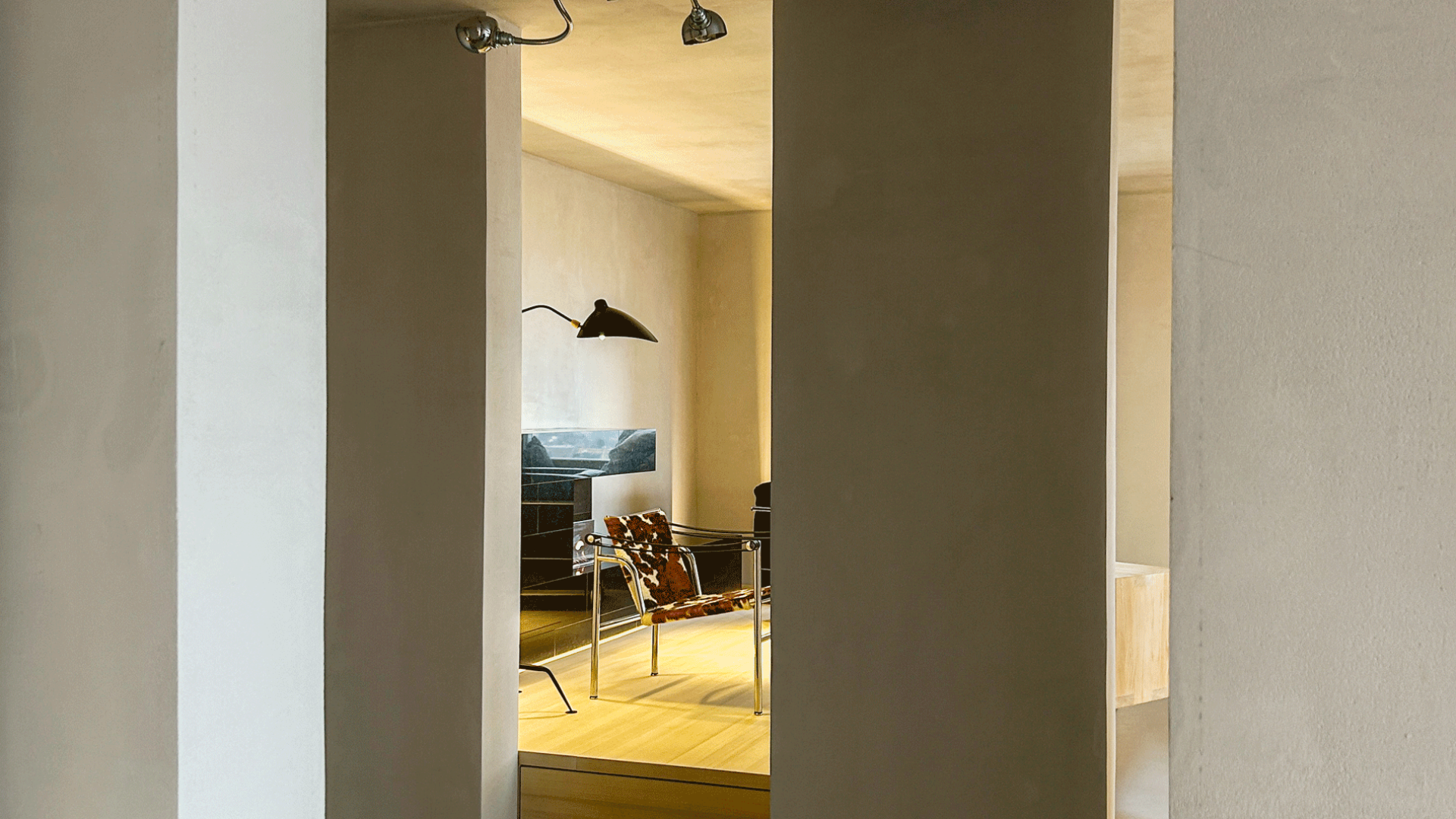 Funktionale Elemente folgen dem Rucksackprinzip: Stauraum, Technik und Nebenfunktionen liegen verborgen hinter holzverkleideten Wänden. Die reduzierte Materialität aus Holz, Beton und wenigen Oberflächen sowie gezielt gesetztes, indirektes Licht betonen die räumliche Schichtung. Der Bestand bleibt ablesbar und wird als räumliche Skulptur neu interpretiert.