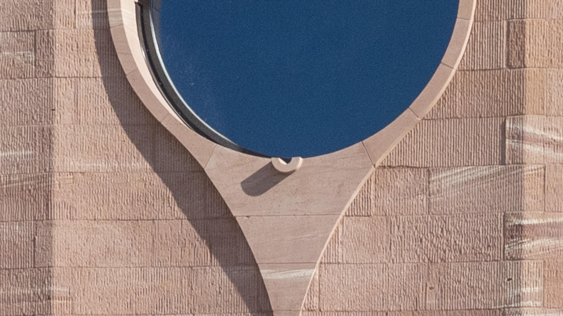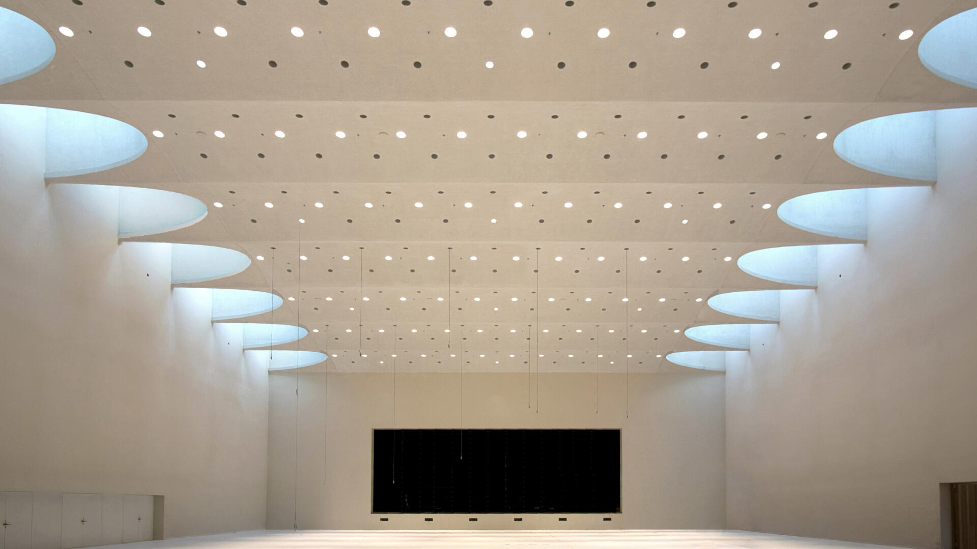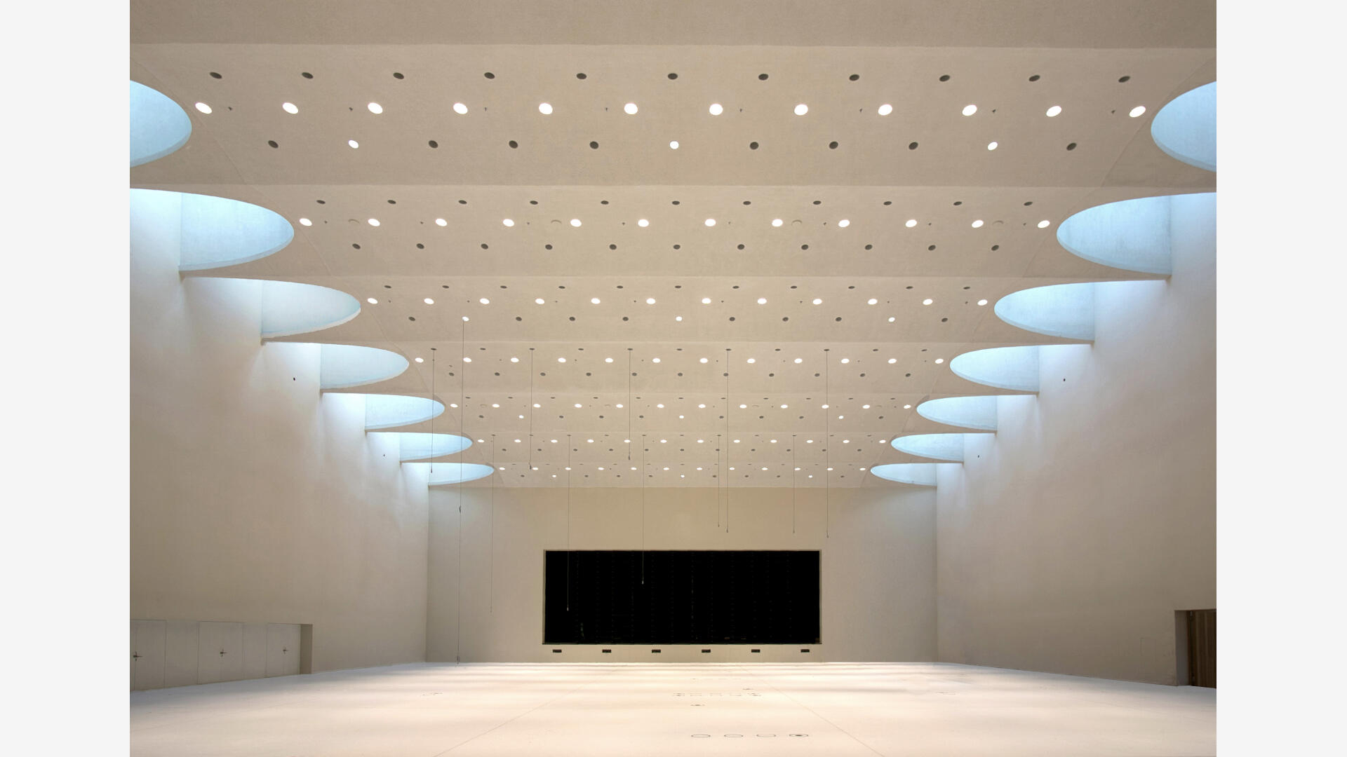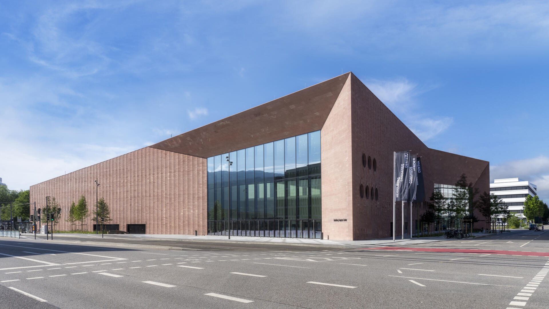 Die repräsentativen Öffnungen des HCC verleihen dem monolithischen Gebäude einen einladenden Charakter. Wie das Heidelberger Schloss besteht die Fassade aus regionalem Buntsandstein. Die Kannelur der nahezu fensterlose Fassade verleiht dem Stein ein bewegtes Licht- und Schattenspiel. Im Kontrast zur äußeren Kompaktheit des Gebäudes überrascht das Innere mit lichten Räumen, die nahezu entmaterialisiert wirken. Weißbeton, helle Terrazzoböden und Ulmenholz bestimmen das Farbkonzept. Durch einen aufregenden Wechsel von niedrigen und sehr hohen Räumen entsteht eine spannungsreiche Raumwirkung. Im Hauptsaal des Gebäudes fällt das natürliche Licht durch elliptische Aussparungen am Rand des Kappengewölbes, sodass der eigentlich schwere Beton wirkt, als würde sich hier leichter Stoff entfalten.
