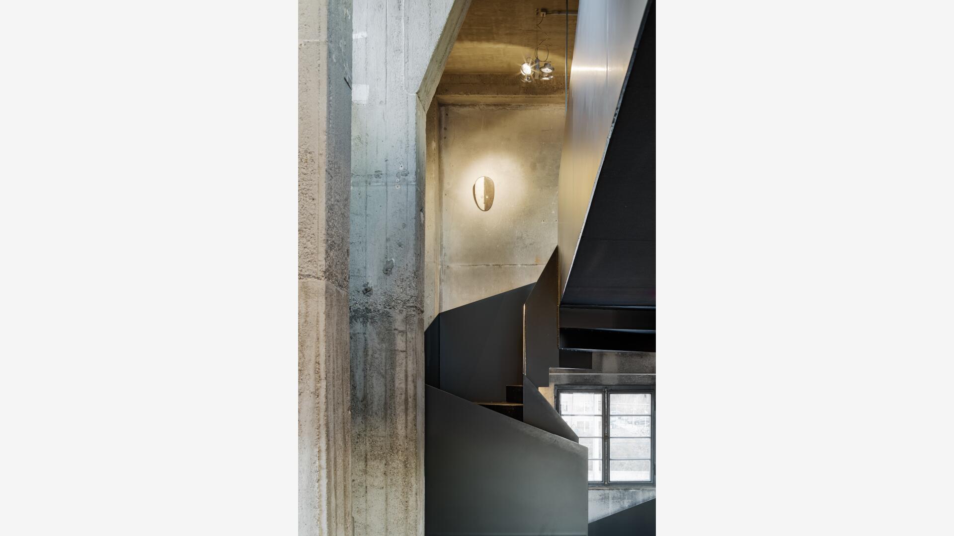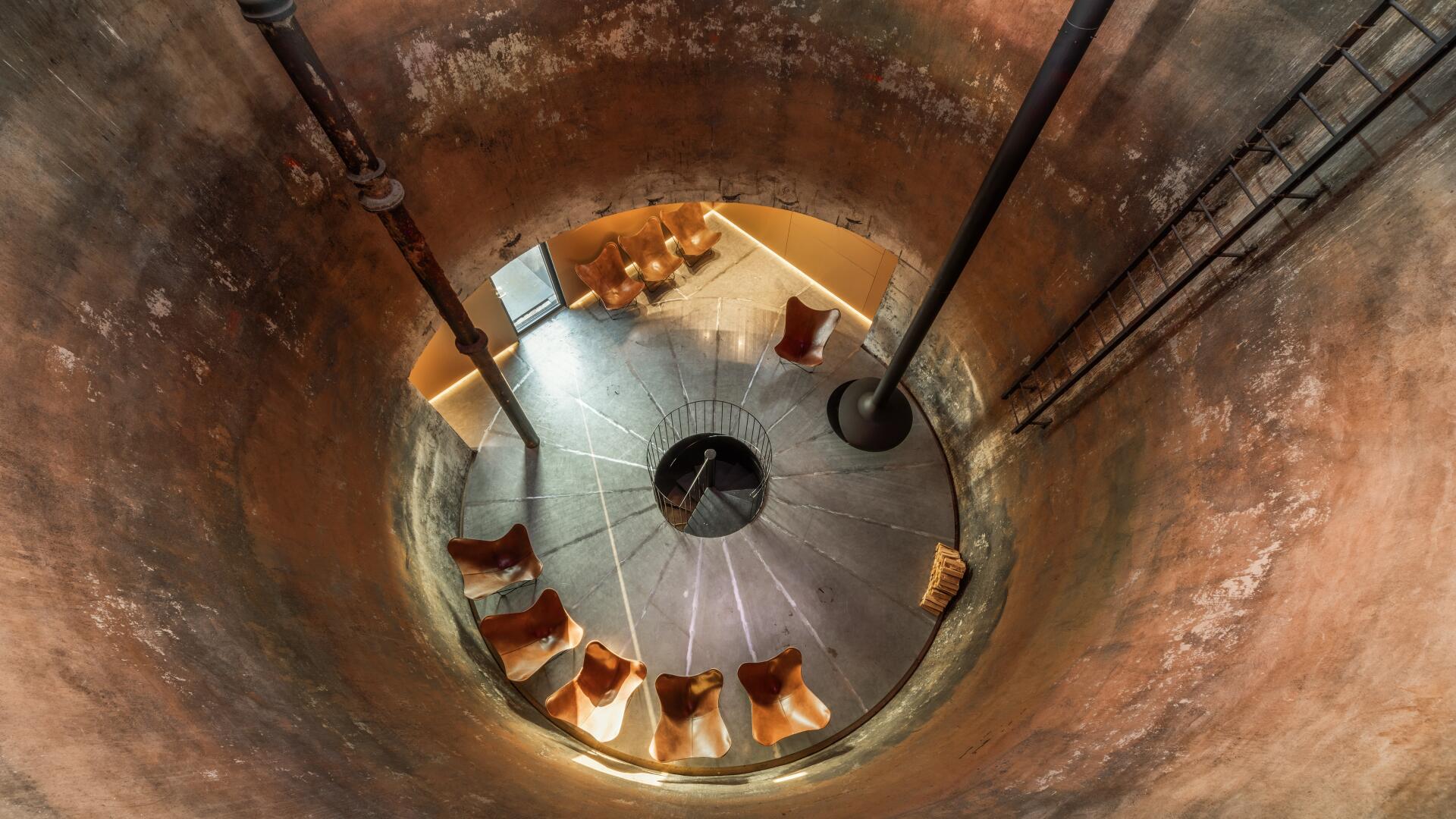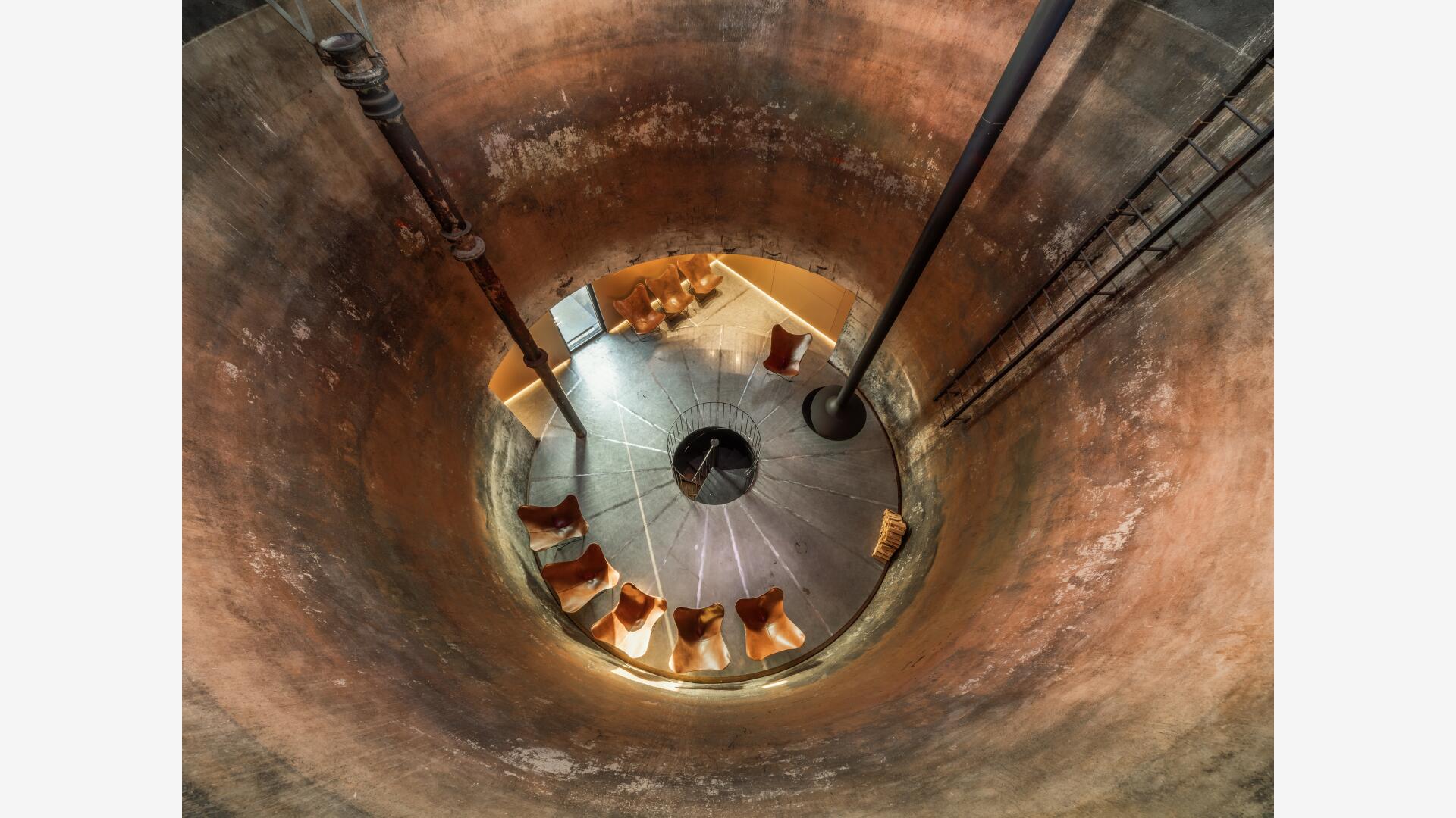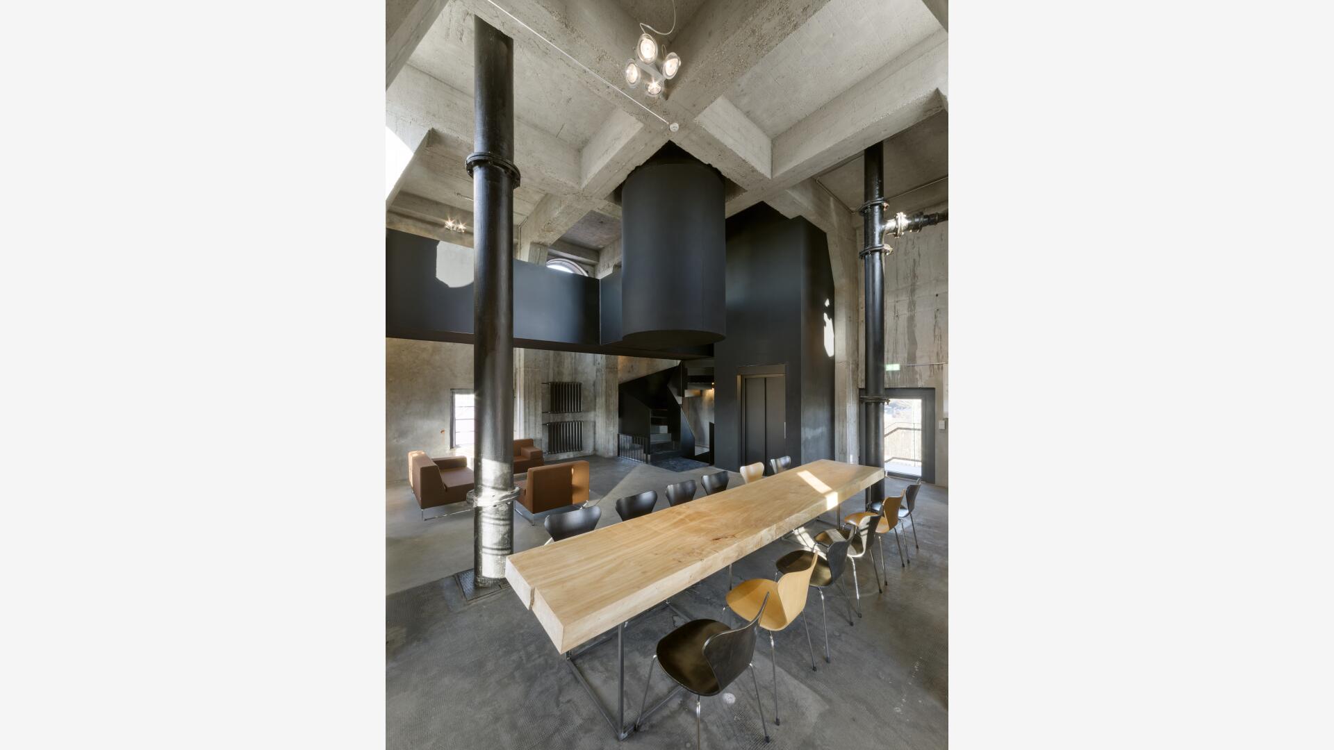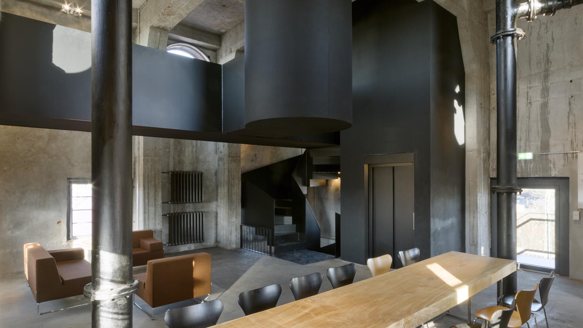 Im Sinne des denkmalgerechten Umgangs mit dem Gebäude bleiben die markante Figur und das Sichtmauerwerk unberührt. Der historische Tank bleibt erhalten und wird horizontal aufgesägt. In den Turmgeschossen verbindet eine als plastisches Element wirkende Stahltreppe die verschiedenen Räume. Eingeschobene Fluchtbalkone und ein Schaufenster zum Saal im Erdgeschoss machen das Innenräumliche nach außen hin sichtbar.