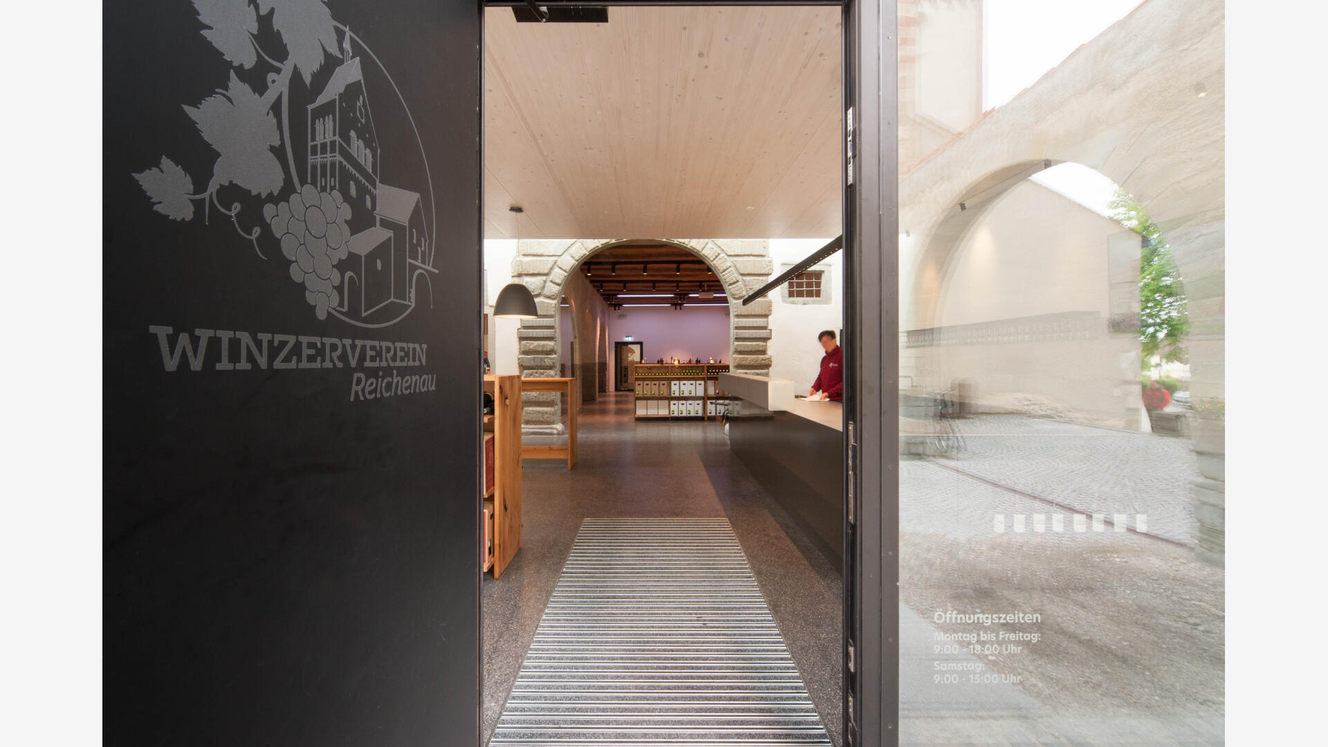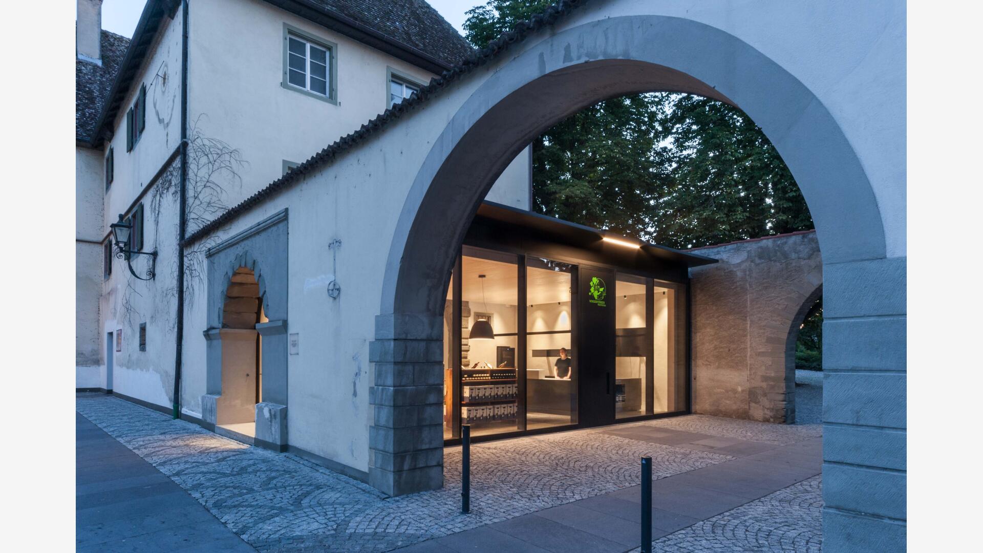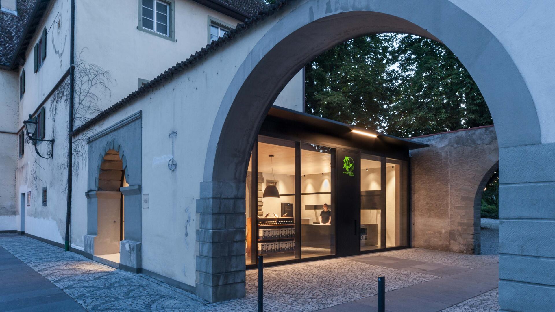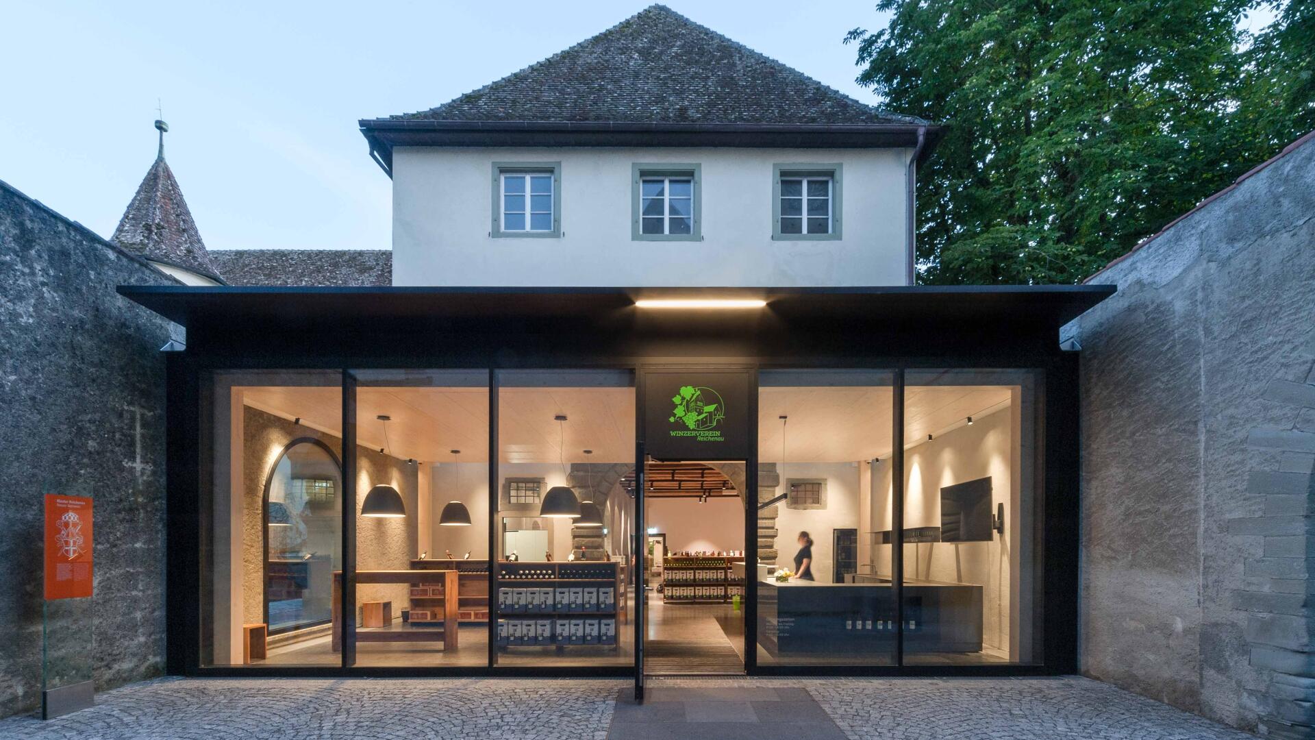 Auf der Klosterinsel befindet sich das Münster (Baujahr 1505-1511). Seit über 100 Jahren keltert der Winzerverein Reichenau seine Weine in den weitläufigen Kellerräumen. Aufgabe war es, den westlichen Konventsflügel, zu sanieren und für den Winzerverein um einen repräsentativen Eingangsbereich mit Degustationsmöglichkeit zu erweitern. Der Neubau fügt sich zurückhaltend aber zeitgemäß in den historischen Kontext ein. Eingeschoben zwischen zwei existierenden Mauerflügeln, die noch die ursprünglichen Außenmauern des Gebäudes bis an die ehemalige Klosterkirche hin markieren, wurde ein einstöckiges Gebäude erstellt, welches - konstruktiv autark - mit nur minimalen Eingriffen am Bestand auskommt. Das historische Steinportal wurde dabei über ein Oberlichtband effektvoll in Szene gesetzt.
