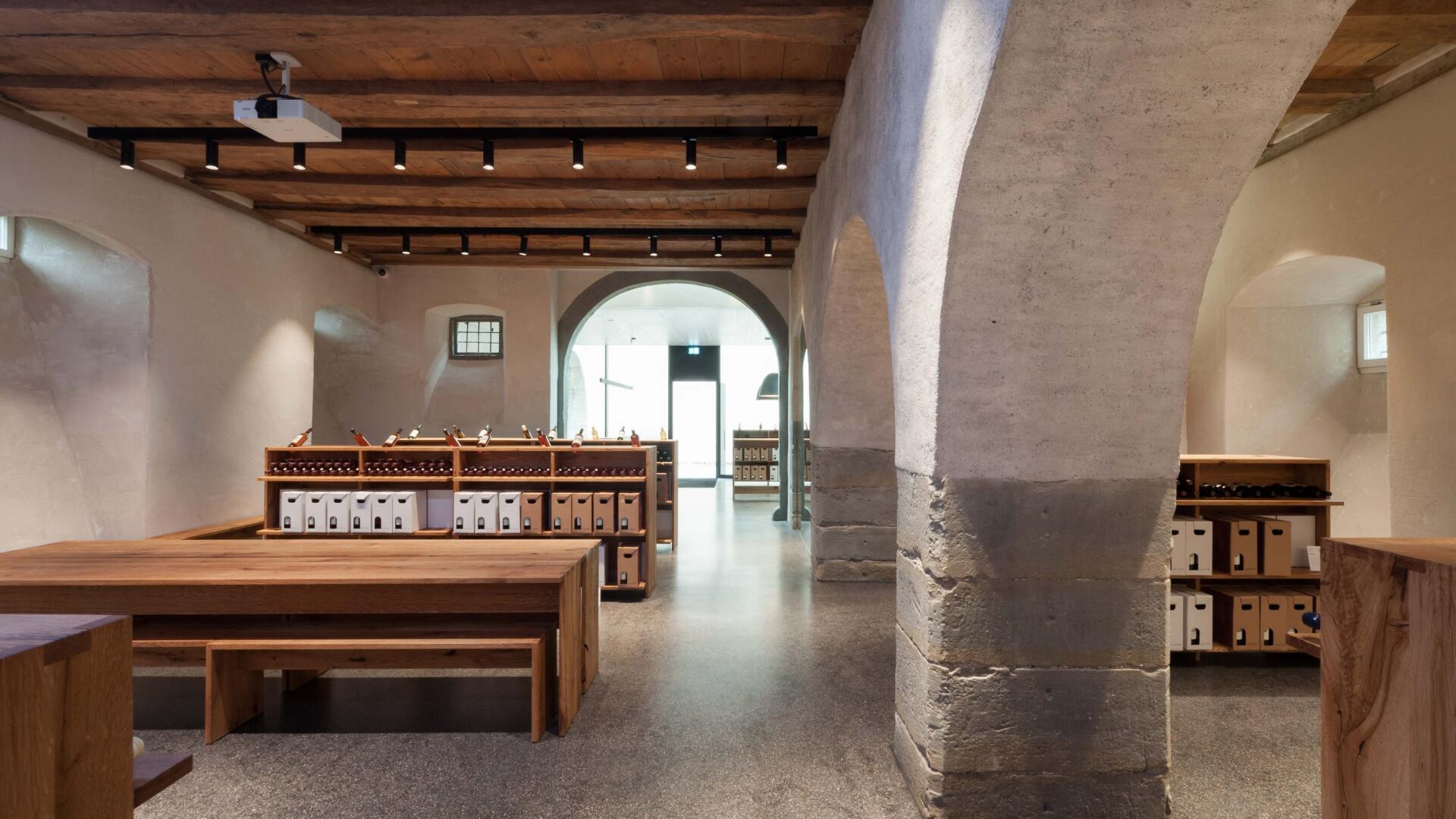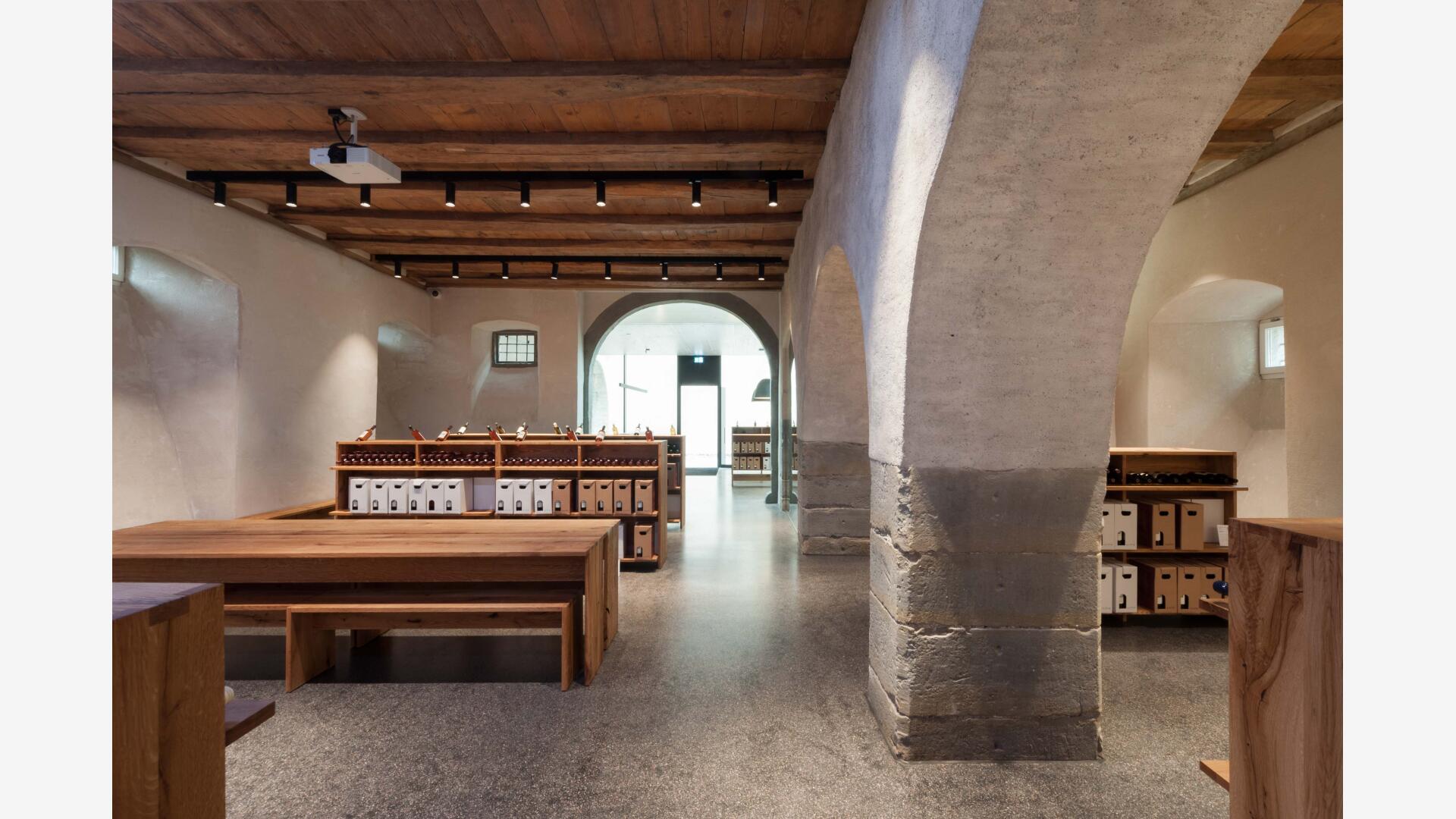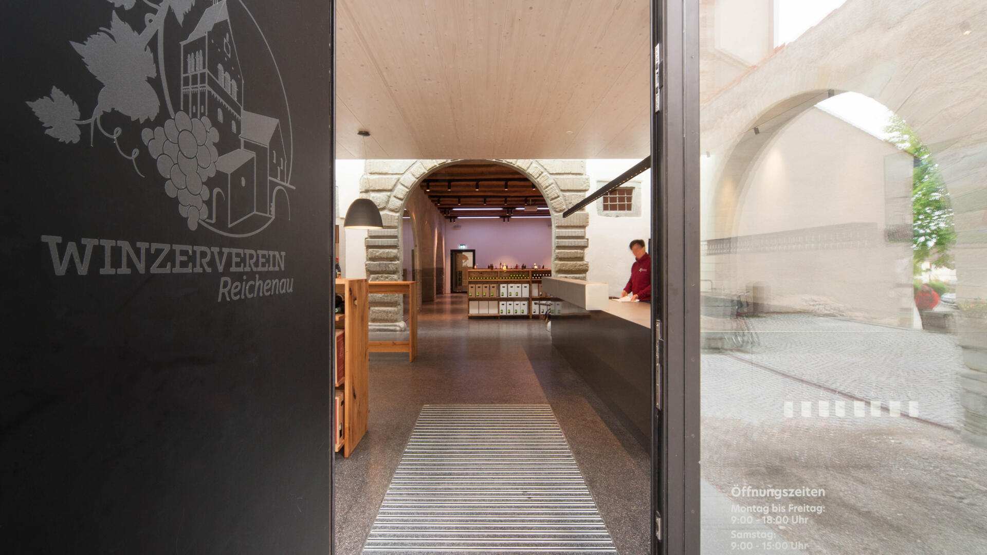 Auf der Klosterinsel befindet sich das Münster (Baujahr 1505-1511). Seit über 100 Jahren keltert der Winzerverein Reichenau seine Weine in den weitläufigen Kellerräumen. Aufgabe war es, den westlichen Konventsflügel, zu sanieren und für den Winzerverein um einen repräsentativen Eingangsbereich mit Degustationsmöglichkeit zu erweitern. Der Neubau fügt sich zurückhaltend aber zeitgemäß in den historischen Kontext ein. Eingeschoben zwischen zwei existierenden Mauerflügeln, die noch die ursprünglichen Außenmauern des Gebäudes bis an die ehemalige Klosterkirche hin markieren, wurde ein einstöckiges Gebäude erstellt, welches - konstruktiv autark - mit nur minimalen Eingriffen am Bestand auskommt. Das historische Steinportal wurde dabei über ein Oberlichtband effektvoll in Szene gesetzt.