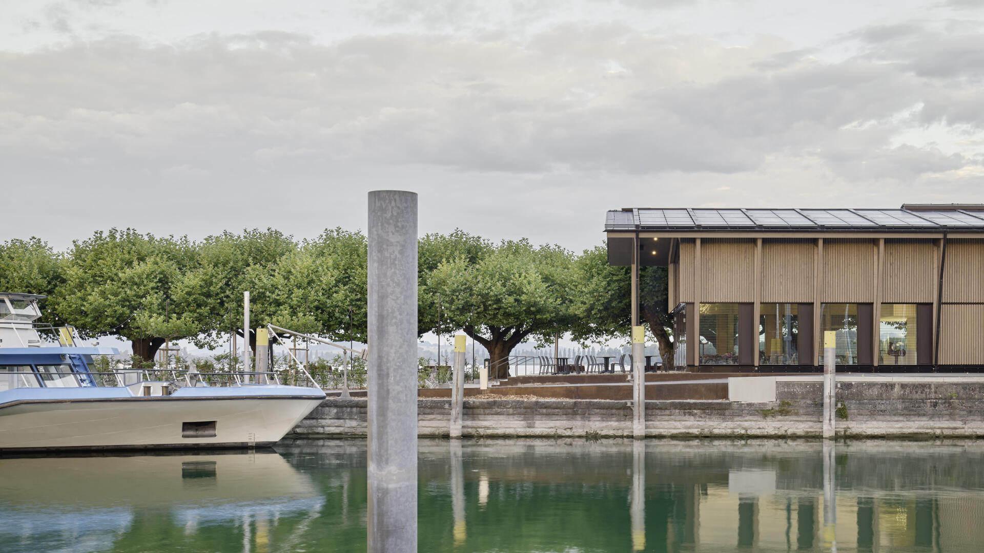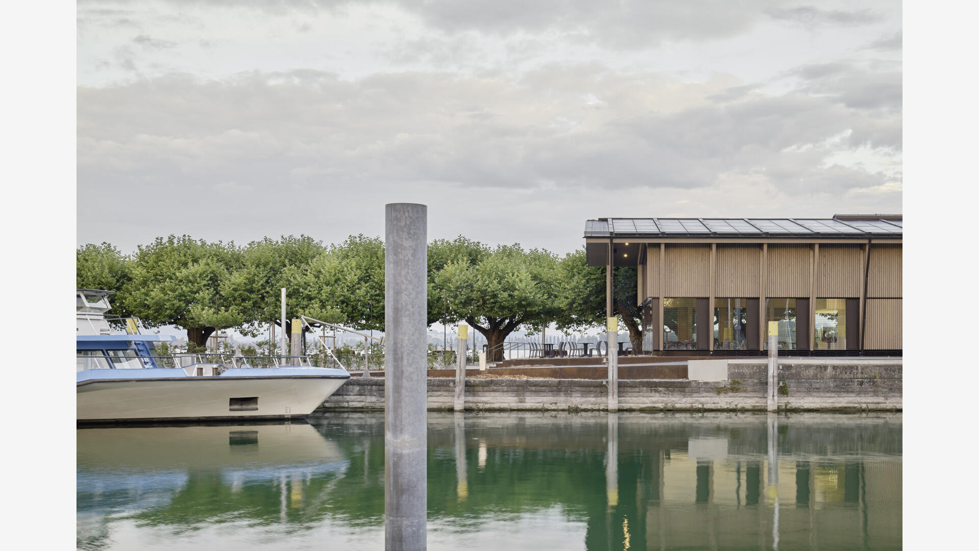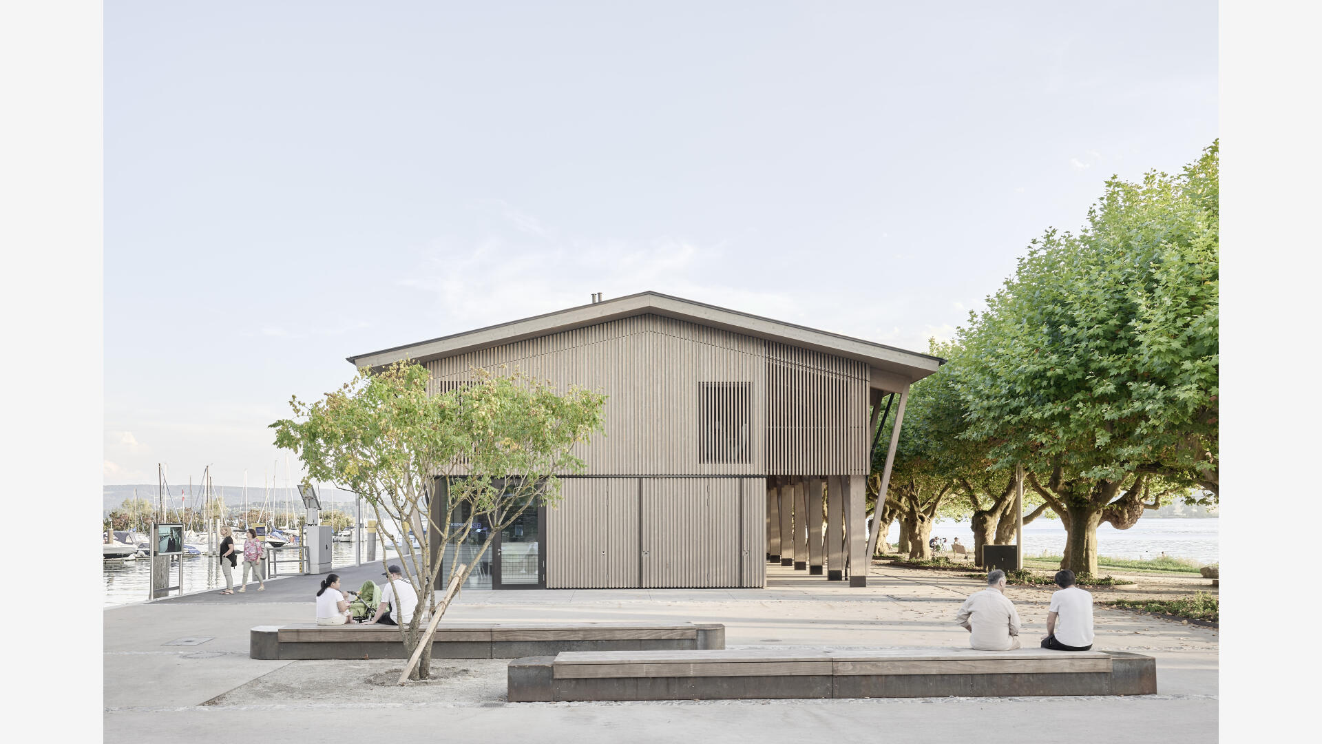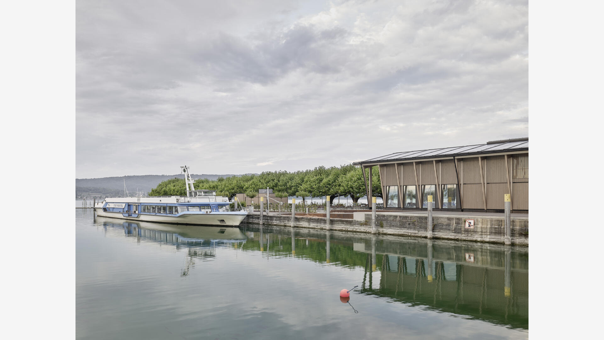 Die Hafenmole in Radolfzell ist einer der prominentesten Orte der Stadt. Die Landzunge ist von drei Seiten im Süden, Osten und Westen vom Bodensee umgeben und trägt dadurch prägend zum Charakter des touristischen Hotspots Radolfzells bei. Das neue Gebäude in Holz-Hybridbauweise bildet keinerlei Rückseite aus, was an dieser prominenten Stelle schlicht nicht möglich wäre. Es beinhaltet eine Gastronomie, ein Ticket- und Informationsbereich der Bodenseeschiffsbetriebe, sowie öffentliche WCs. Das klare Raster der 17 sichtbaren Holzbinder, welche die Halle aufspannen, wird zum gestaltprägenden Element. Mit den zusätzlichen Schrägstützen im Außenbereich, die als Zugstab des Tragwerks fungieren, entsteht so ein Holzhaus, das auf das Wesentliche reduziert wird, mit hohem Wiedererkennungswert.