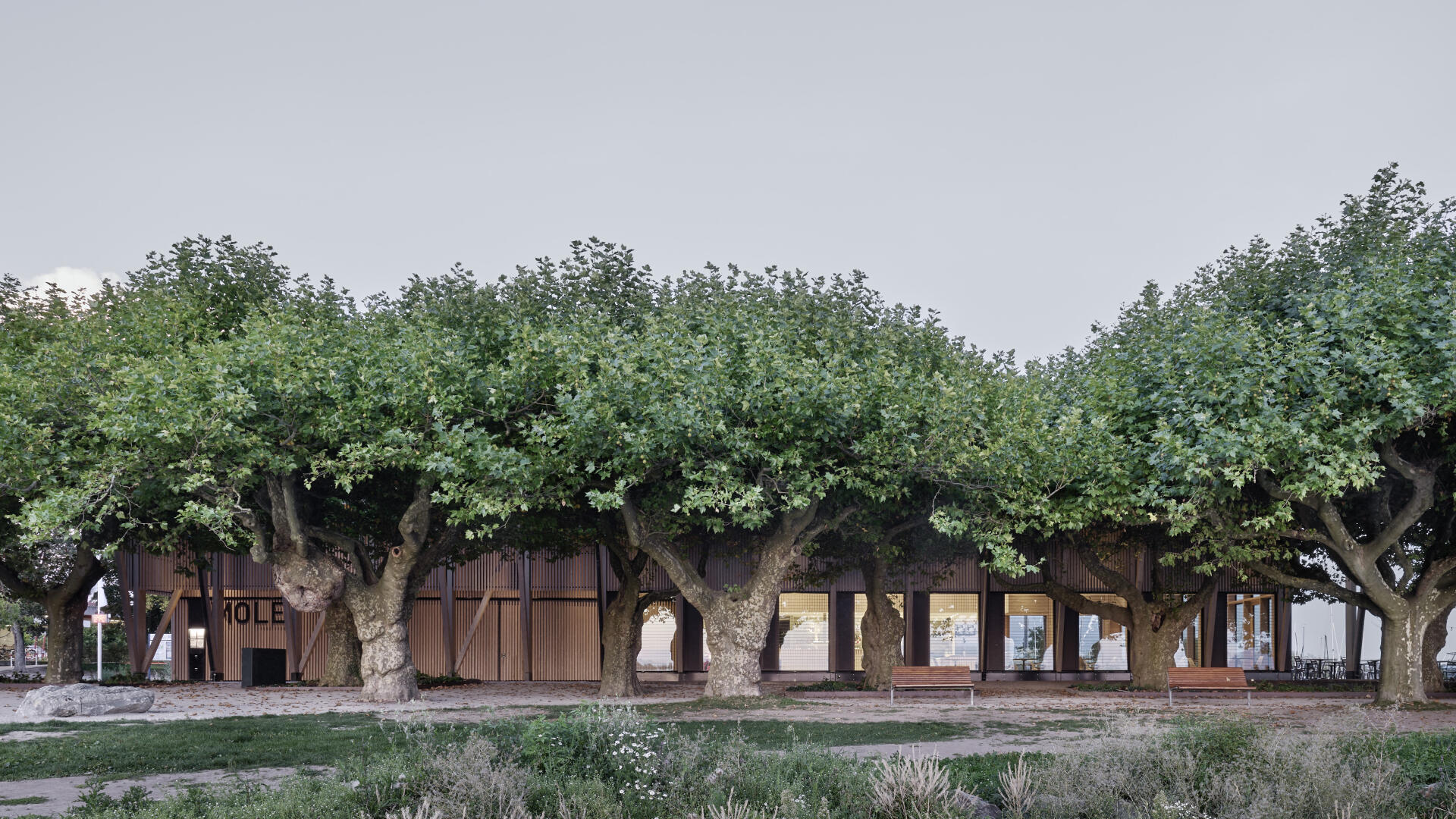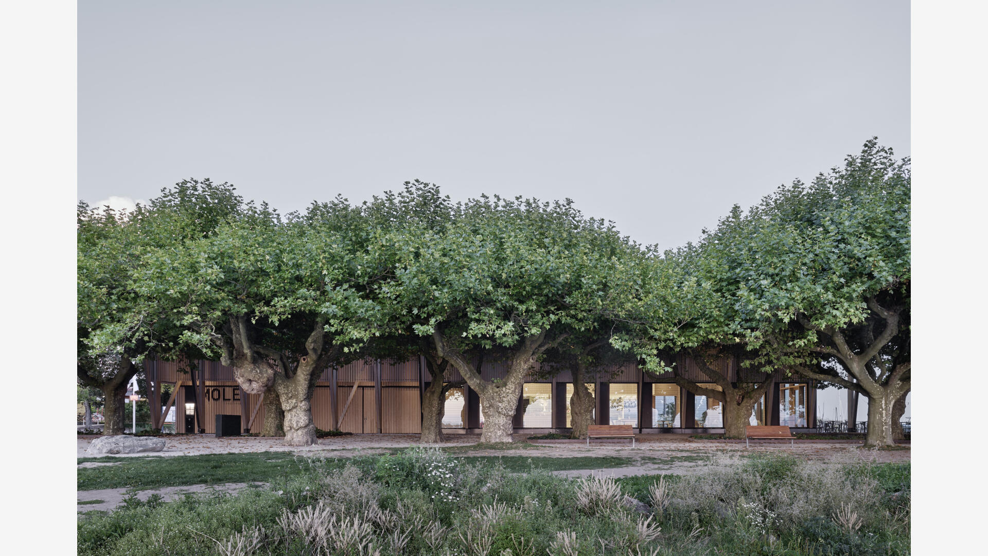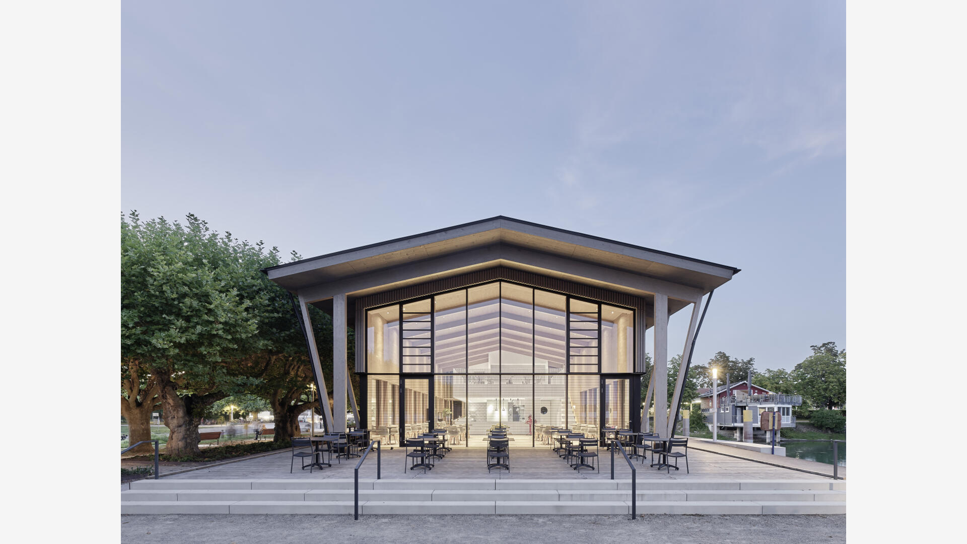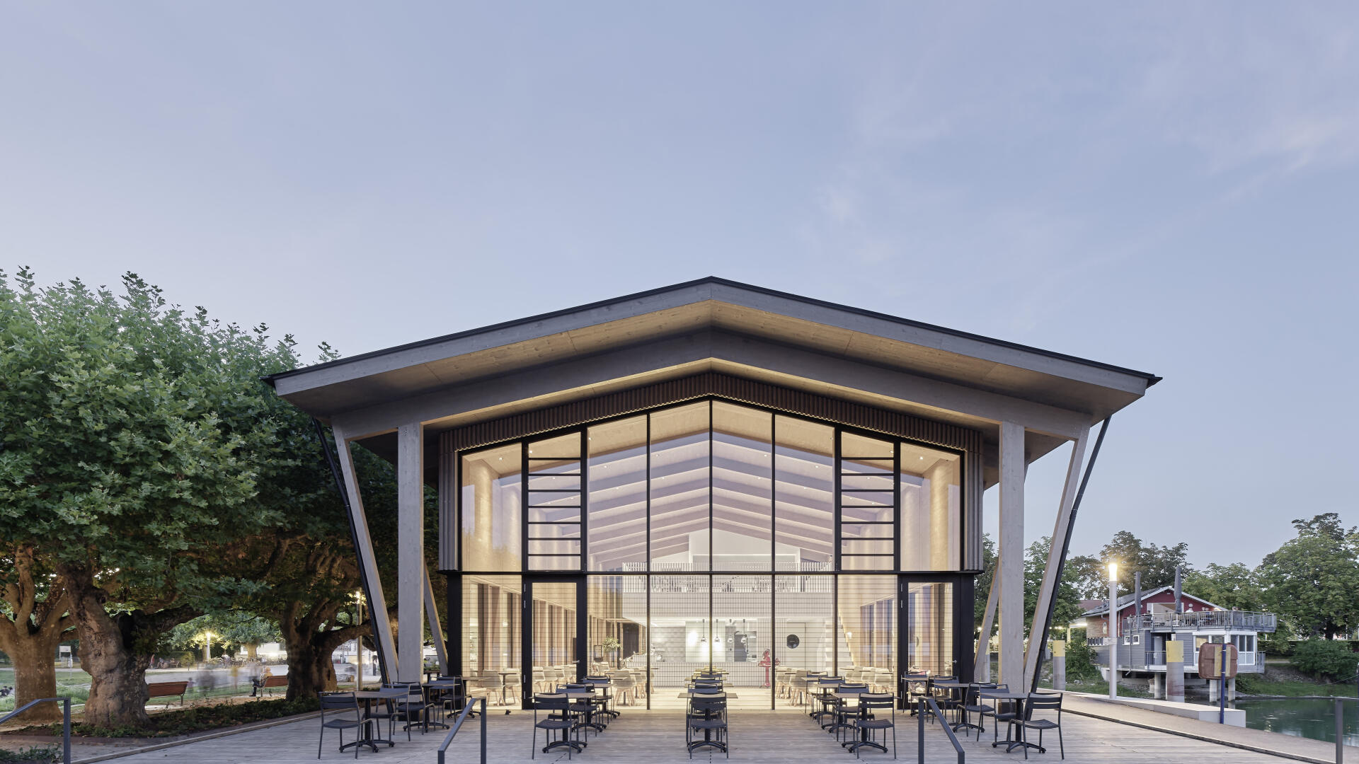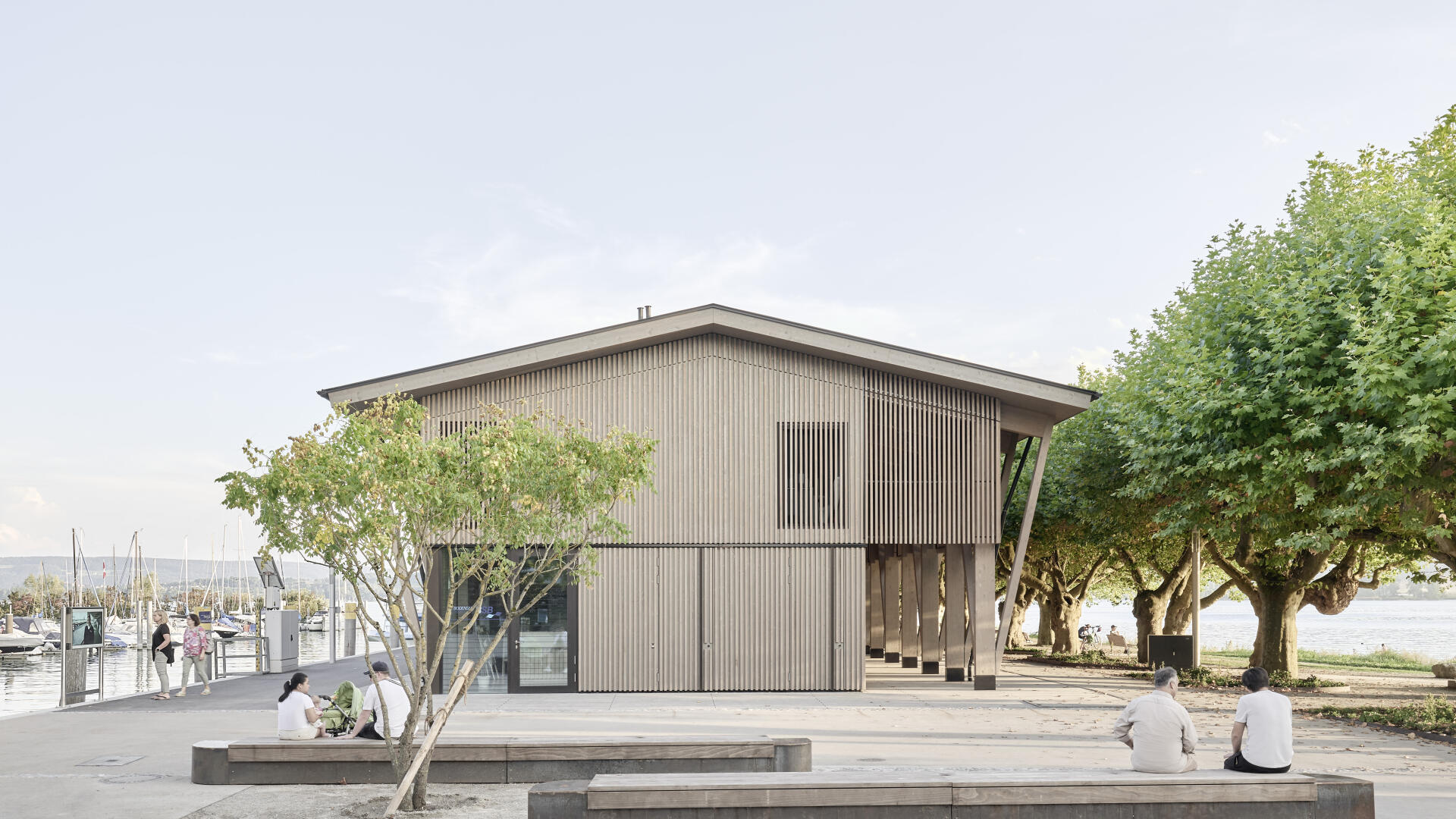 Die Hafenmole in Radolfzell ist einer der prominentesten Orte der Stadt. Die Landzunge ist von drei Seiten im Süden, Osten und Westen vom Bodensee umgeben und trägt dadurch prägend zum Charakter des touristischen Hotspots Radolfzells bei. Das neue Gebäude in Holz-Hybridbauweise bildet keinerlei Rückseite aus, was an dieser prominenten Stelle schlicht nicht möglich wäre. Es beinhaltet eine Gastronomie, ein Ticket- und Informationsbereich der Bodenseeschiffsbetriebe, sowie öffentliche WCs. Das klare Raster der 17 sichtbaren Holzbinder, welche die Halle aufspannen, wird zum gestaltprägenden Element. Mit den zusätzlichen Schrägstützen im Außenbereich, die als Zugstab des Tragwerks fungieren, entsteht so ein Holzhaus, das auf das Wesentliche reduziert wird, mit hohem Wiedererkennungswert.