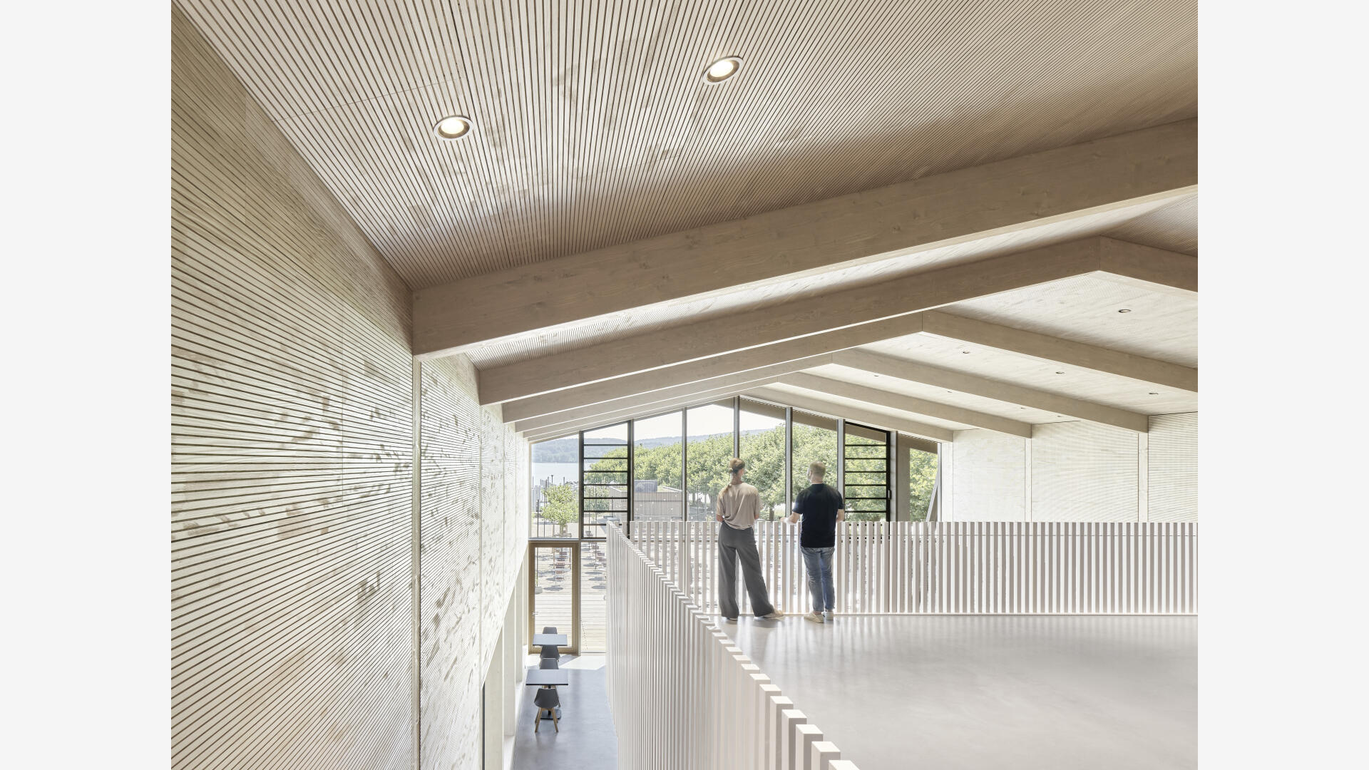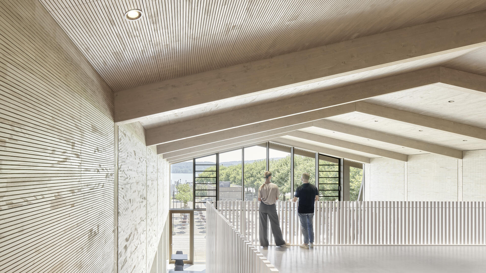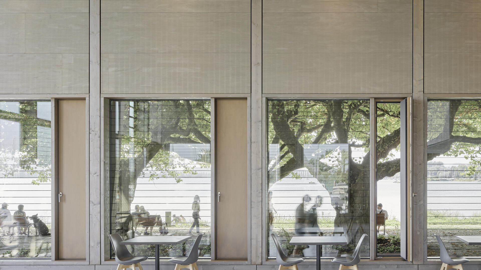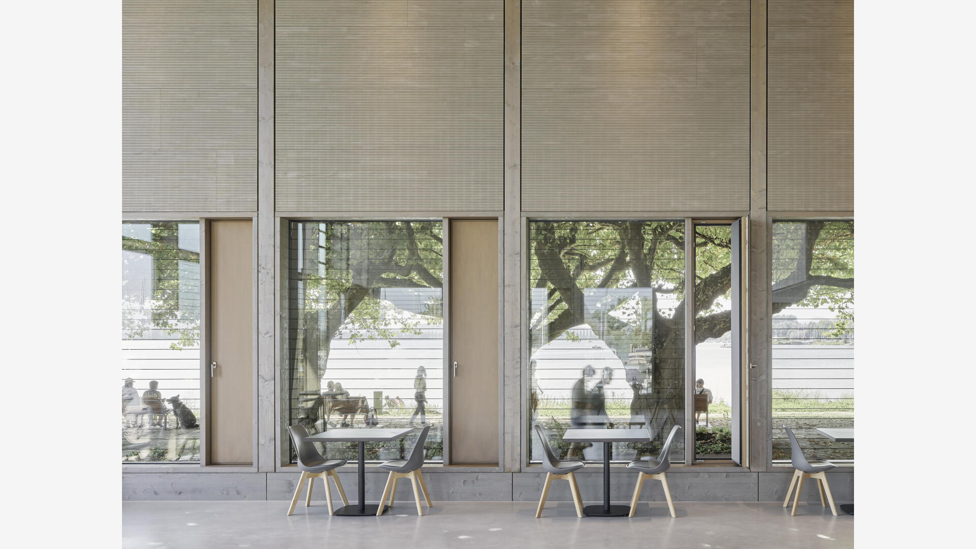Die Hafenmole in Radolfzell ist einer der prominentesten Orte der Stadt. Die Landzunge ist von drei Seiten im Süden, Osten und Westen vom Bodensee umgeben und trägt dadurch prägend zum Charakter des touristischen Hotspots Radolfzells bei. Das neue Gebäude in Holz-Hybridbauweise bildet keinerlei Rückseite aus, was an dieser prominenten Stelle schlicht nicht möglich wäre. Es beinhaltet eine Gastronomie, ein Ticket- und Informationsbereich der Bodenseeschiffsbetriebe, sowie öffentliche WCs. Das klare Raster der 17 sichtbaren Holzbinder, welche die Halle aufspannen, wird zum gestaltprägenden Element. Mit den zusätzlichen Schrägstützen im Außenbereich, die als Zugstab des Tragwerks fungieren, entsteht so ein Holzhaus, das auf das Wesentliche reduziert wird, mit hohem Wiedererkennungswert.