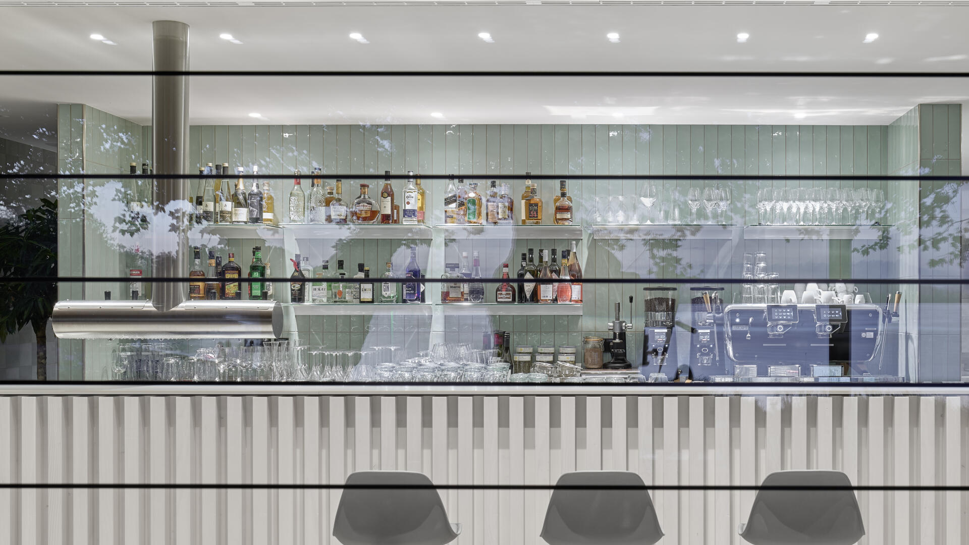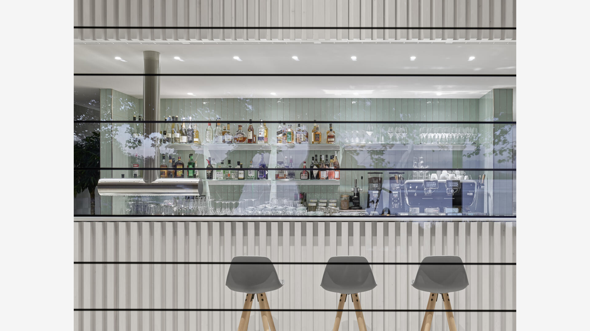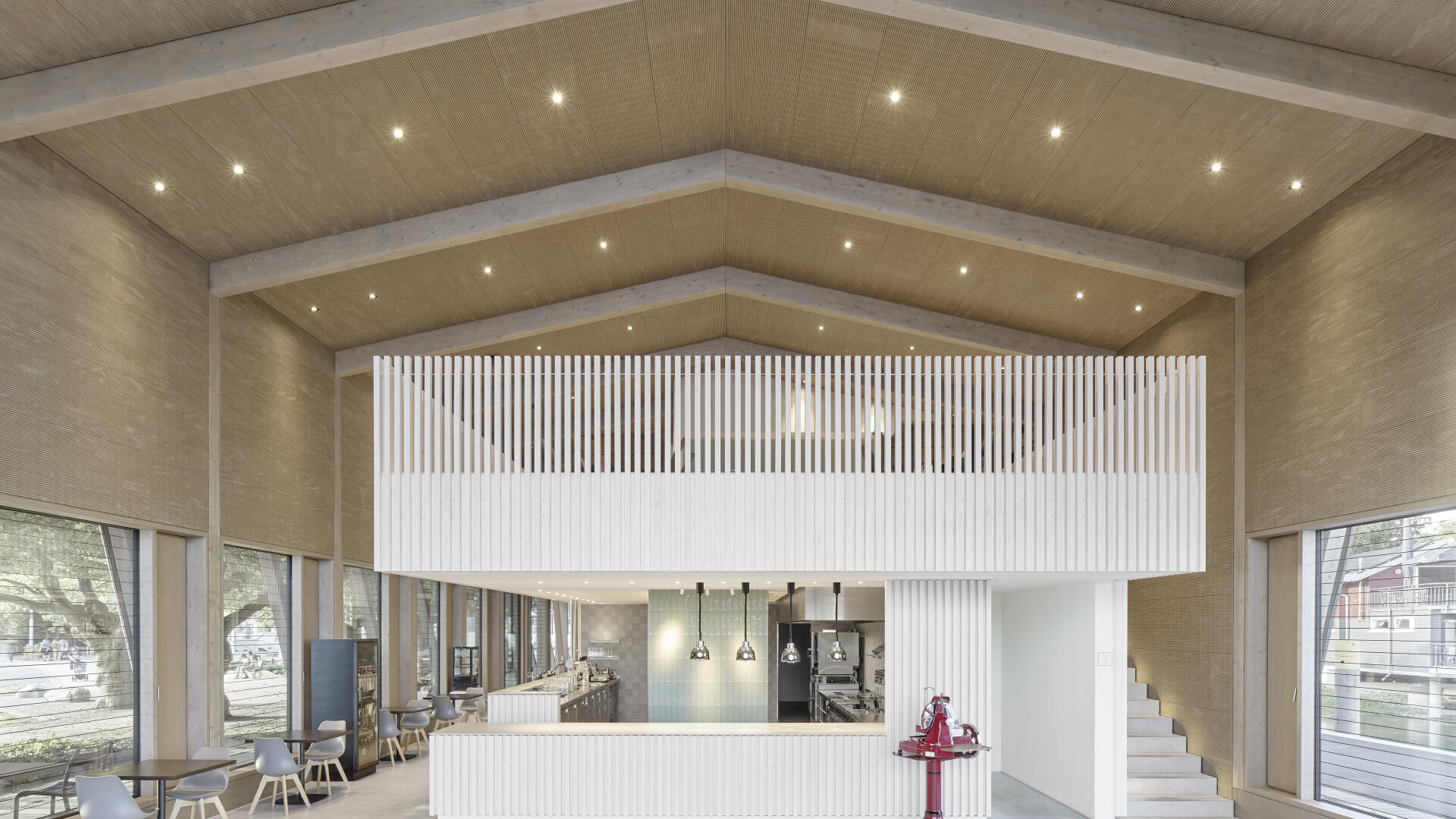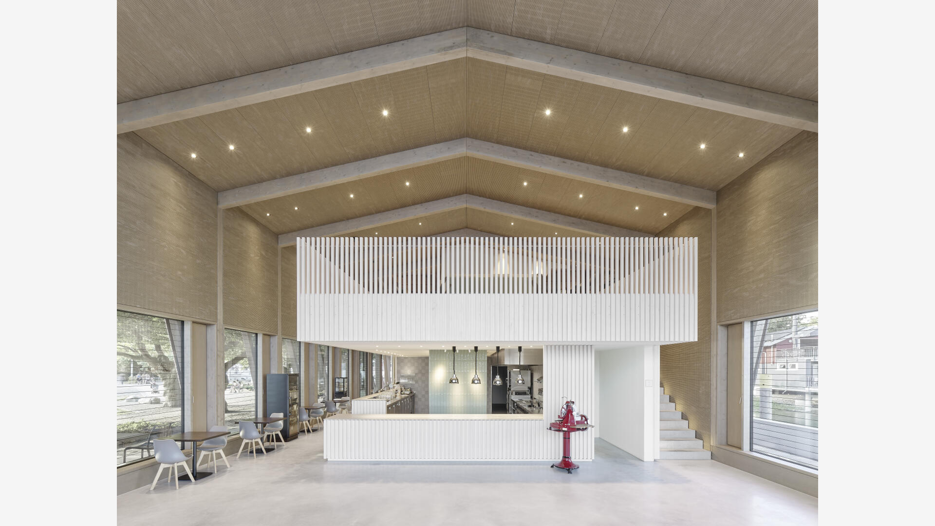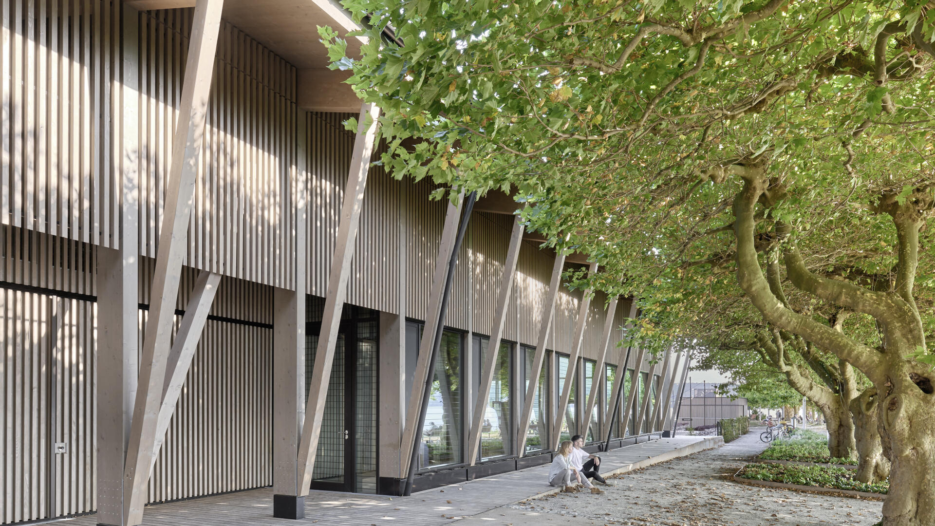 Die Hafenmole in Radolfzell ist einer der prominentesten Orte der Stadt. Die Landzunge ist von drei Seiten im Süden, Osten und Westen vom Bodensee umgeben und trägt dadurch prägend zum Charakter des touristischen Hotspots Radolfzells bei. Das neue Gebäude in Holz-Hybridbauweise bildet keinerlei Rückseite aus, was an dieser prominenten Stelle schlicht nicht möglich wäre. Es beinhaltet eine Gastronomie, ein Ticket- und Informationsbereich der Bodenseeschiffsbetriebe, sowie öffentliche WCs. Das klare Raster der 17 sichtbaren Holzbinder, welche die Halle aufspannen, wird zum gestaltprägenden Element. Mit den zusätzlichen Schrägstützen im Außenbereich, die als Zugstab des Tragwerks fungieren, entsteht so ein Holzhaus, das auf das Wesentliche reduziert wird, mit hohem Wiedererkennungswert.