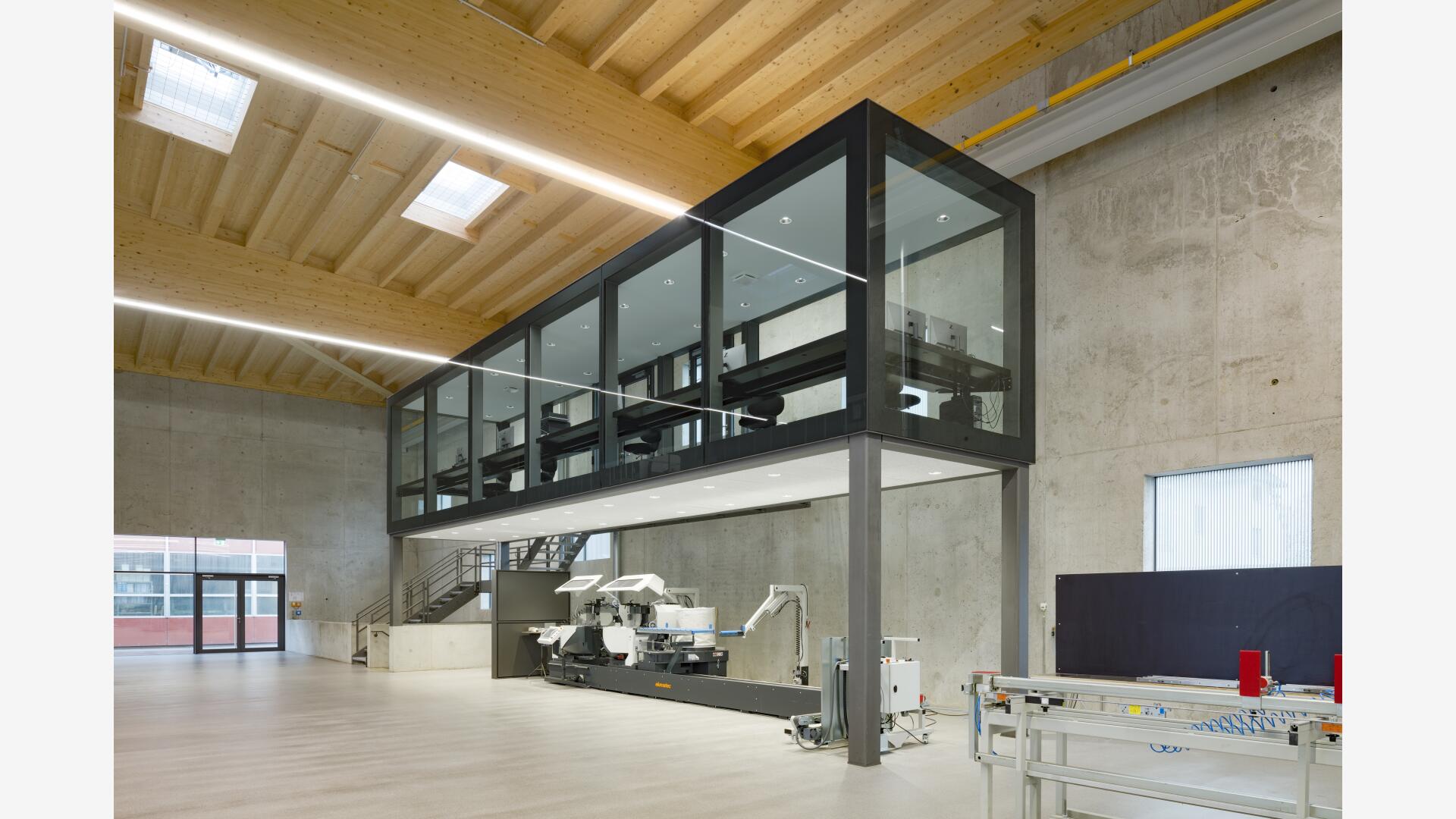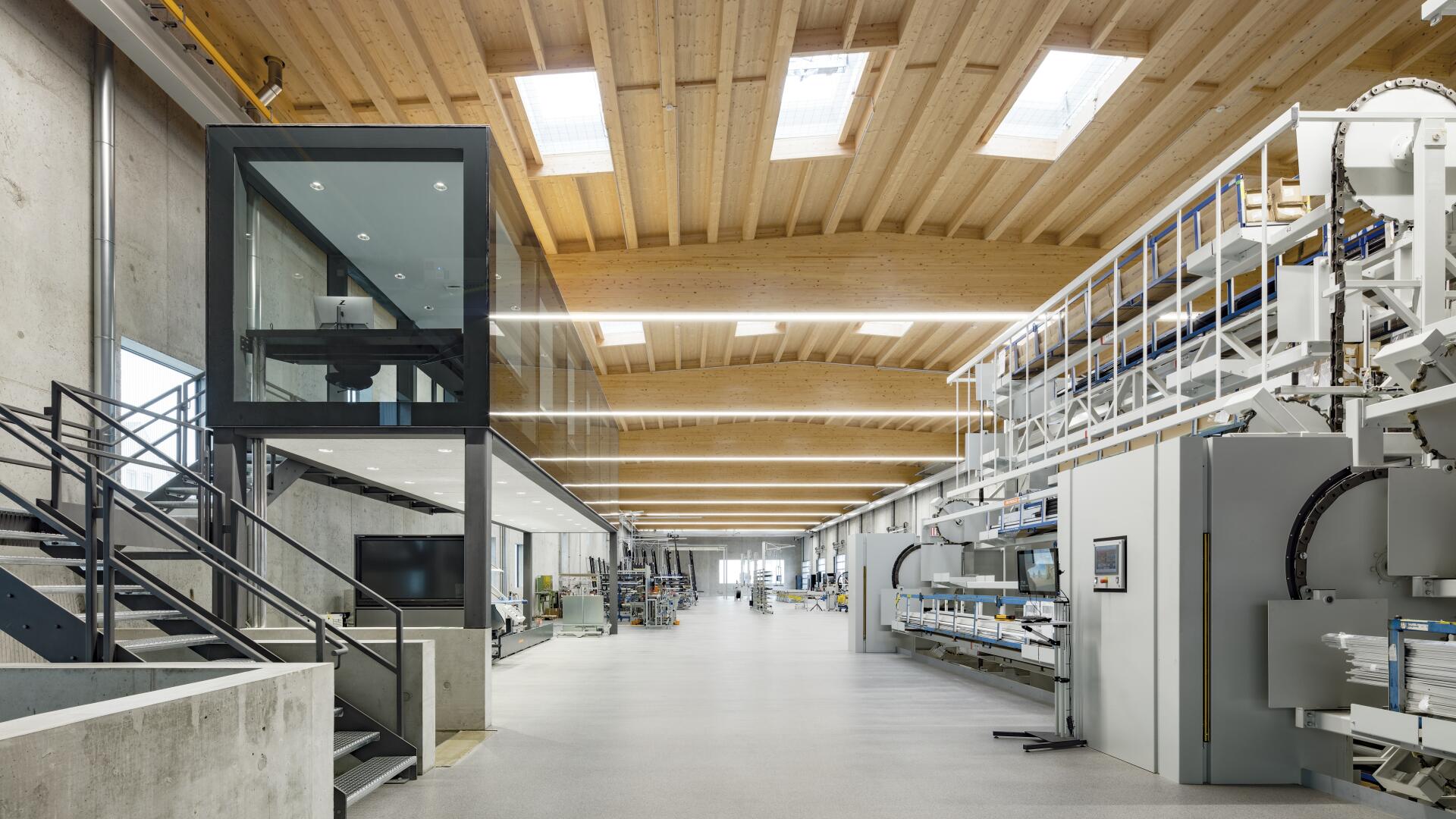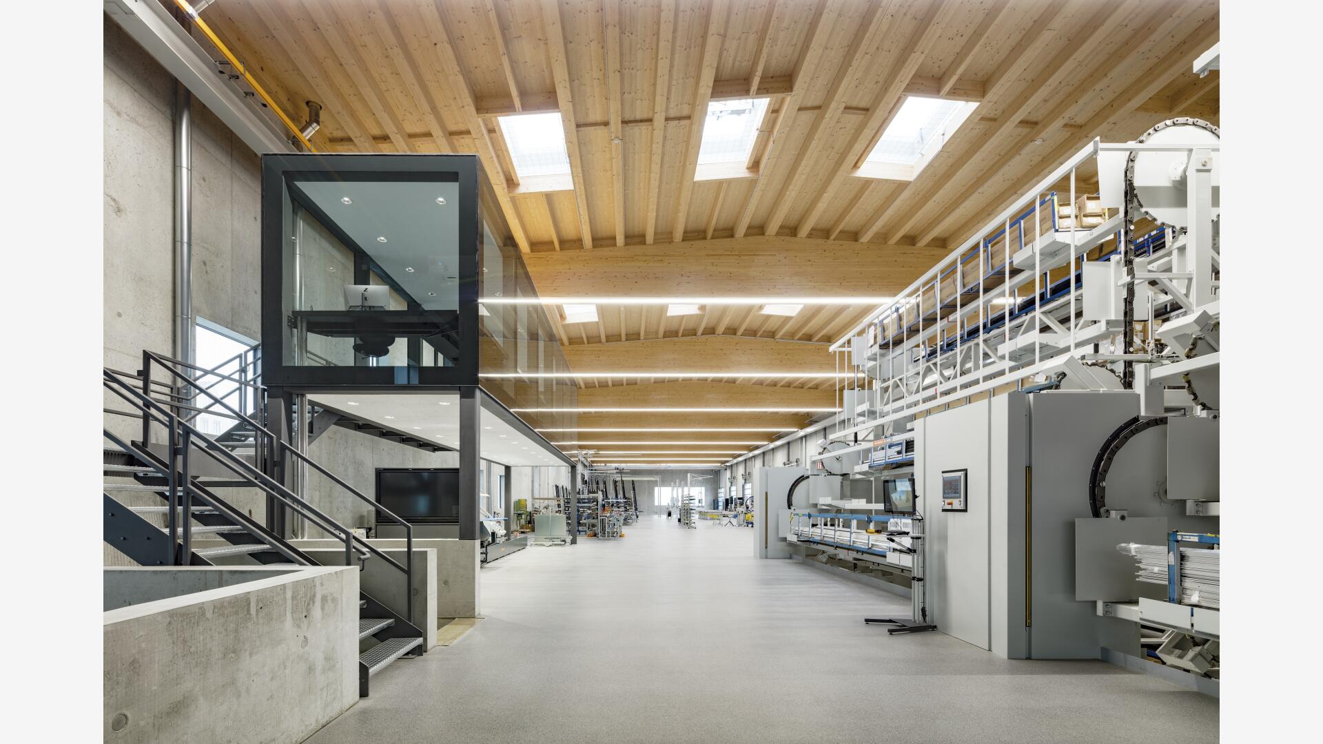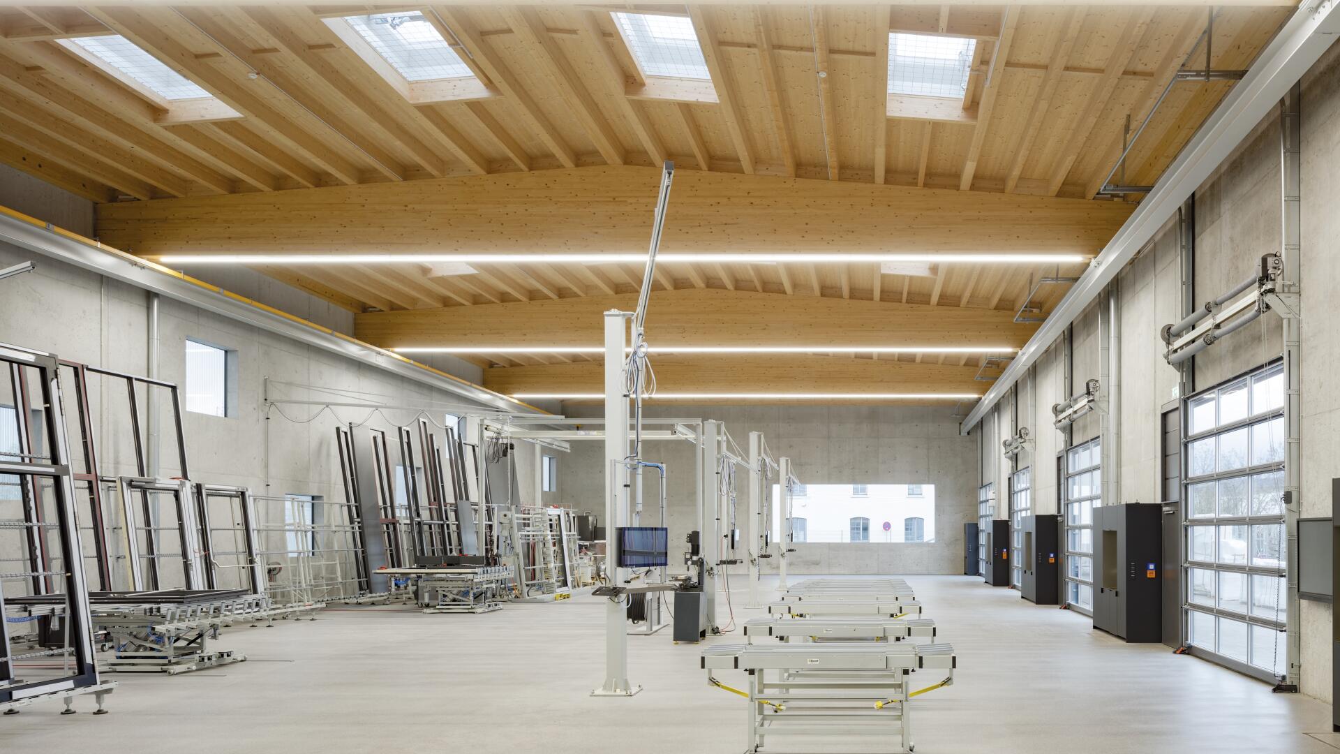 Die Besonderheit in diesem Projekt war es die statischen, wärmetechnischen und schallschutzrelevanten Anforderungen, die an eine moderne Produktionsstätte gestellt werden, nachhaltig zu erfüllen und ebenso die Nutzbarkeit nicht einzuschränken. Zudem war der Wunsch des Bauherrn, seinen innovativen Fassadenbaubetrieb durch ein entsprechend qualitätvolles und modernes Gebäude zu repräsentieren sowie hochwertige Arbeitsplätze zu bieten. Hierbei wurde eine unbewehrte Leichtebetonbauweise mit Sichtbetonoberfläche entwickelt, die ein stützenfreies Tragwerk trotz großer Spannweiten ermöglicht.