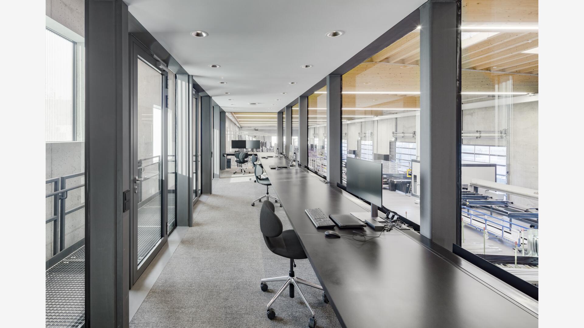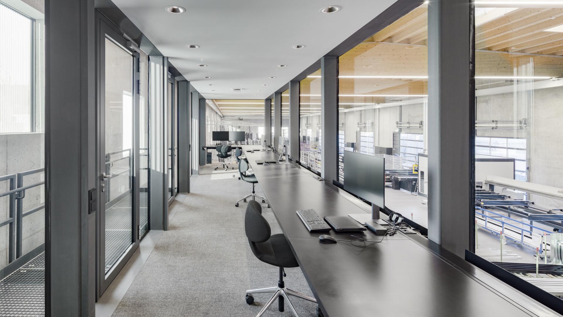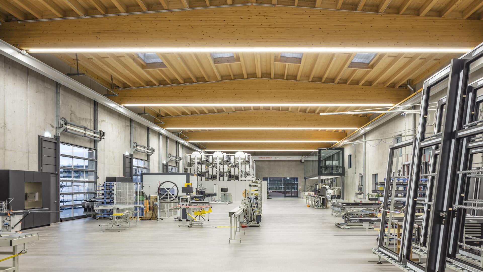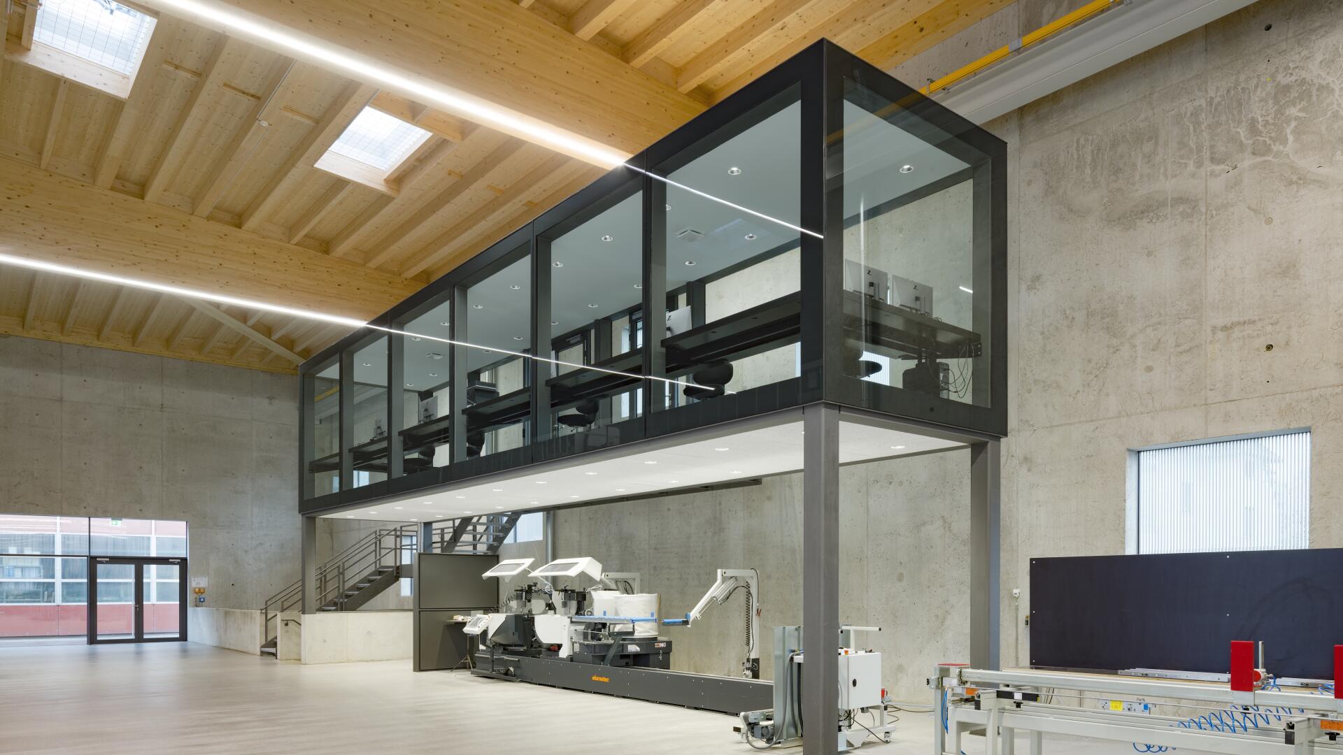 Die Besonderheit in diesem Projekt war es die statischen, wärmetechnischen und schallschutzrelevanten Anforderungen, die an eine moderne Produktionsstätte gestellt werden, nachhaltig zu erfüllen und ebenso die Nutzbarkeit nicht einzuschränken. Zudem war der Wunsch des Bauherrn, seinen innovativen Fassadenbaubetrieb durch ein entsprechend qualitätvolles und modernes Gebäude zu repräsentieren sowie hochwertige Arbeitsplätze zu bieten. Hierbei wurde eine unbewehrte Leichtebetonbauweise mit Sichtbetonoberfläche entwickelt, die ein stützenfreies Tragwerk trotz großer Spannweiten ermöglicht.