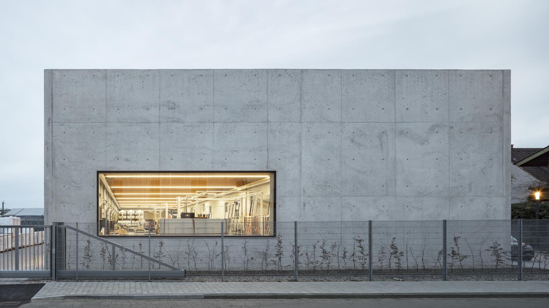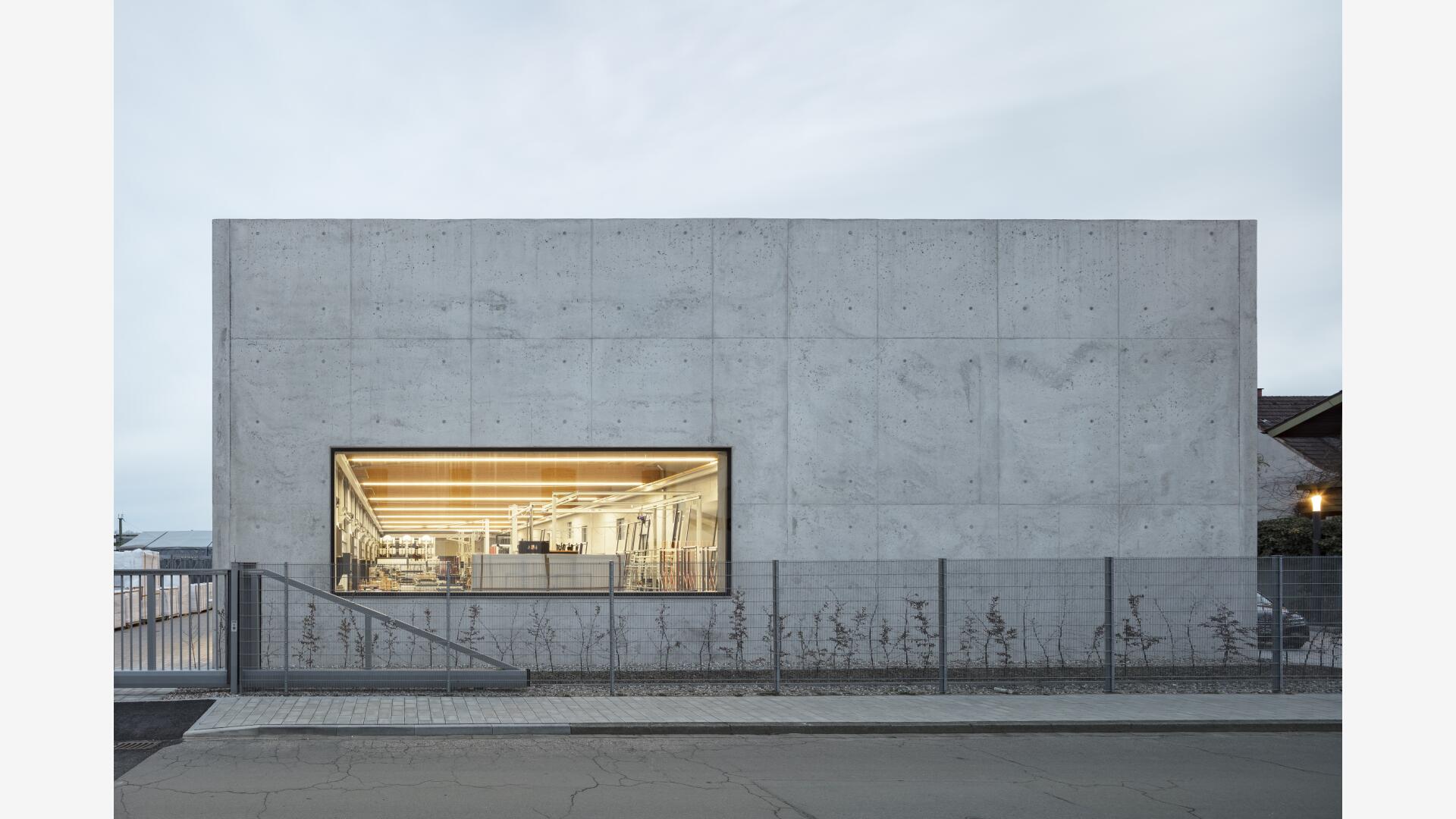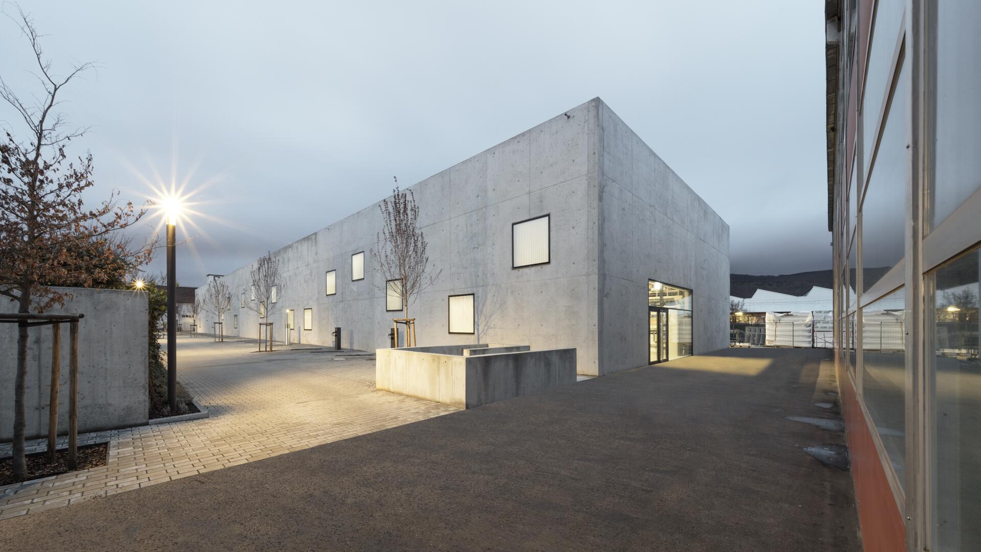 Eine Werkhalle als monolithischer Körper aus unbewehrtem Leichtbeton, der Fenster und Öffnungen paradigmatisch thematisiert, steht erfahrbar für Verantwortung, Nachhaltigkeit und Innovation im Alltag.