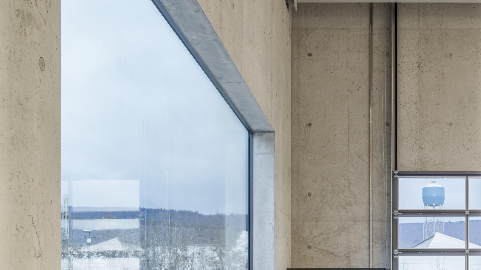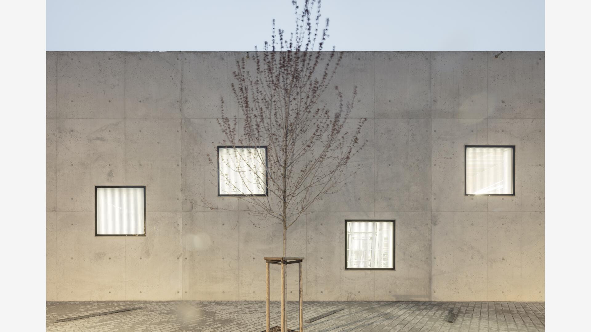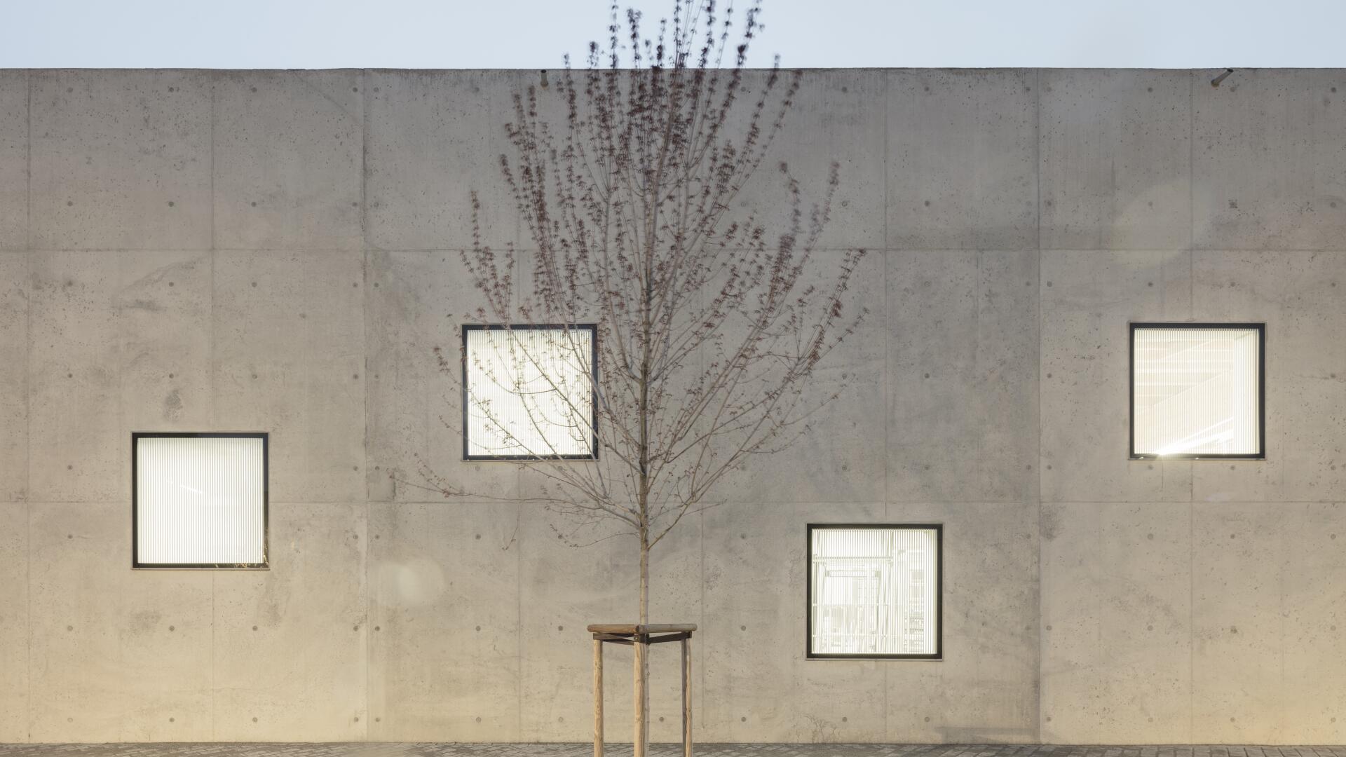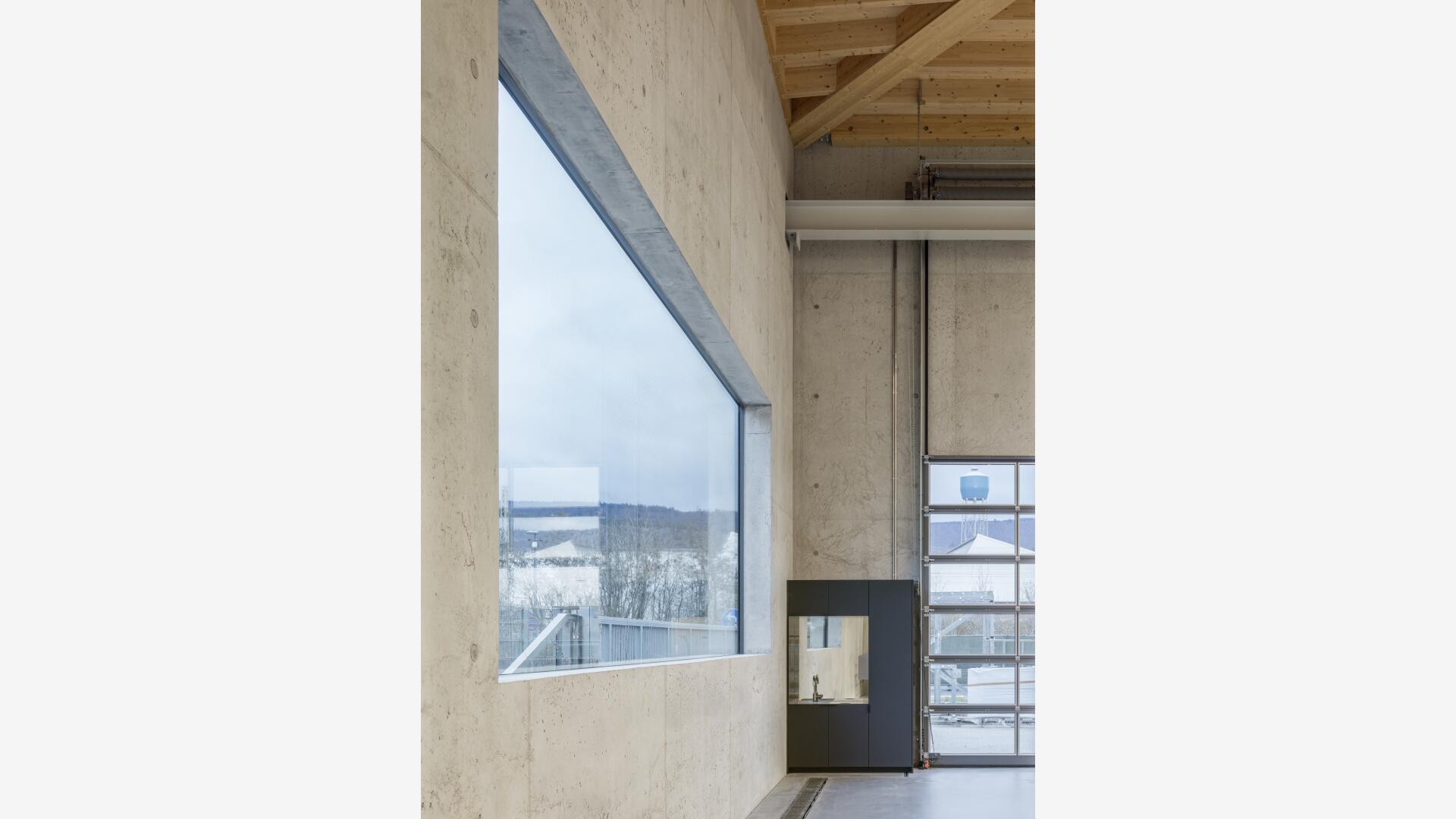 Eine Werkhalle als monolithischer Körper aus unbewehrtem Leichtbeton, der Fenster und Öffnungen paradigmatisch thematisiert, steht erfahrbar für Verantwortung, Nachhaltigkeit und Innovation im Alltag.