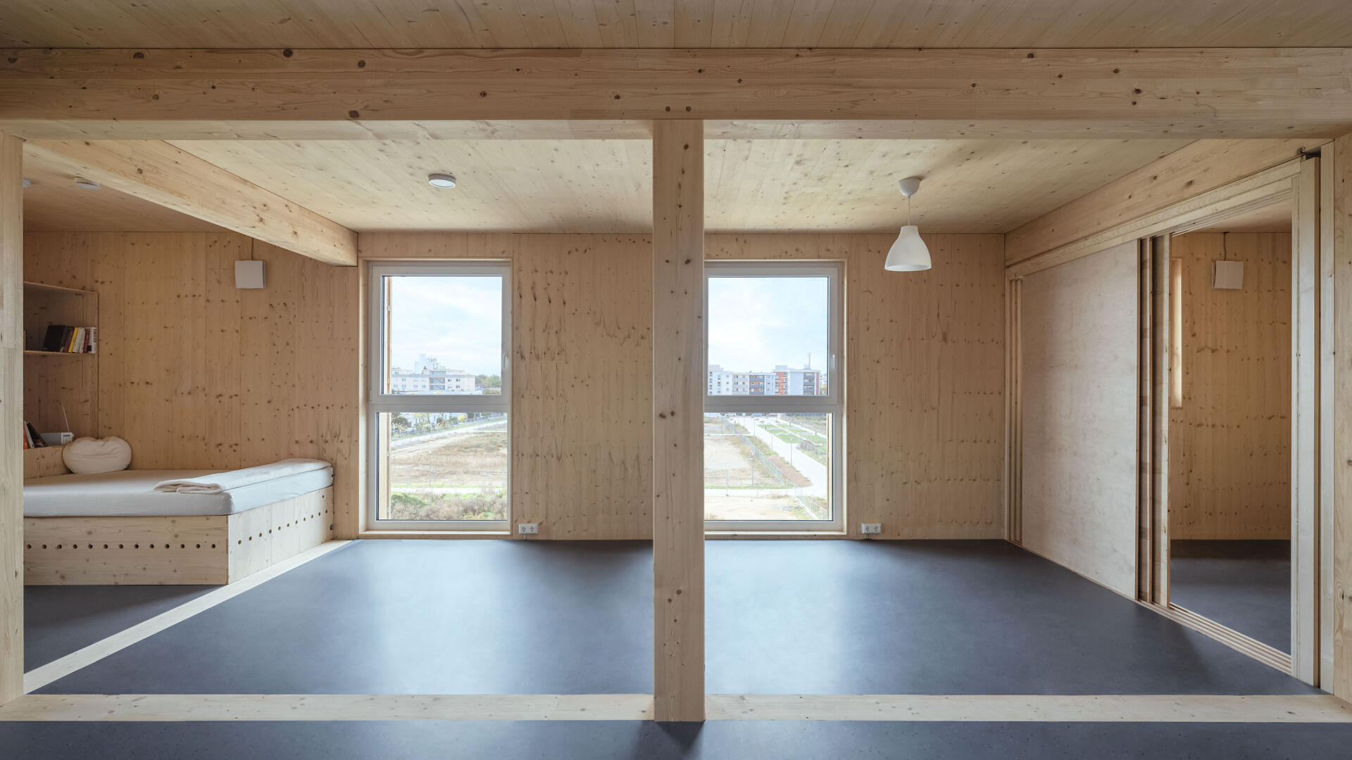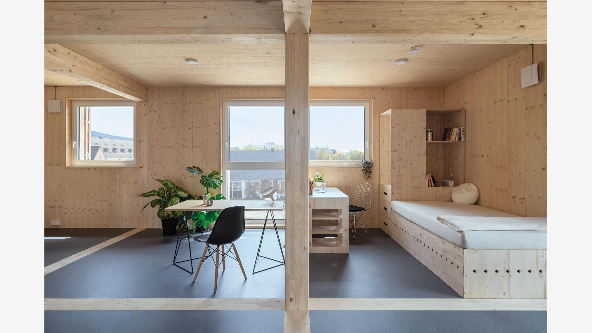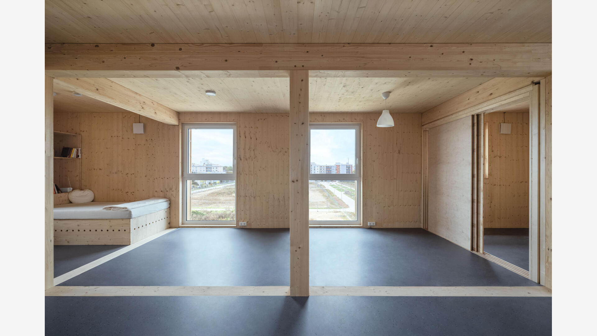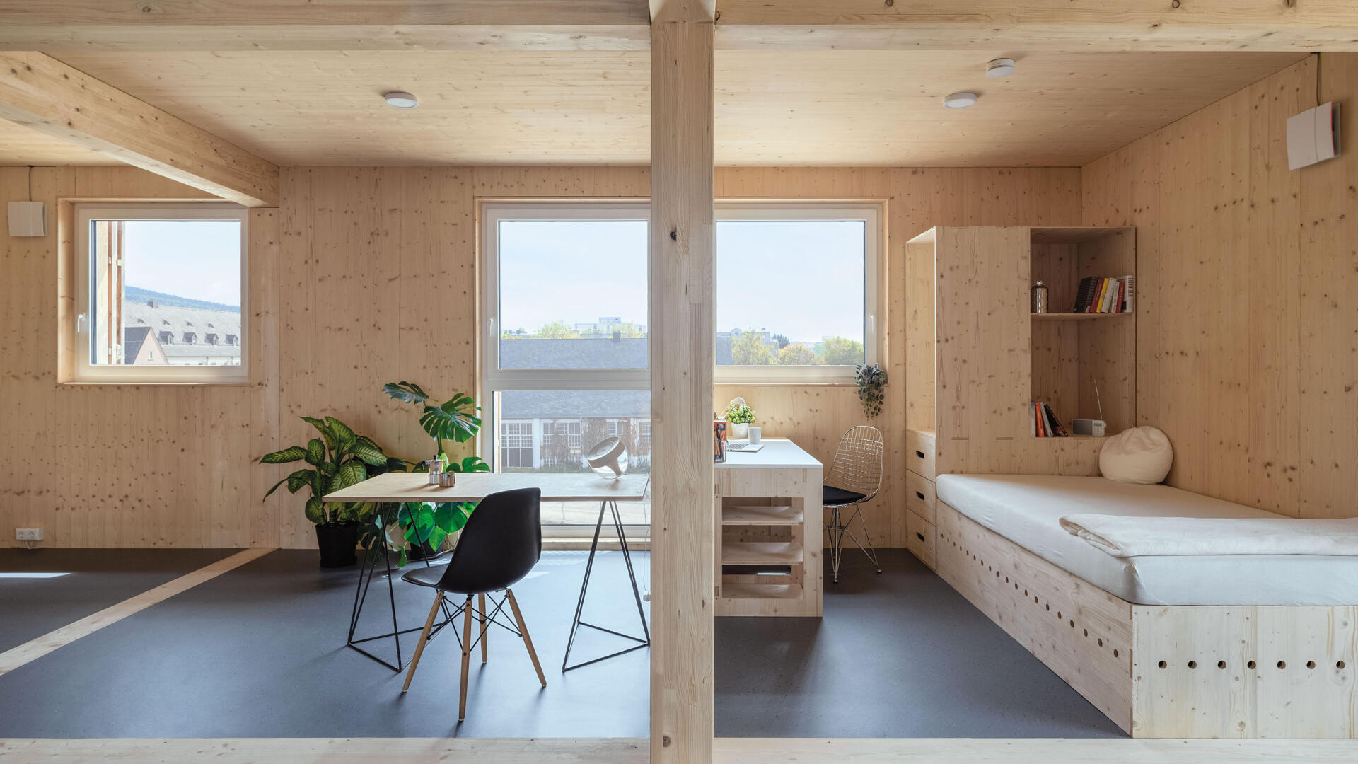 Innovative Holzbauweise: Flexible Grundrisse. Erste mehrgeschossige Holzarchitektur mit 5.000 Quadratmetern NF ohne Stahlverbindungen. Primärkonstruktion ausschließlich aus Zimmermannsverbindungen. Selbstbau/Versetzen der Innenwände zu jeder Zeit bei laufendem Betrieb. Günstiger Wohnraum für Studierende mit selbstverwaltetem, sozial-ökologischem Zusammenleben, flächensparendes Wohnen mit hoher Lebensqualität (Suffizienz), pro Kopf 20,7qm Wohnfläche. Das Gebäude wird zum Labor, in dem Bewohnende Raumbedarf, Nutzung und Zuschnitt der Wohnungen rekonfigurieren. 176 Wohnplätzen, Versammlungsstätte, Werkstatt, Multifunktionsraum, Außenraum. KFW40-Plus Gebäude, bilanziell Plus-Energie mit PV-Anlage und Batteriespeicher. Hohe Recyclingrate, CO2-Ersparnis, praktisch klimaneutrale Bauweise.
