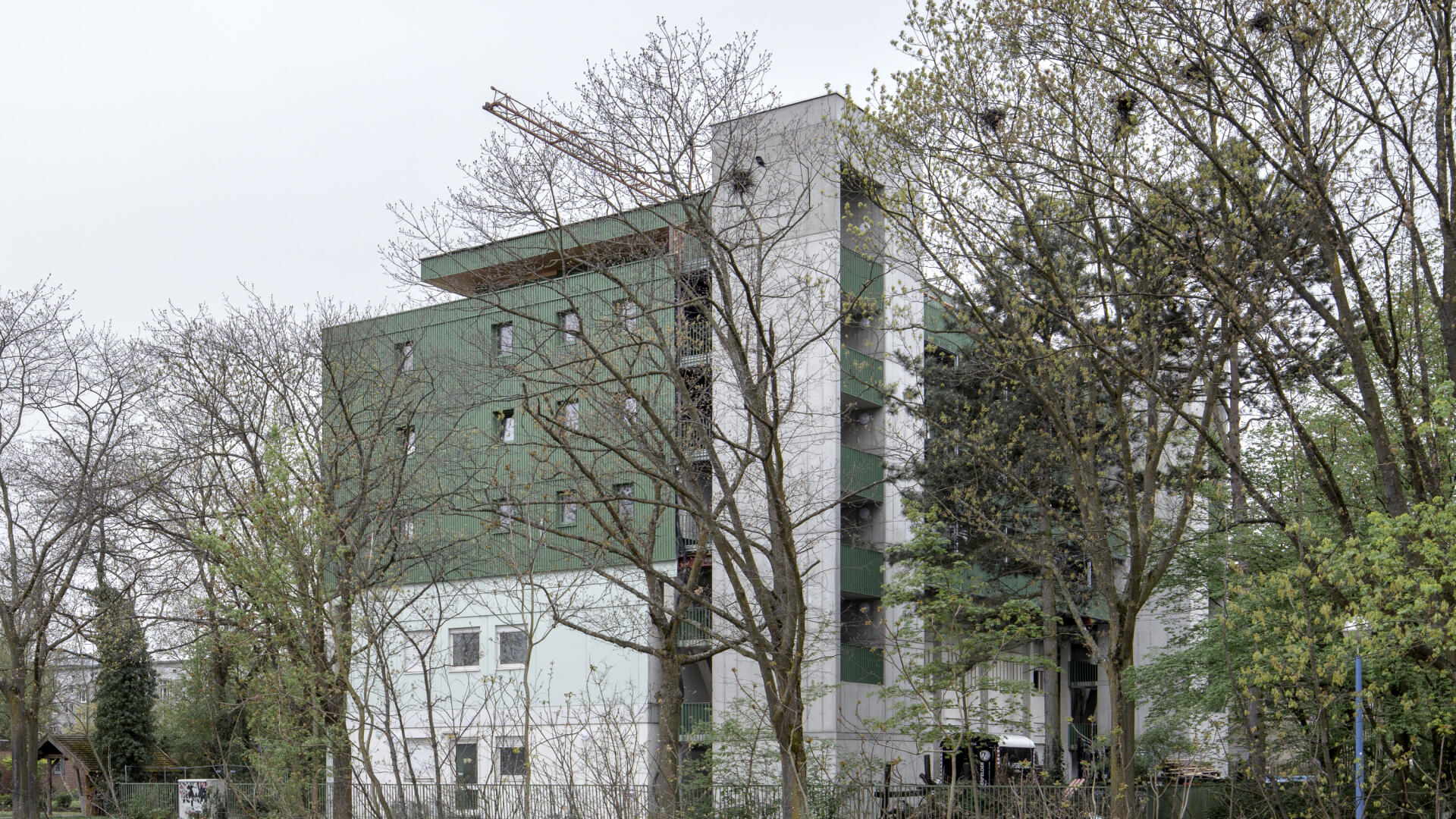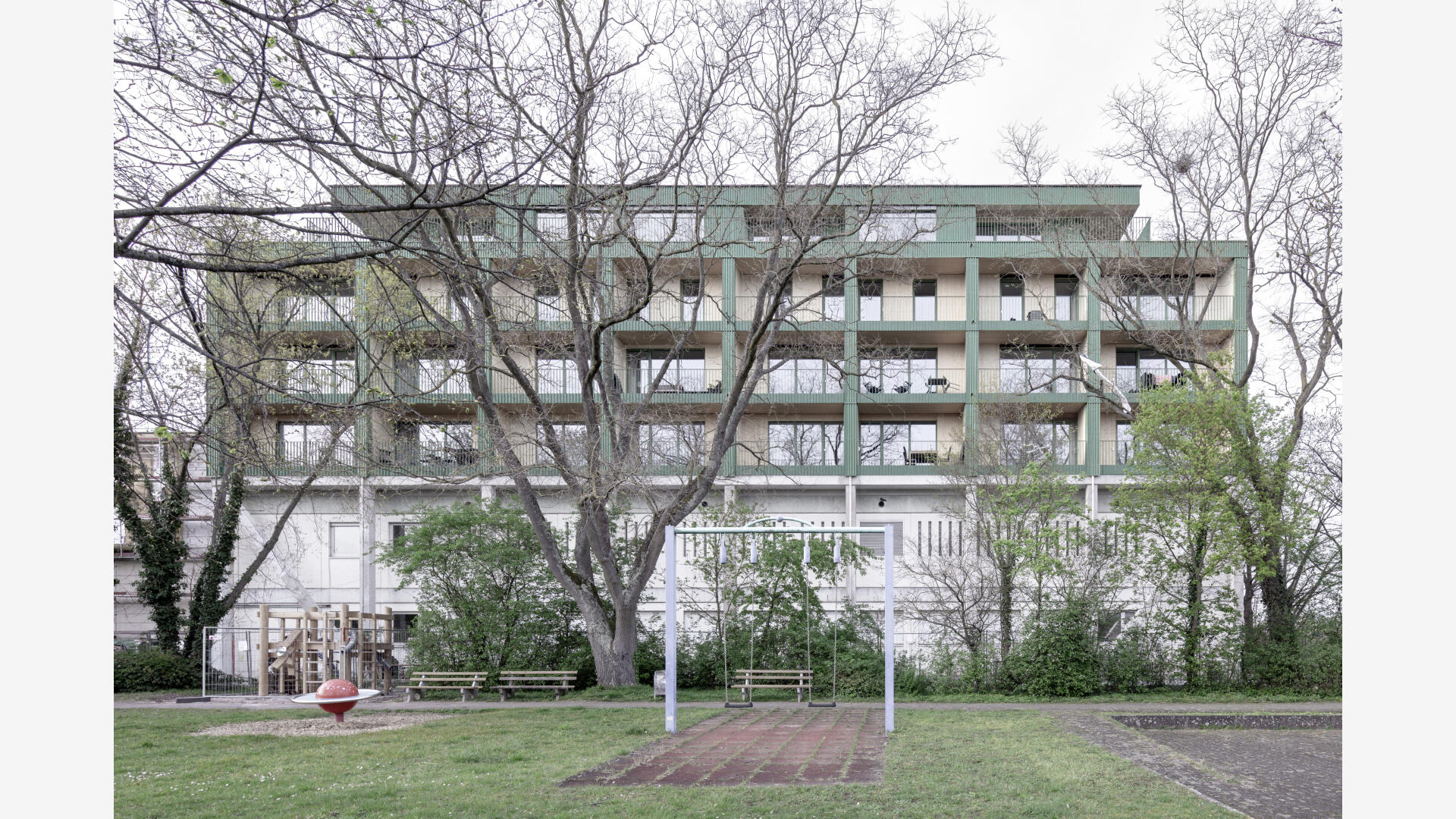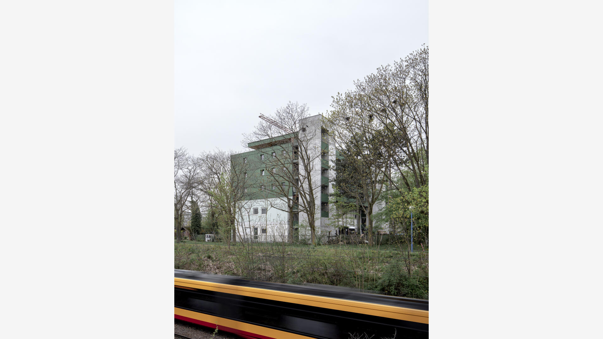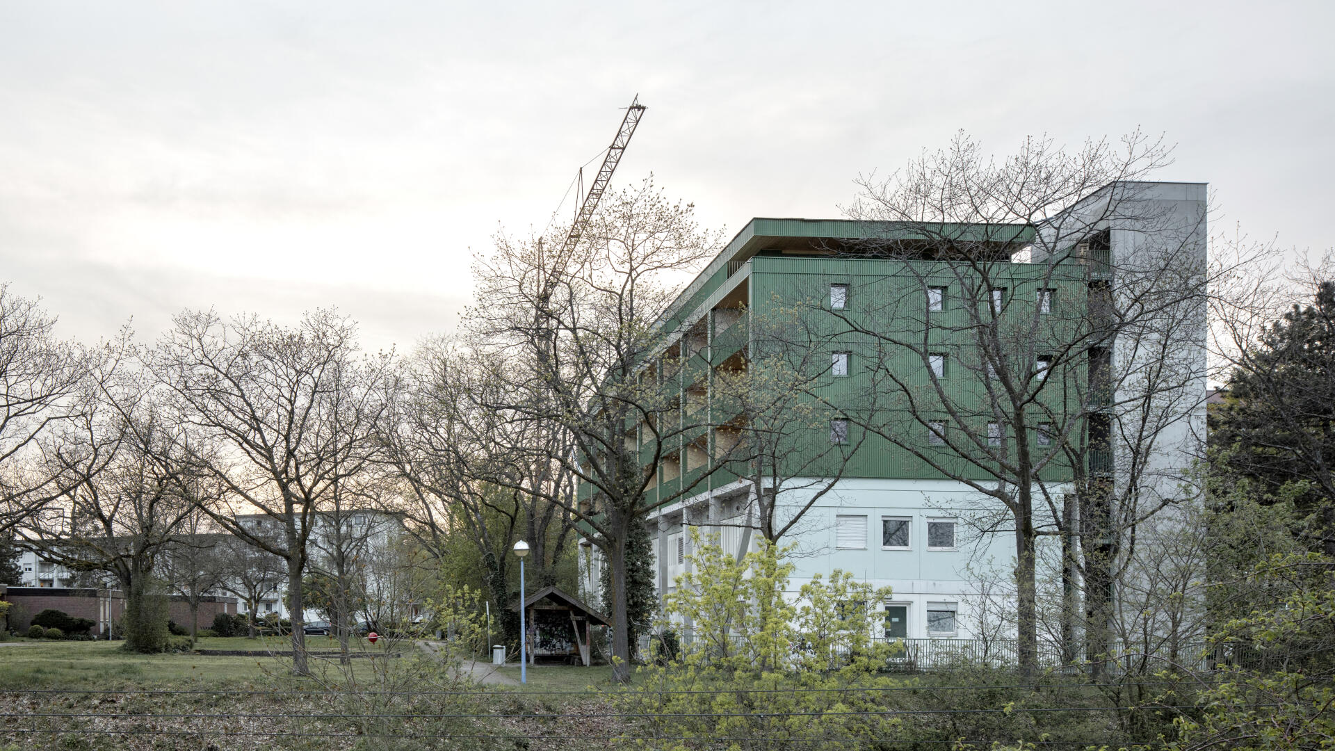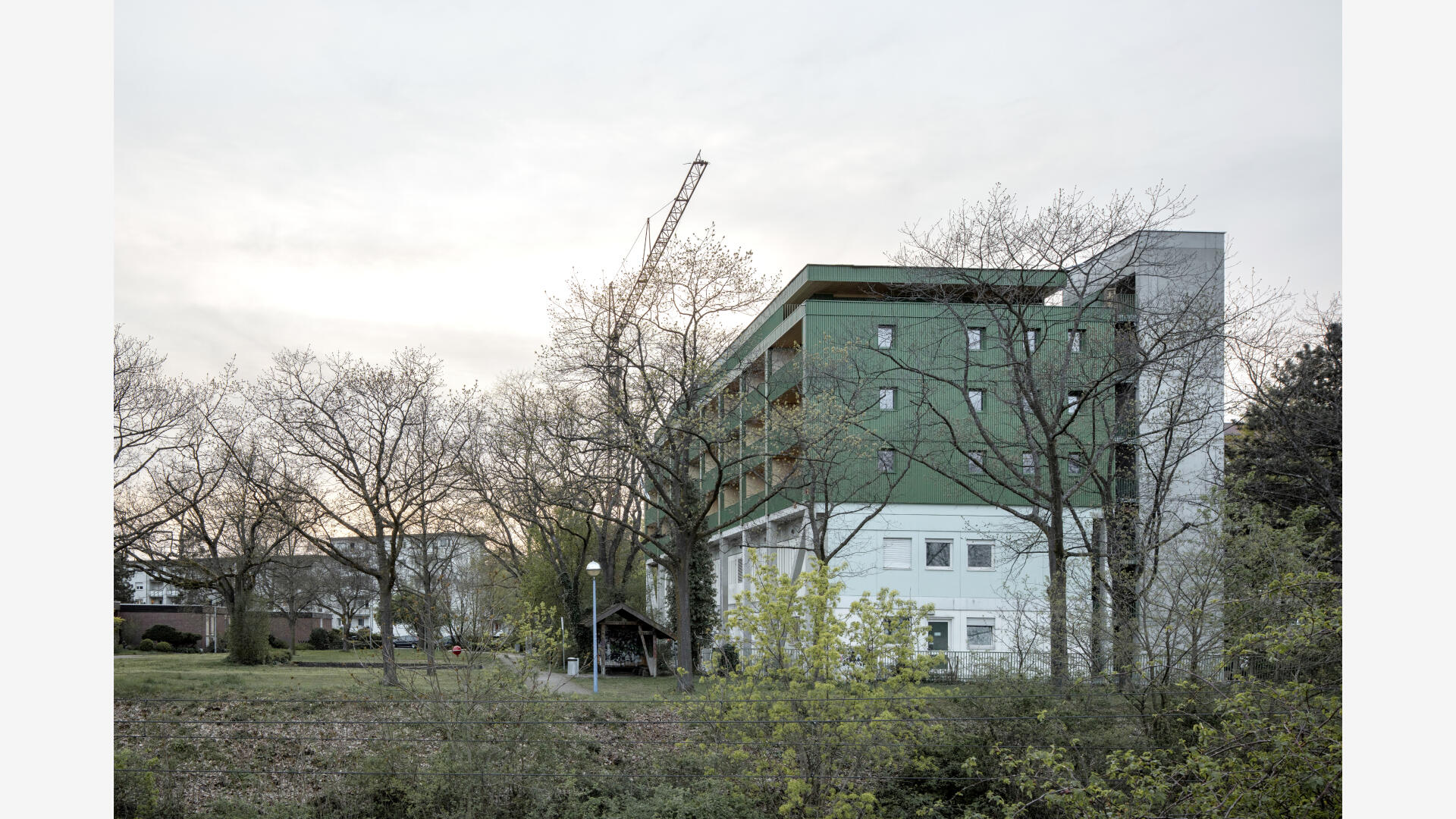Das Wohnhaus NORDGRÜN ist als Aufstockung auf ein altes Betriebsgebäude konzipiert; mit dem Ziel, im Kontext von Nachverdichtung Wohnraum ohne neue Flächenversiegelung zu schaffen. So entstehen 21 helle, flexibel nutzbare Wohnungen in vier Typen zw. 60 und 120 qm, basierend auf dem Raster des Bestandsbaus. Diese werden über einen Laubengang erschlossen, der über zwei außen liegende Treppentürme erreicht wird. Die Einheiten binden bis zur Südseite durch, wo Loggien und Terrassen eine Aussicht bis zum Schwarzwald bieten. Das KFW40-Gebäude mit Massivholzwänden und -decken lagert auf einem „Stahltisch“ um das Bestandsgebäude. Die Fassade aus grünem Trapezblech ist beständig, kostengünstig, sortenrein rückbaubar und gibt dem Gebäude zusammen mit den Staketengeländern eine feingliedrige Haptik.