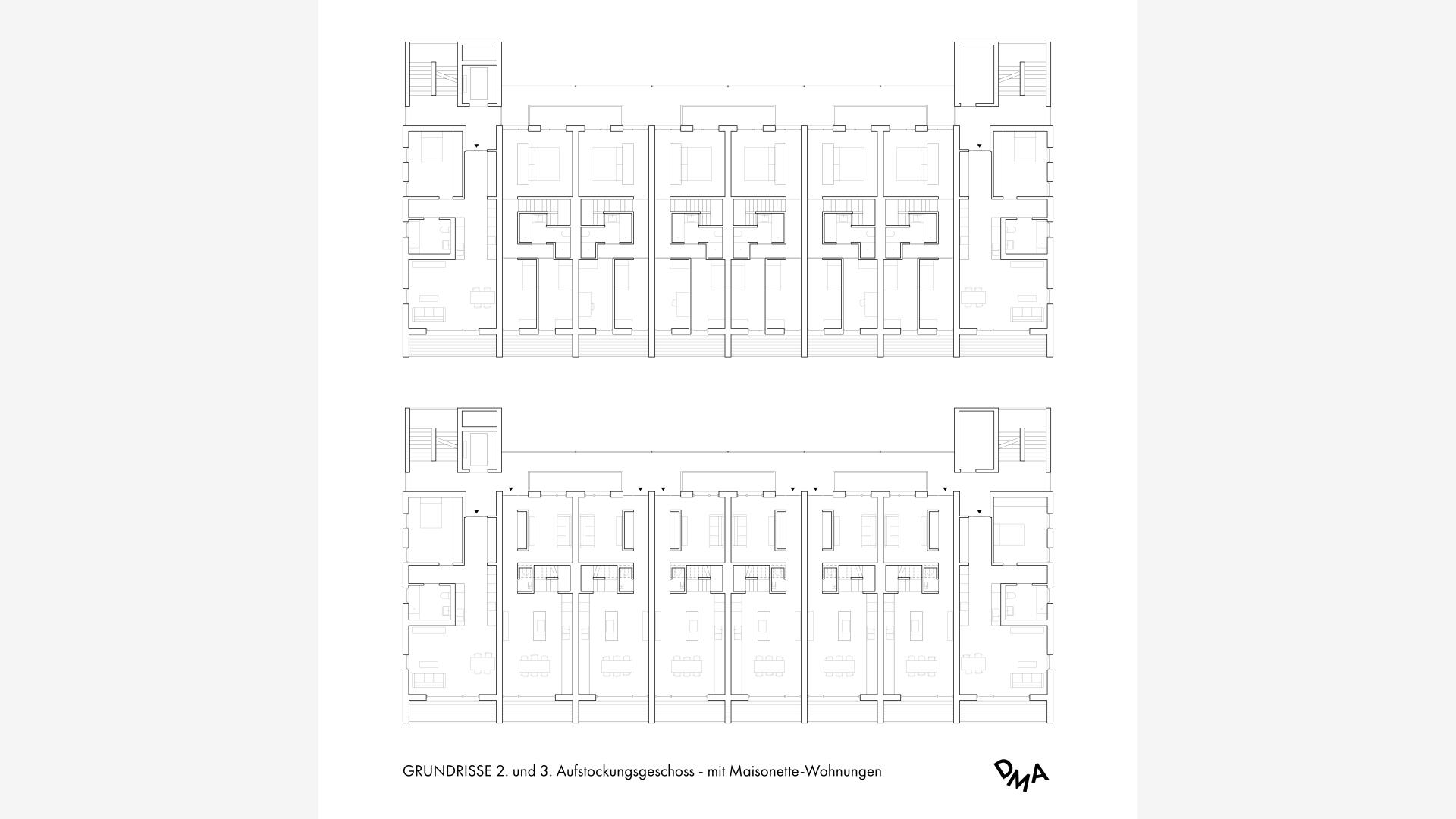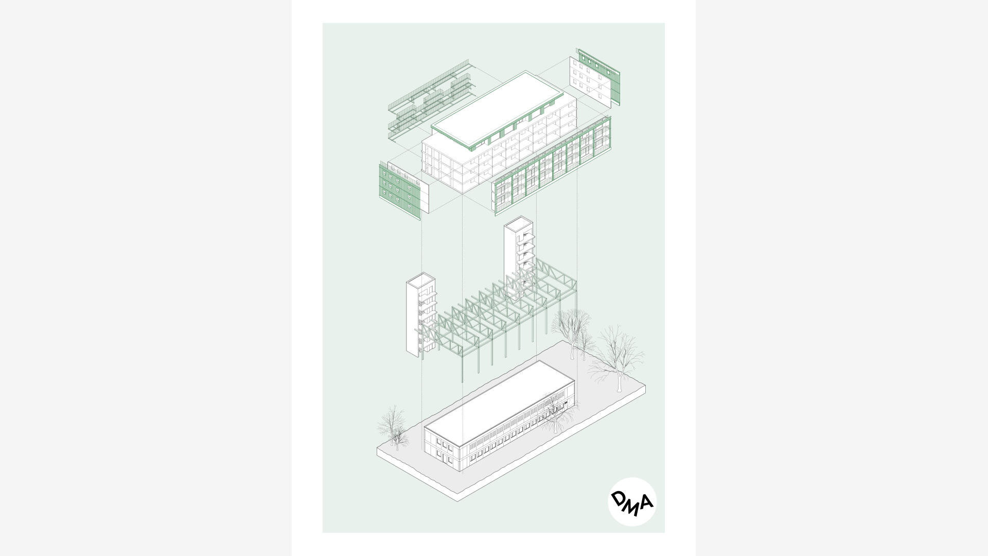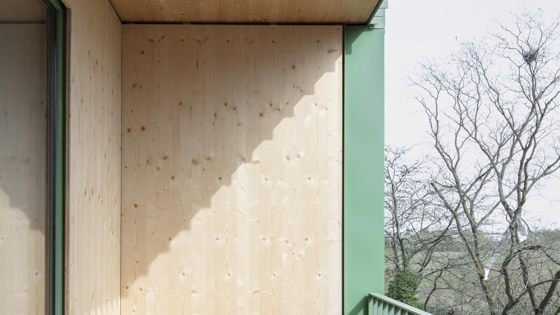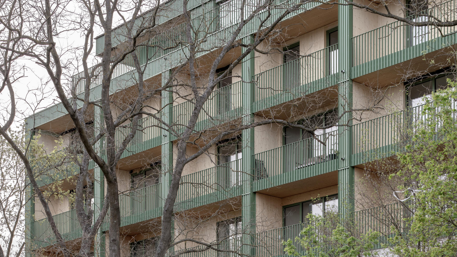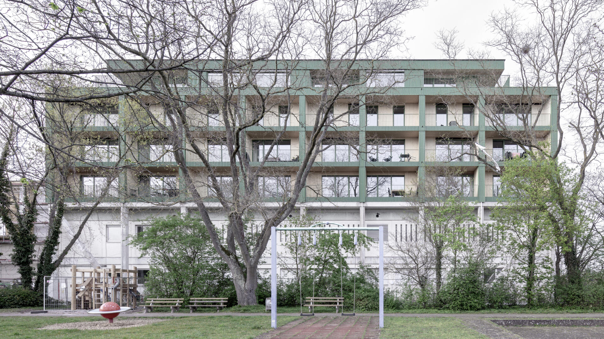 Das Wohnhaus NORDGRÜN ist als Aufstockung auf ein altes Betriebsgebäude konzipiert; mit dem Ziel, im Kontext von Nachverdichtung Wohnraum ohne neue Flächenversiegelung zu schaffen. So entstehen 21 helle, flexibel nutzbare Wohnungen in vier Typen zw. 60 und 120 qm, basierend auf dem Raster des Bestandsbaus. Diese werden über einen Laubengang erschlossen, der über zwei außen liegende Treppentürme erreicht wird. Die Einheiten binden bis zur Südseite durch, wo Loggien und Terrassen eine Aussicht bis zum Schwarzwald bieten. Das KFW40-Gebäude mit Massivholzwänden und -decken lagert auf einem „Stahltisch“ um das Bestandsgebäude. Die Fassade aus grünem Trapezblech ist beständig, kostengünstig, sortenrein rückbaubar und gibt dem Gebäude zusammen mit den Staketengeländern eine feingliedrige Haptik.