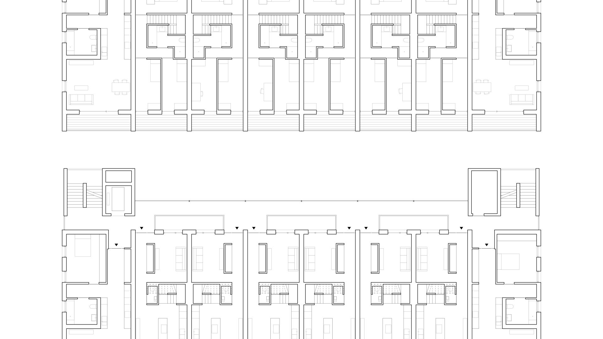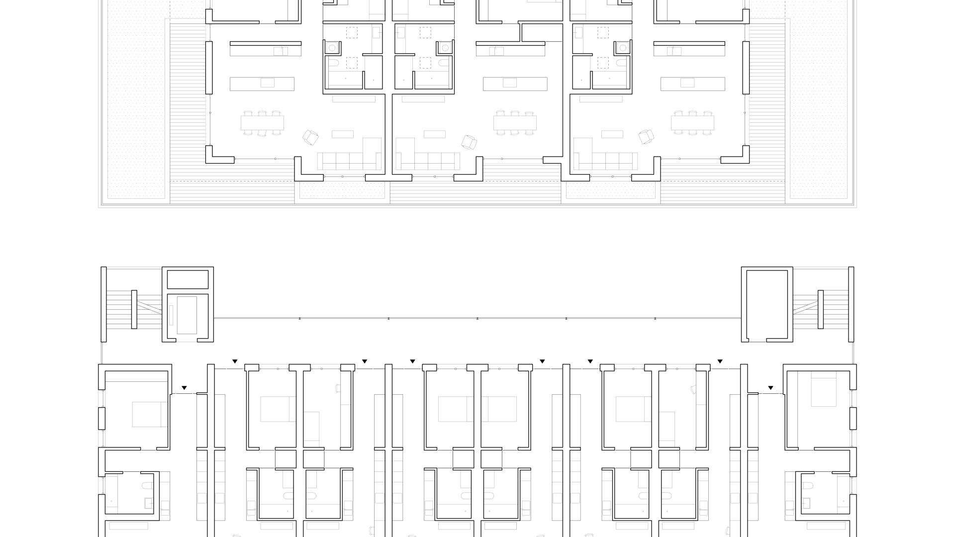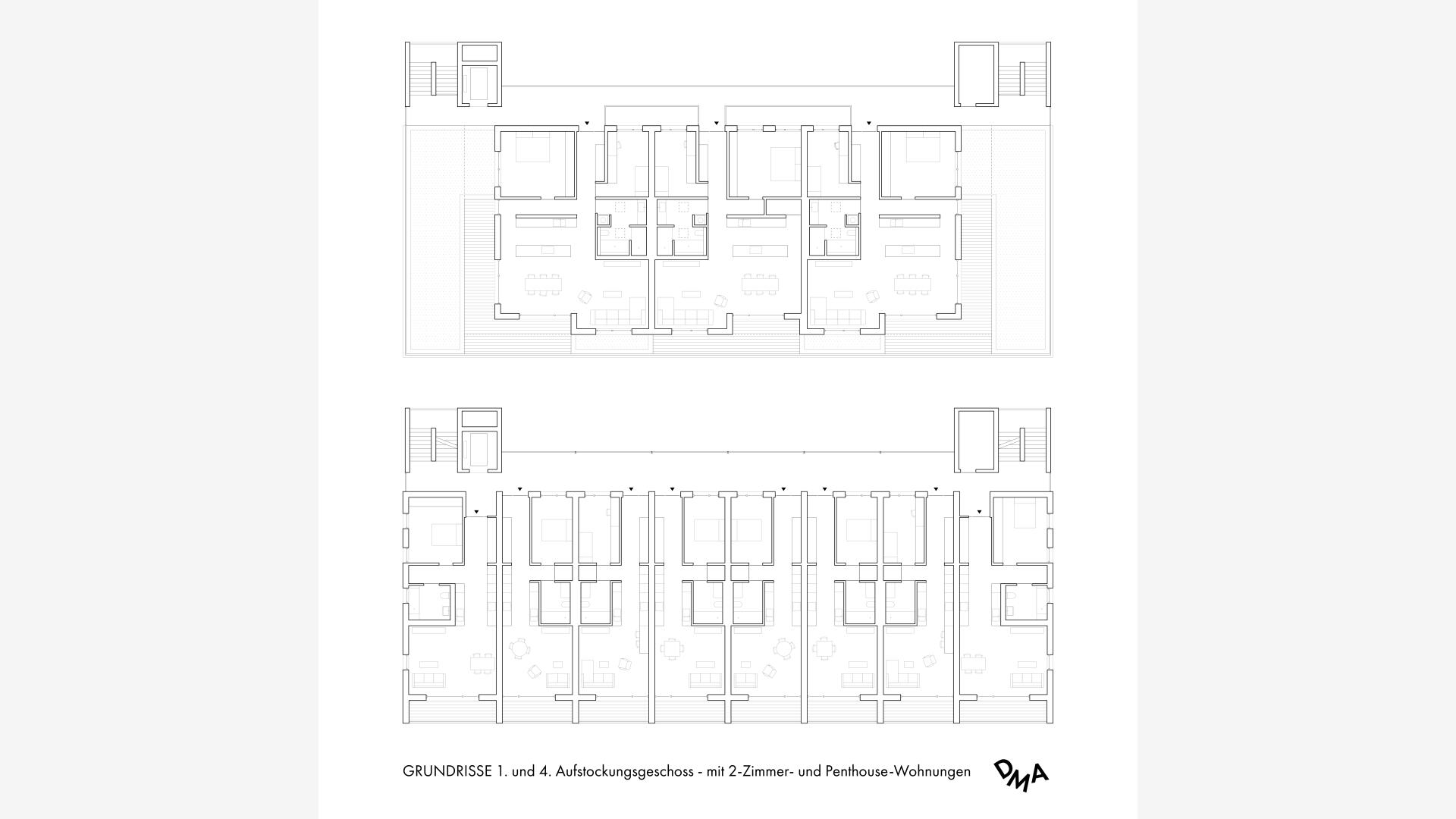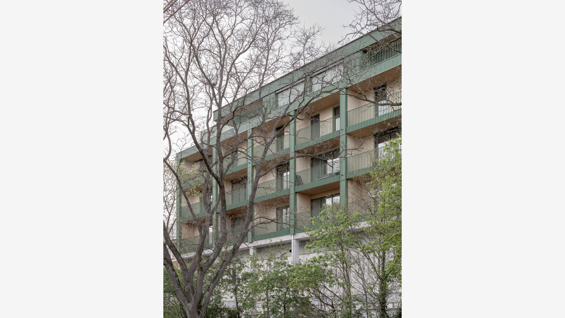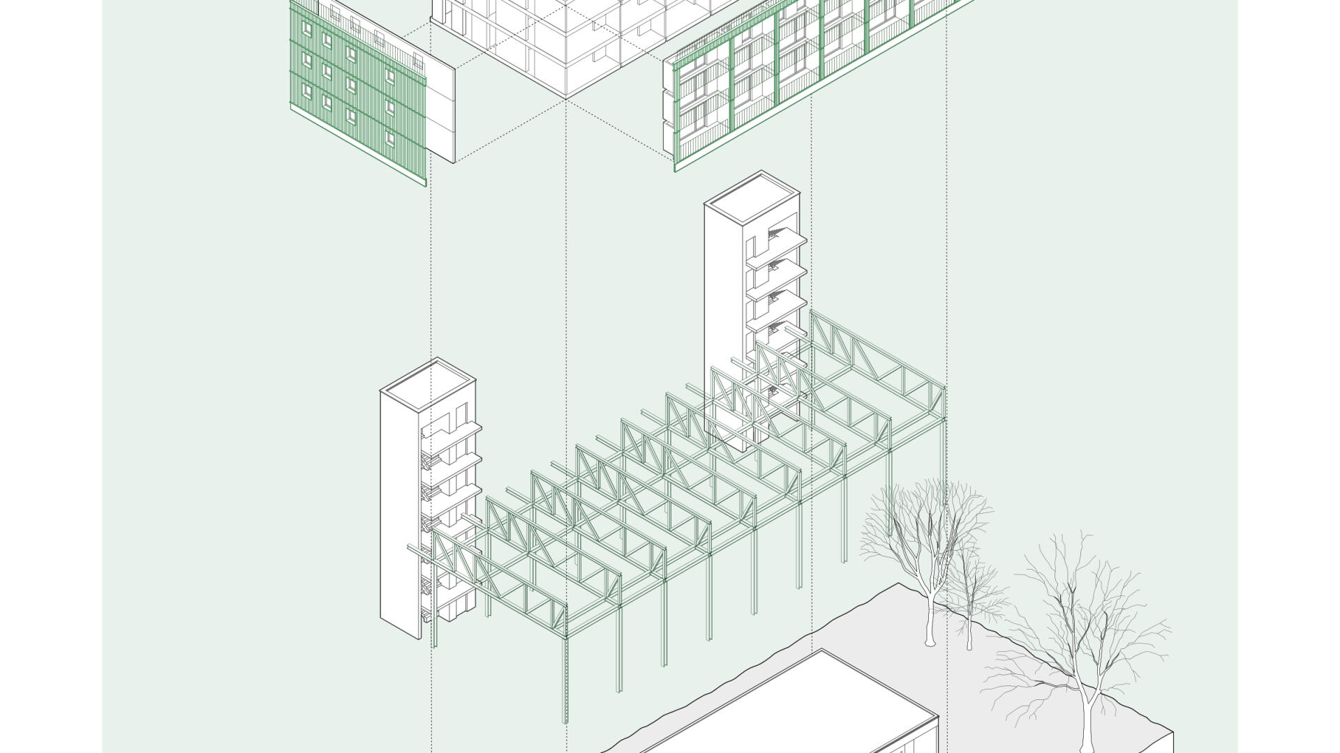 Das Wohnhaus NORDGRÜN ist als Aufstockung auf ein altes Betriebsgebäude konzipiert; mit dem Ziel, im Kontext von Nachverdichtung Wohnraum ohne neue Flächenversiegelung zu schaffen. So entstehen 21 helle, flexibel nutzbare Wohnungen in vier Typen zw. 60 und 120 qm, basierend auf dem Raster des Bestandsbaus. Diese werden über einen Laubengang erschlossen, der über zwei außen liegende Treppentürme erreicht wird. Die Einheiten binden bis zur Südseite durch, wo Loggien und Terrassen eine Aussicht bis zum Schwarzwald bieten. Das KFW40-Gebäude mit Massivholzwänden und -decken lagert auf einem „Stahltisch“ um das Bestandsgebäude. Die Fassade aus grünem Trapezblech ist beständig, kostengünstig, sortenrein rückbaubar und gibt dem Gebäude zusammen mit den Staketengeländern eine feingliedrige Haptik.